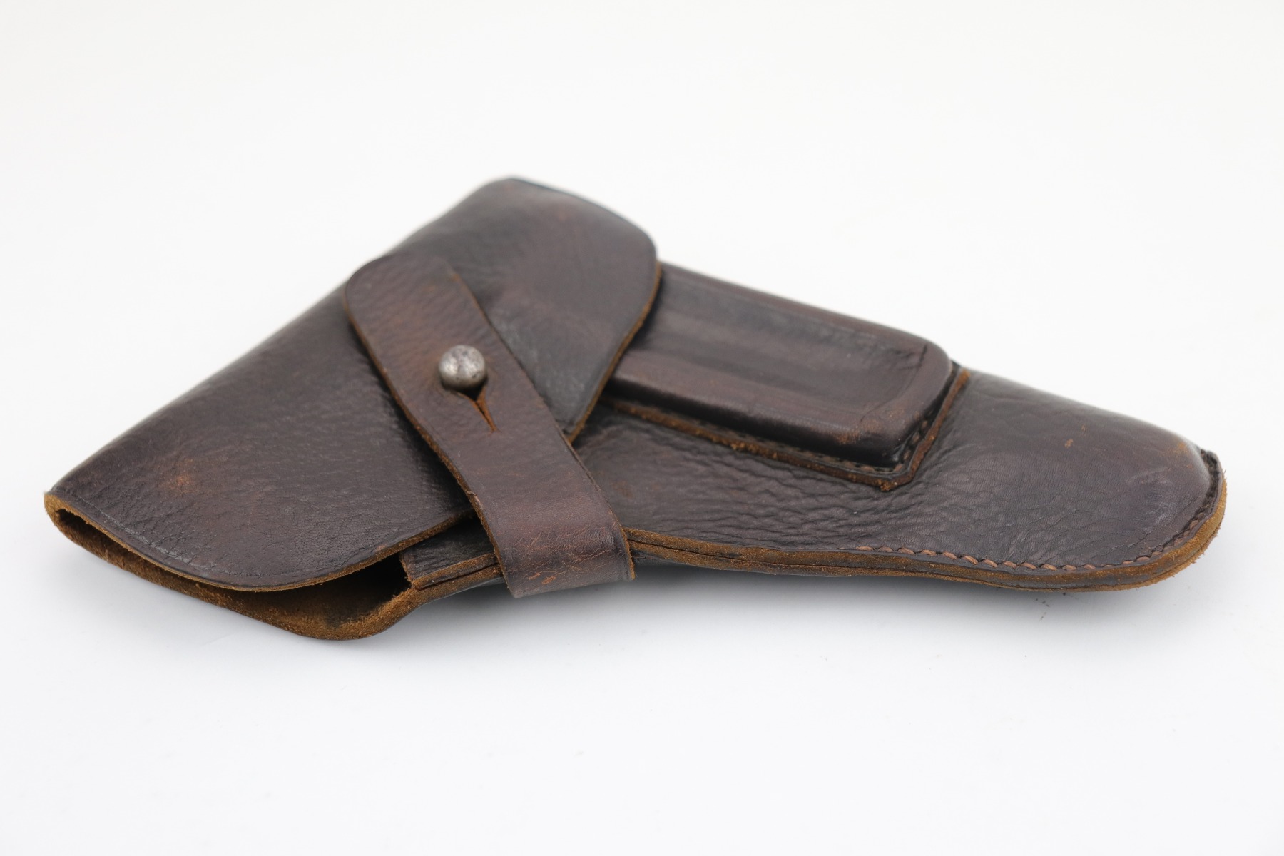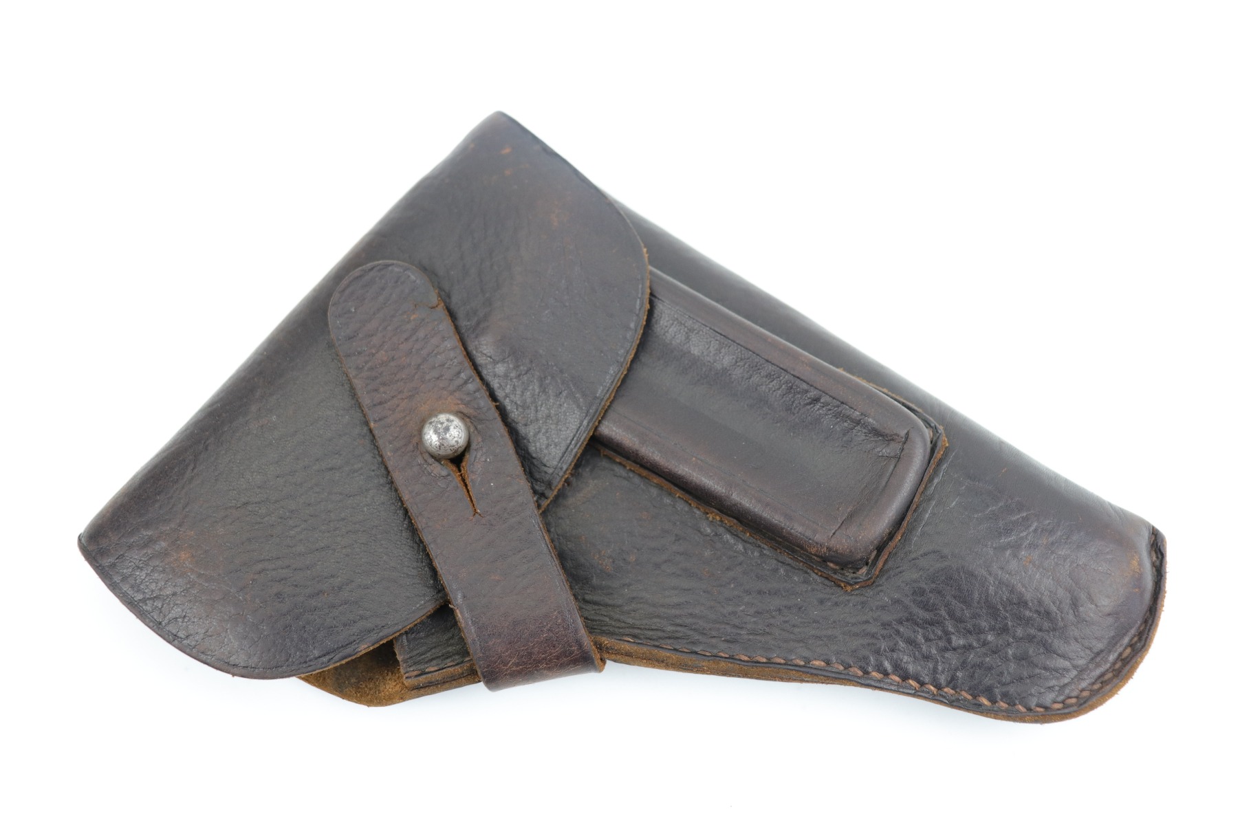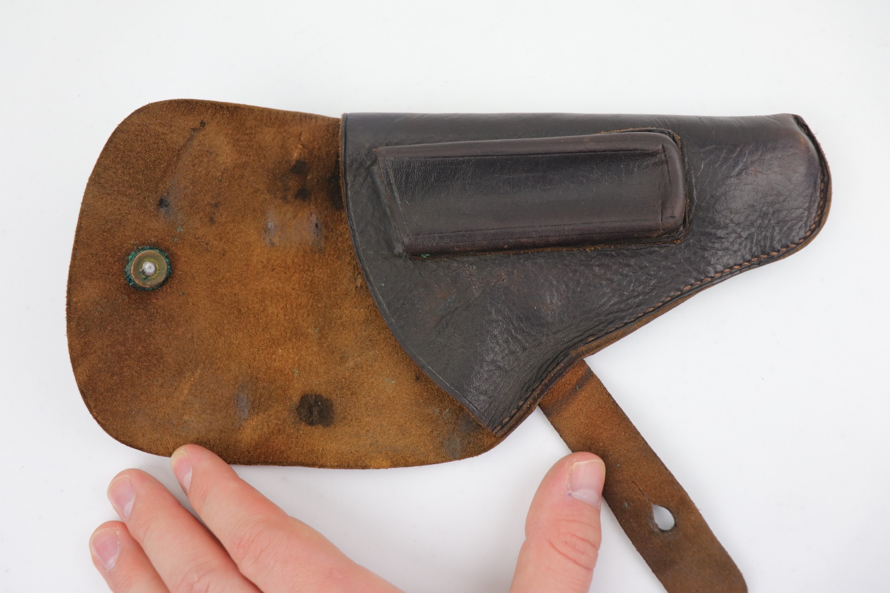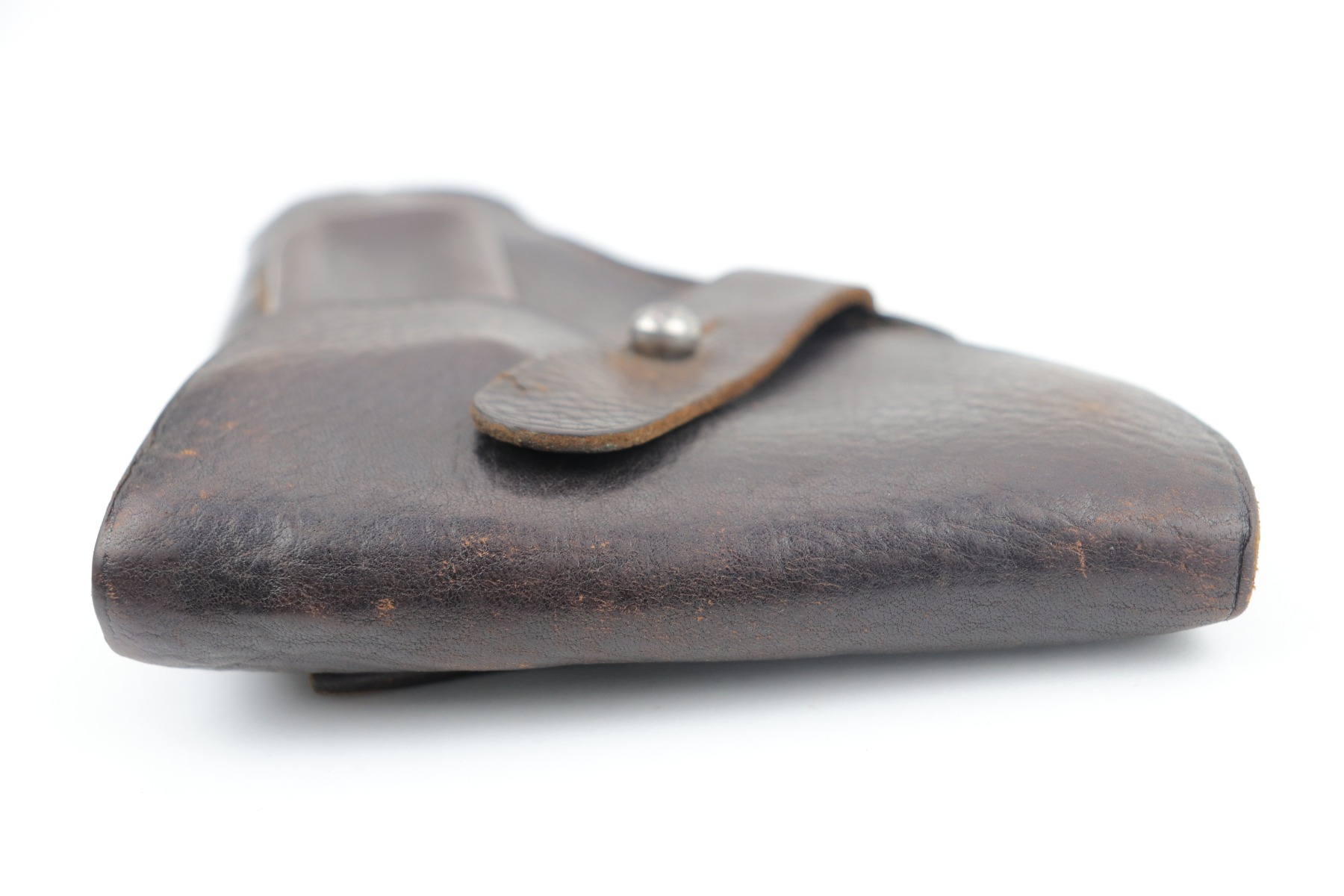 1/19/21 – This is an original and rare WW2 leather AKAH holster for a Kriegsmarine Mauser Model 1934 or an HSC. It is quite rare as it is both AKAH and Kriegsmarine marked under the closure strap. Both markings are faint but visible. Overall, the leather is in excellent condition – soft with light surface marks here and there. Most of the stitching is intact. These holsters are very hard to find.