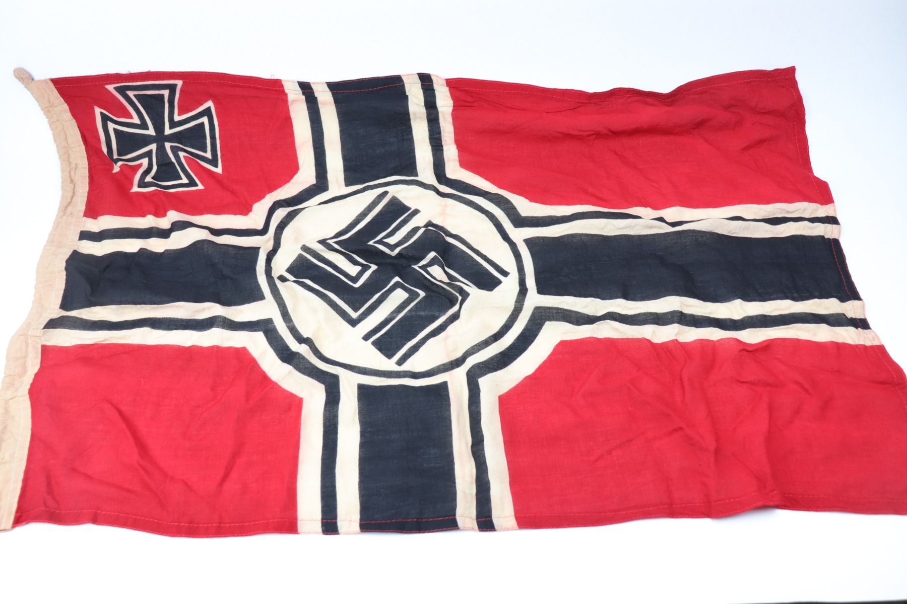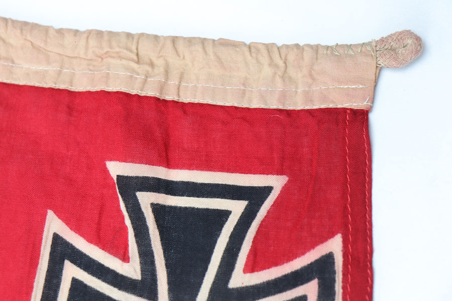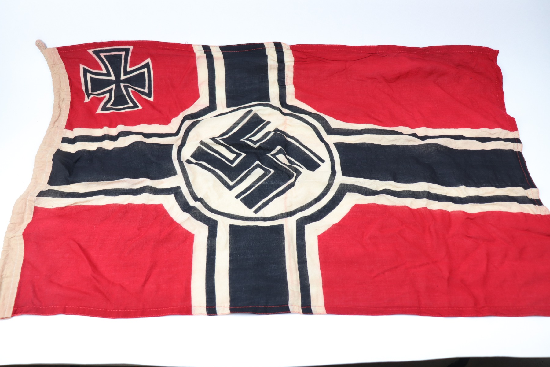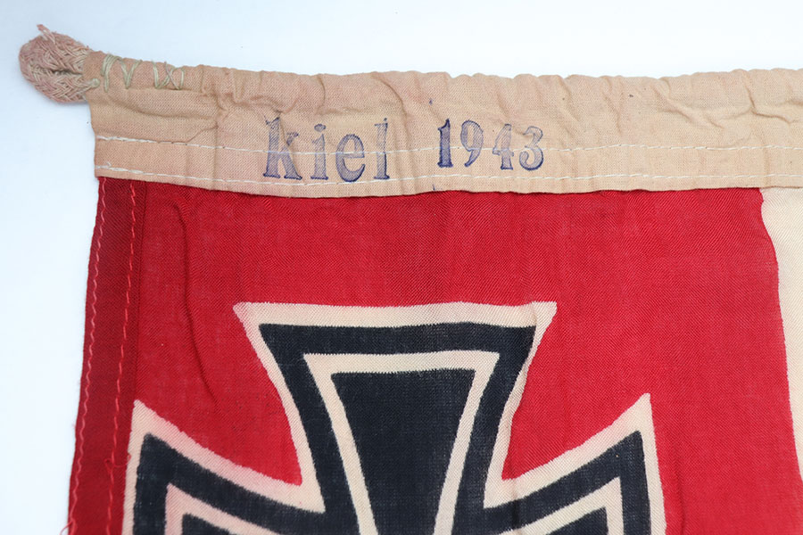 9/10/20 – This is an original WW2 nazi battle flag. The flag measures 34.5 x 21.5 inches. The flag is ink stamped “Kiel 1943”. We consider this a Kriegsmarine battle flag because Kiel was one of the major naval bases and shipbuilding centers of the German military. Original hanging string still in tact. There is some red staining on the white finished areas of the flag, but otherwise in excellent condition.