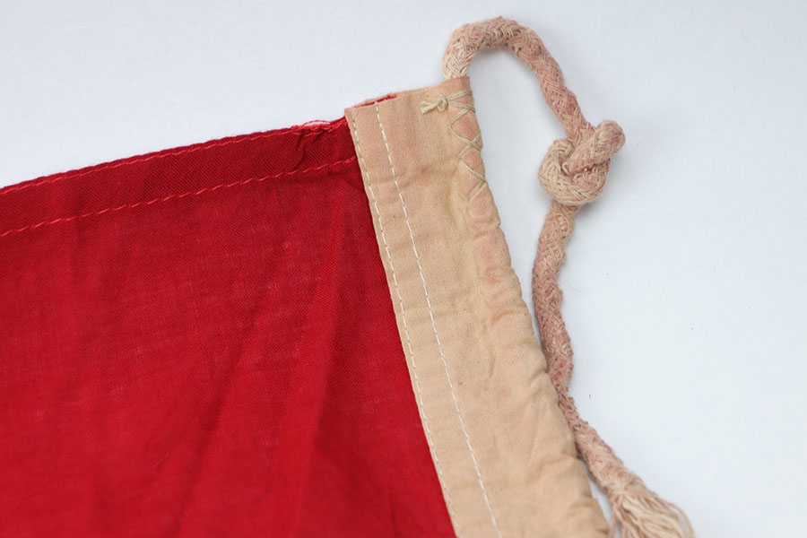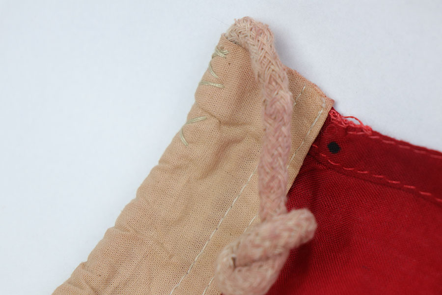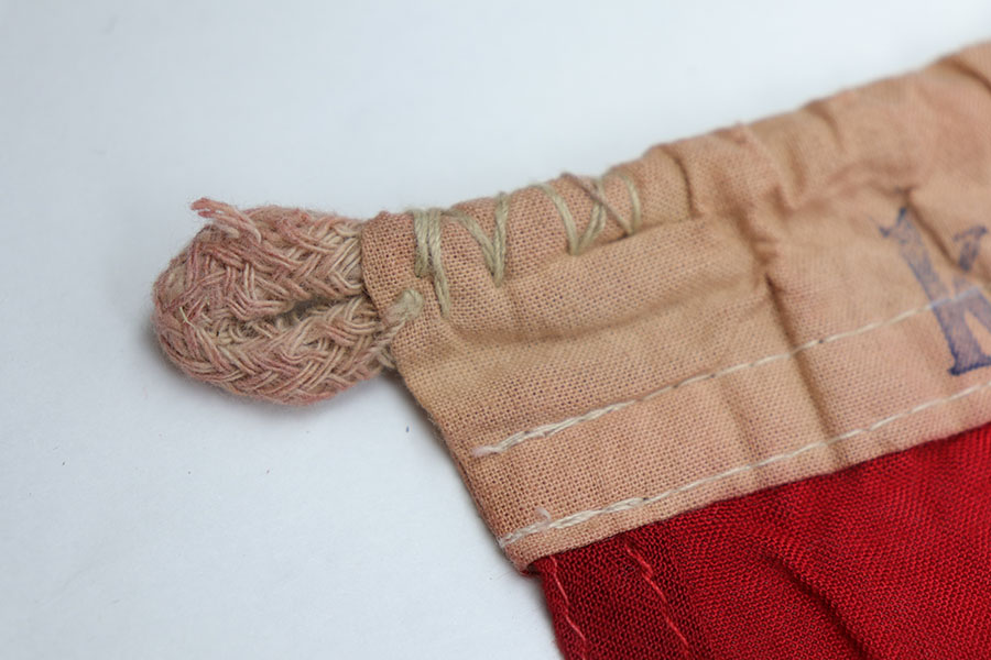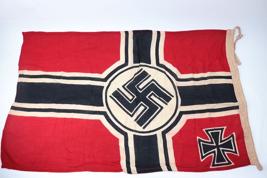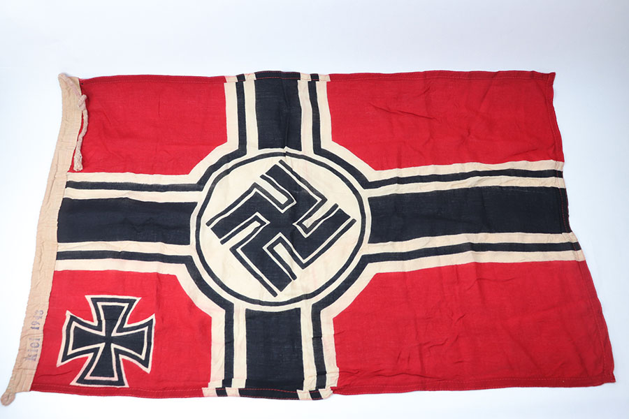 9/10/20 – This is an original WW2 nazi battle flag. The flag measures 34.5 x 21.5 inches. The flag is ink stamped “Kiel 1943”. We consider this a Kriegsmarine battle flag because Kiel was one of the major naval bases and shipbuilding centers of the German military. Original hanging string still in tact. There is some red staining on the white finished areas of the flag, but otherwise in excellent condition.