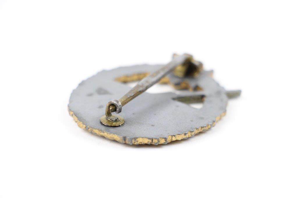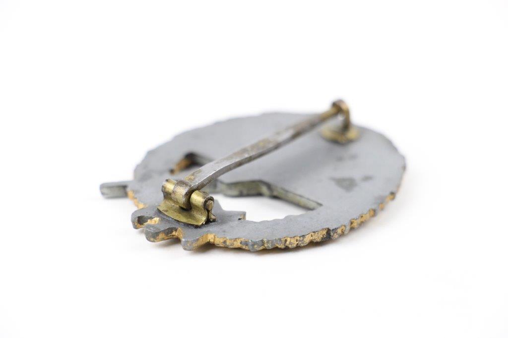 3/6/24 – This is an original wartime production German Coastal Artillery Badge by Forester & Barth. The badge is non-magnetic zinc with a magnetic, original closure clasp that’s in great condition. The badge shows honest high edge wear throughout the wreath, with a considerable amount of gold wash finish still present throughout. This example has just the right amount of surface wear which is unquestionably original. Great detail throughout and no major issues. The backside is unmarked, with a setup that is attributable to Forester & Barth. (Verified by experts.) Comes with a nice plastic display case, as shown.