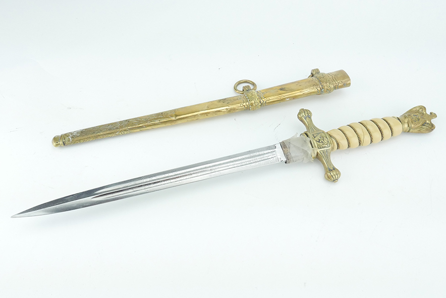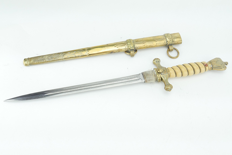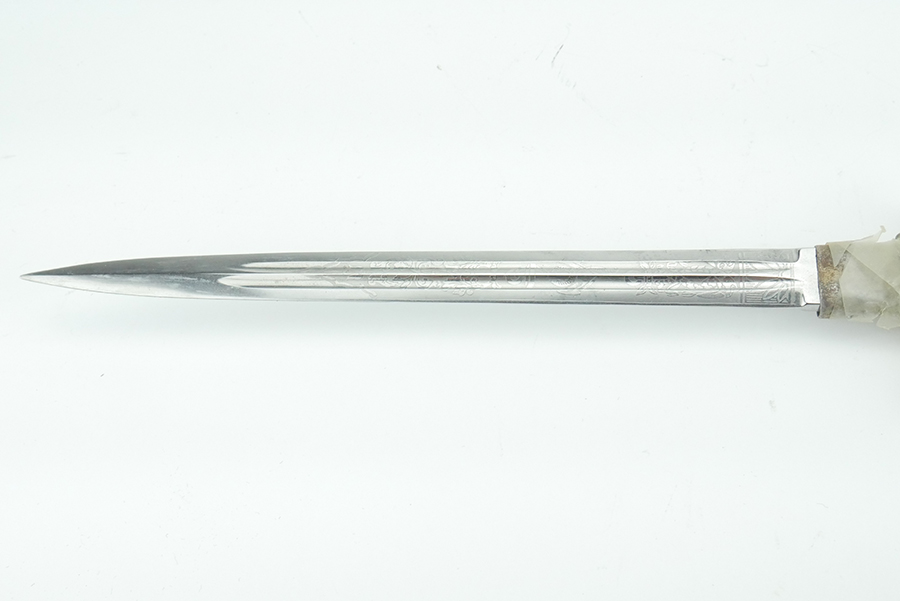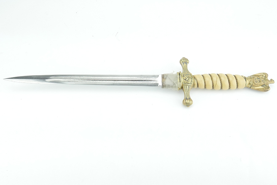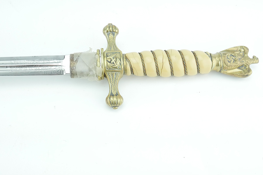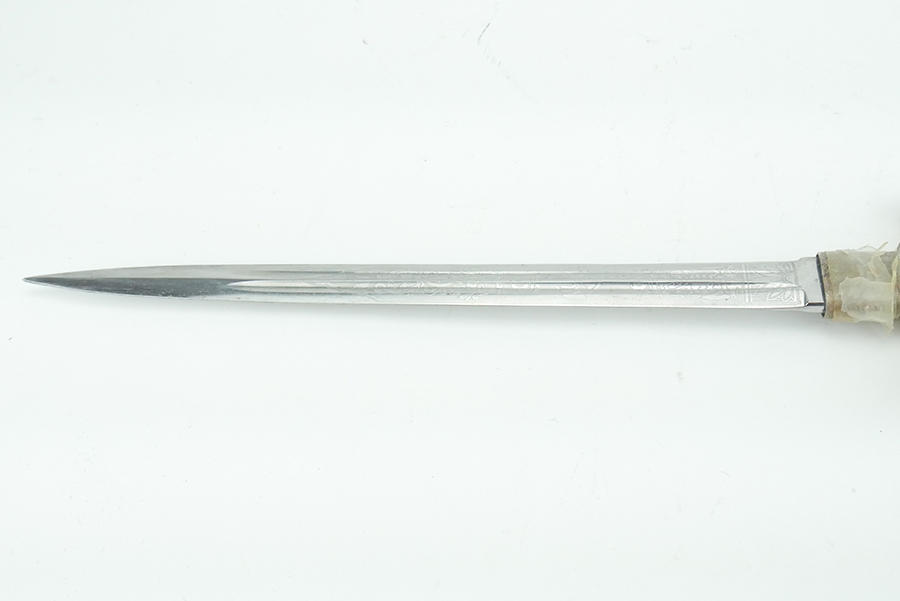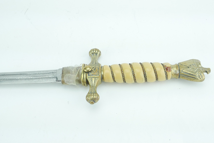 9/3/24 – This is a good example of a Kriegsmarine dagger from ww2. The blade on this dagger is in beautiful condition, and has no oxidation. The etched naval themed motifs are still present and are strong. The blade maintains it’s original edge, and has no signs of ever being sharpened. The handle of this dagger does have cracks throughout, but is still intact. There is only one small part of the handle missing on the backside towards the pommel. The grip still has it’s original wire wrap. The scabbard for this dagger is missing two of the screws that keep the top of the scabbard bushing secured. The scabbard additionally has a few small dents, but nothing that effects the functionality of the scabbard.