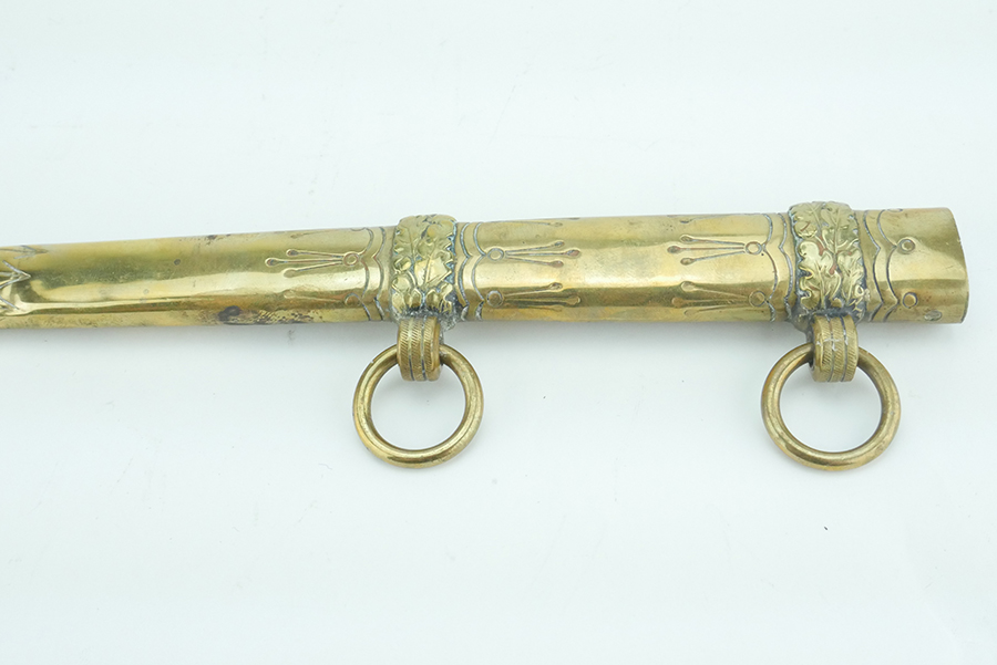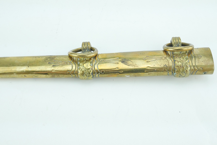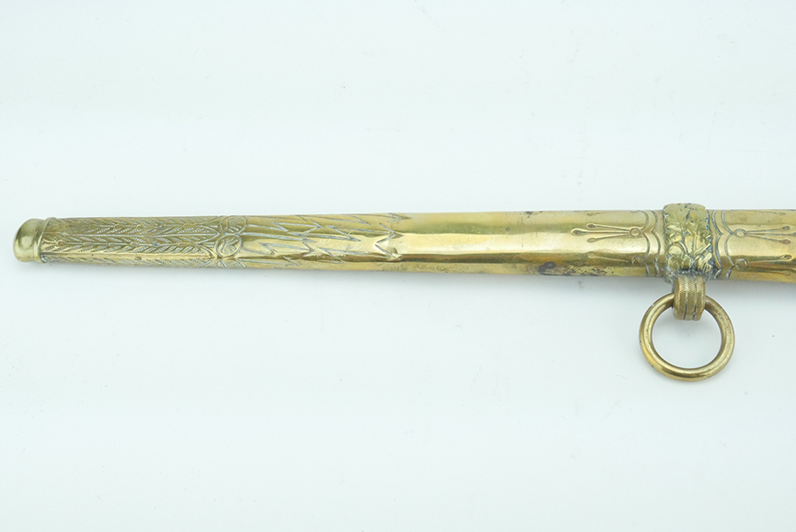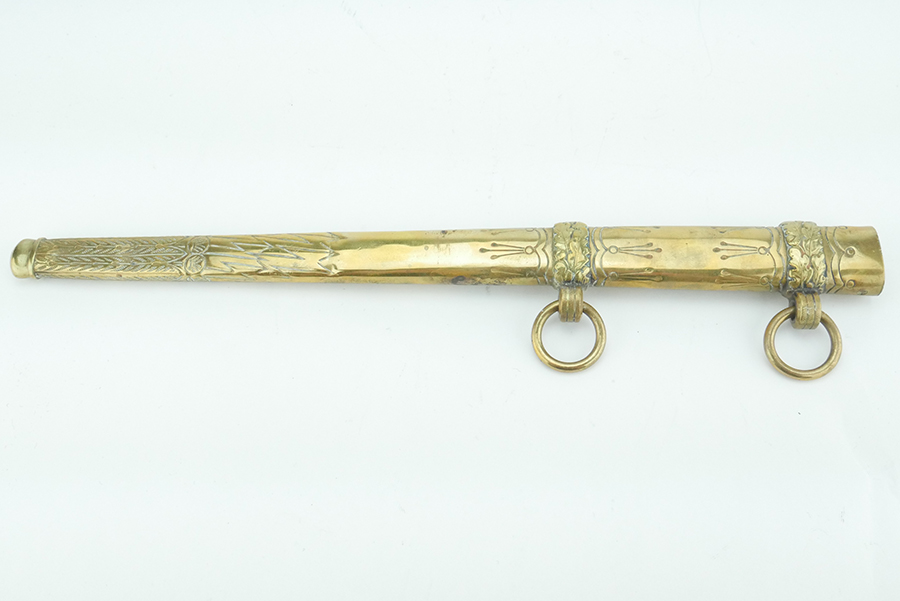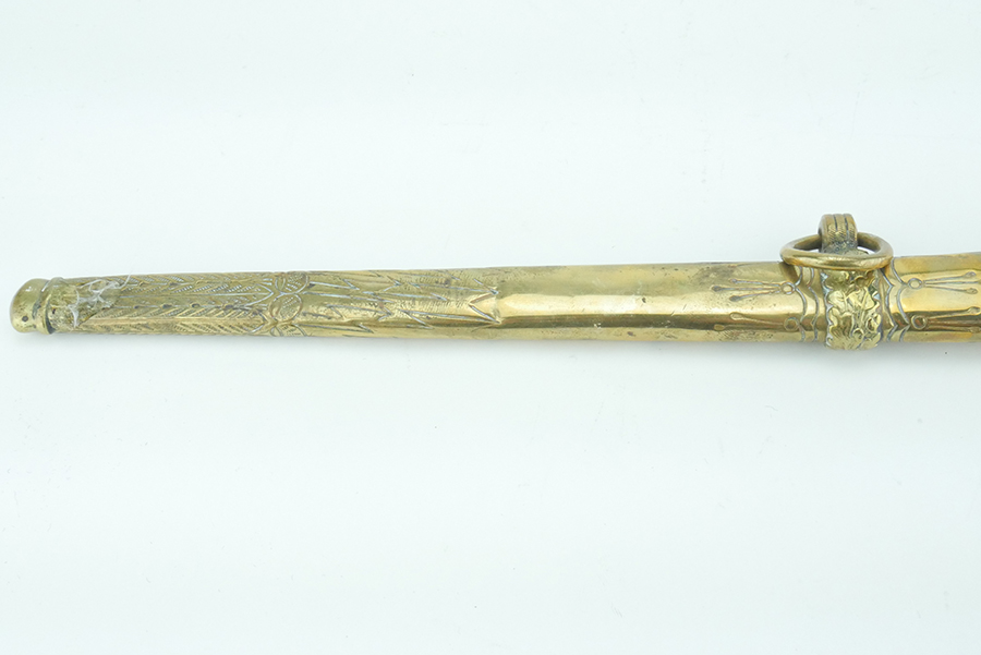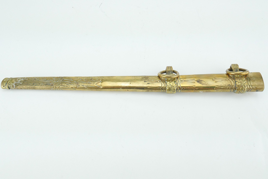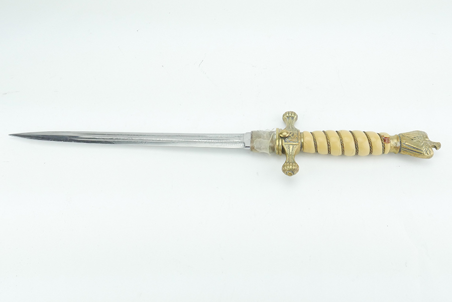 9/3/24 – This is a good example of a Kriegsmarine dagger from ww2. The blade on this dagger is in beautiful condition, and has no oxidation. The etched naval themed motifs are still present and are strong. The blade maintains it’s original edge, and has no signs of ever being sharpened. The handle of this dagger does have cracks throughout, but is still intact. There is only one small part of the handle missing on the backside towards the pommel. The grip still has it’s original wire wrap. The scabbard for this dagger is missing two of the screws that keep the top of the scabbard bushing secured. The scabbard additionally has a few small dents, but nothing that effects the functionality of the scabbard.
