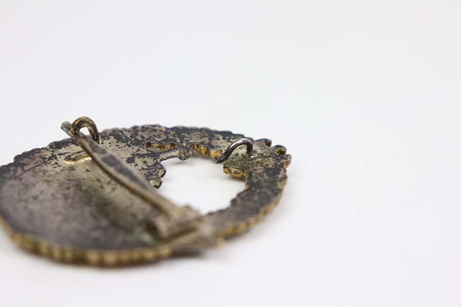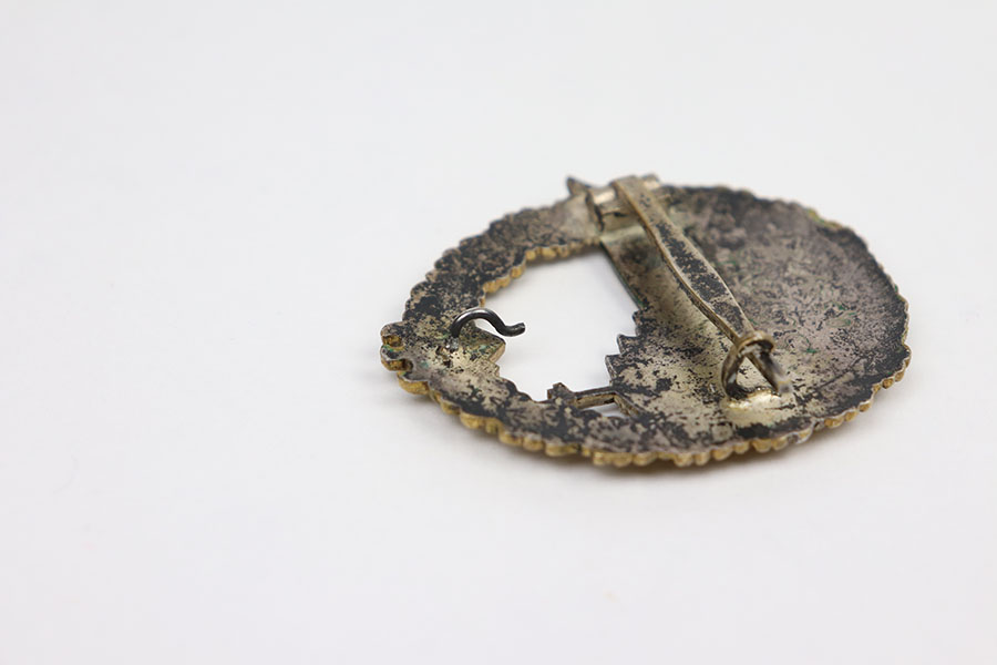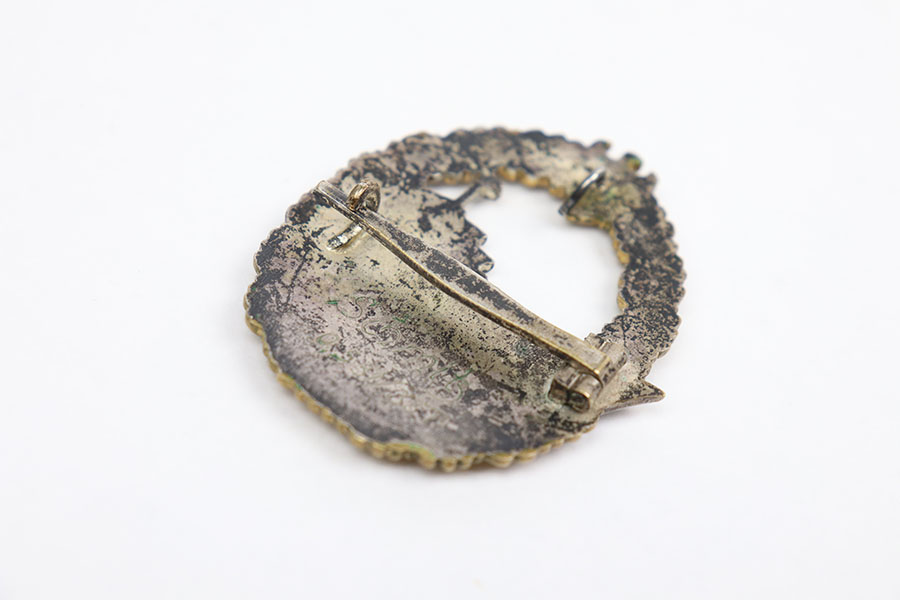 3/31/21 – This is an original WW2 Kriegsmarine Destroyer badge. The badge is one piece construction with a battleship on the front surrounded by a typical wreath and a droop winged eagle at the top. There is some mild patina throughout but the coloring is nice overall. The lapel hook (pin at the top) on the reverse is very loose and fragile, yet still attached. The horizontal closure pin is in great condition with no notable issues. No maker markings as shown. There is a faint scratch of a name and number under the horizontal closure clasp, appears to be “Schmit” and underneath “0531/387”.