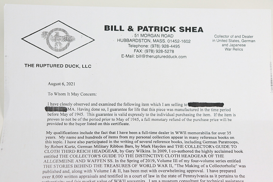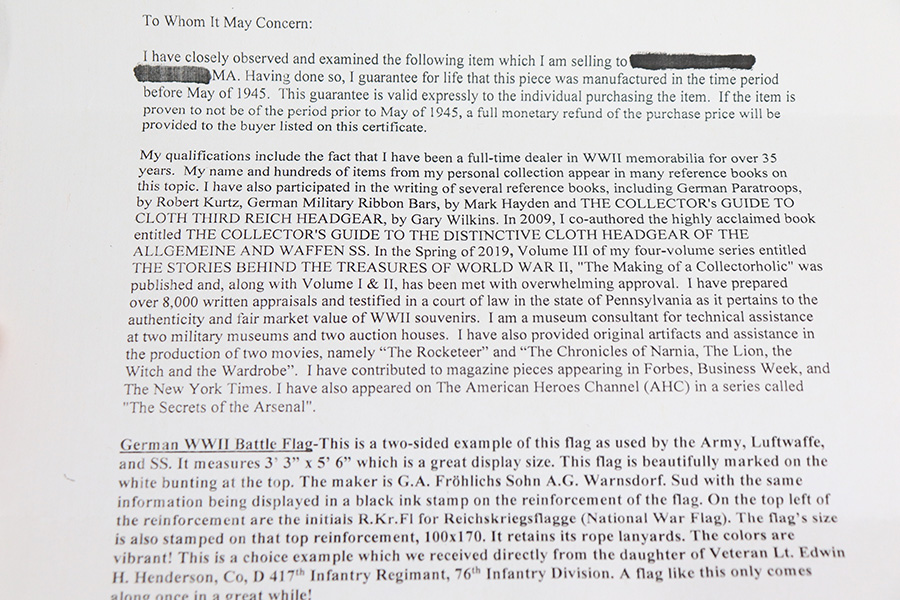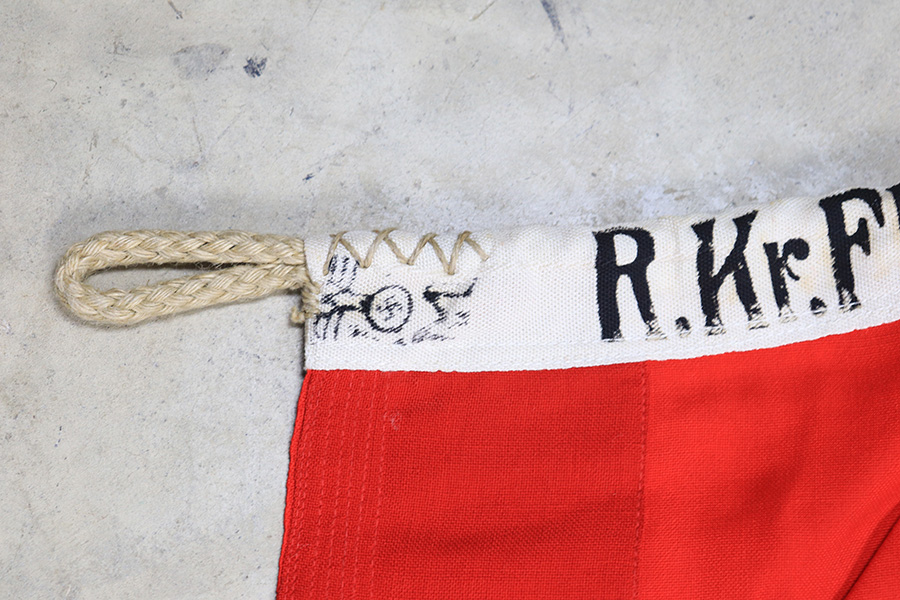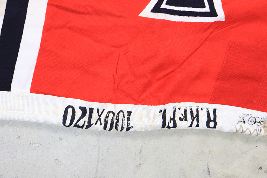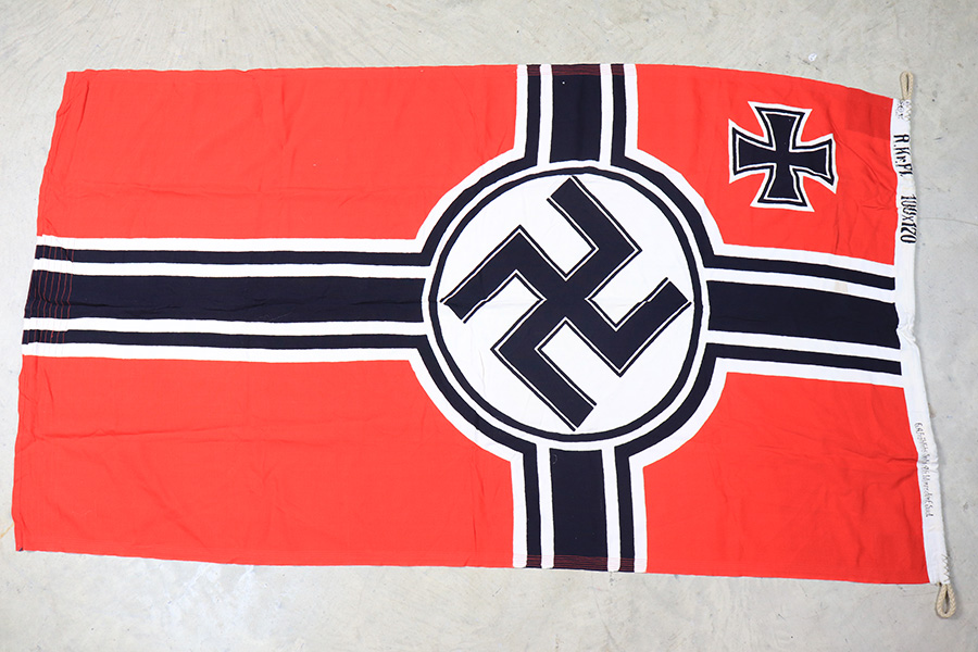 12/1/21 – This is an original Kriegsmarine banner flag from WW2. The flag comes with a copy of a letter of authenticity from the Ruptured Duck. The flag is an excellent, two-sided example measuring 100x170cm. Ink stamped and marked on the white bunting at the top of the flag. Original rope still in tact. Vibrant colors throughout. Said to have been brought back to the United States by lt. Edwin H. Henderson, Co, D 417th Infantry Regiment, 76th Infantry Division.
