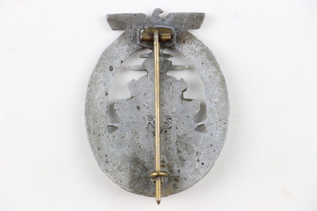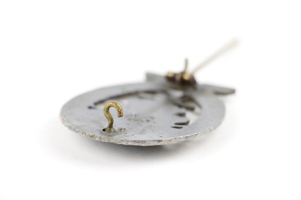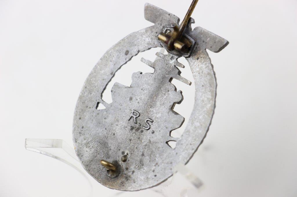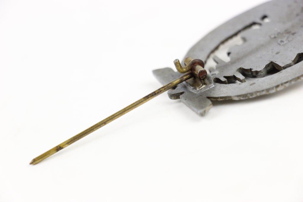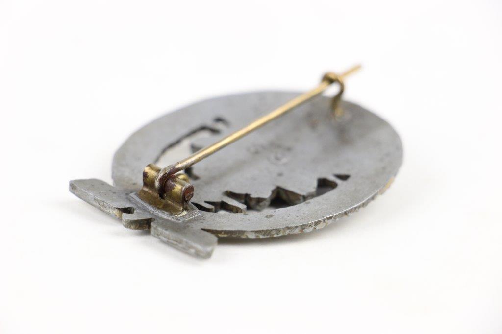 7/7/24 – This is an original Kriegsmarine High Seas Fleet Badge by Rudolf Souval. The badge is one-piece die-struck zinc with gold gilded finish around the outer wreath and eagle. This finish has mostly worn away, with traces found within the grooves of the wreath and Eagle’s wings. Great details throughout and most of the wear is honest surface patina. The reverse is “R.S.” maker stamped, and has the correct style pin, hook, and hinge. The hook is soldered tombac (non-magnetic), while the round wire needle pin and steel barrel hinge are magnetic. Measures about 55mm tall and 44mm wide. Though worn, this is a textbook example.