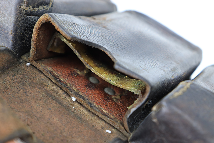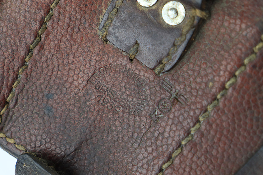 8/16/23 – This is an original 1939 dated K98 leather ammo pouch from WW2. This example is rare because of the Kriegsmarine eagle/M stamp on the back leather, next to the maker stamp. The maker and date stamp are clearly visible. Great overall condition with some mild surface wear and light aging throughout. Normal pliability. No stitching issues.