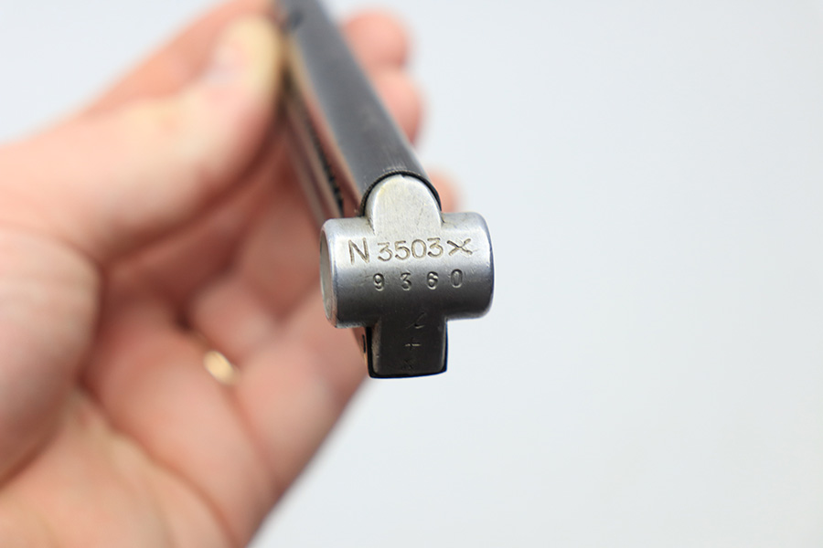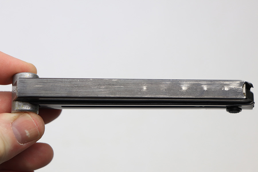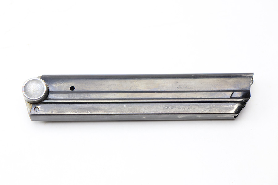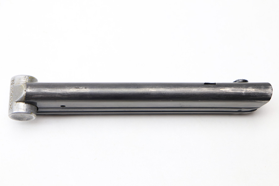 2/18/22 – This is an original Kriegsmarine Luger magazine from WW2. The magazine has a blued tube that’s in great condition with no rust or pitting. There’s some very mild finish loss in a few areas. The base is aluminum and serial numbered with a “+” sign and eagle 63 Mauser proof stamp. Above the serial number is a Kriegsmarine property stamp. The spring is strong and functional.