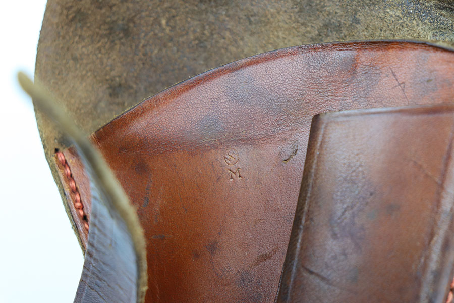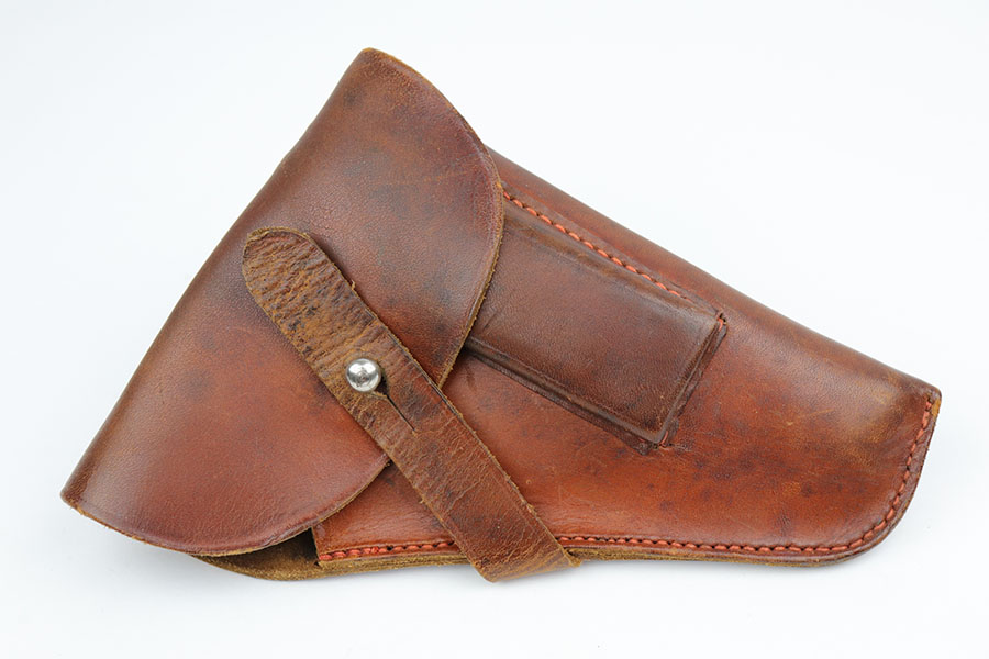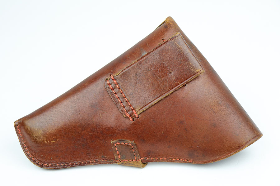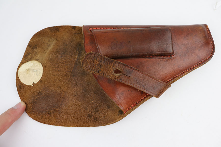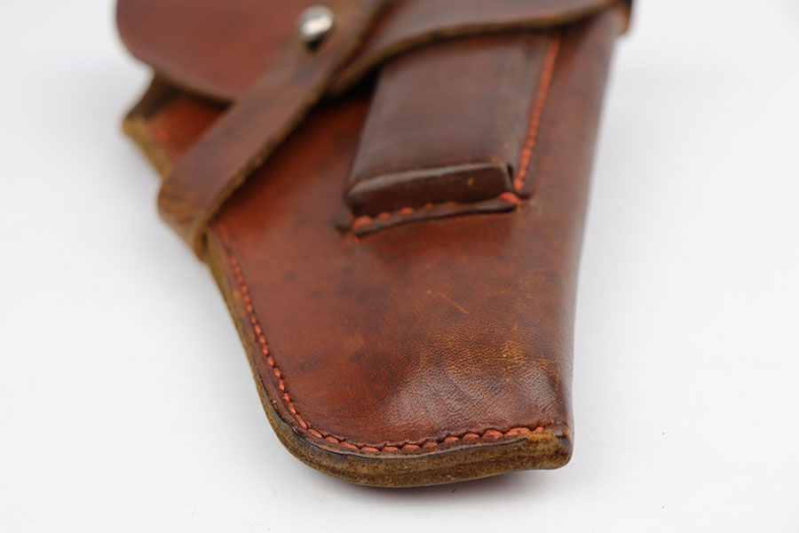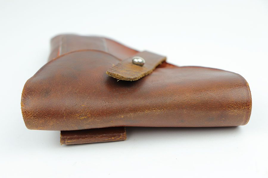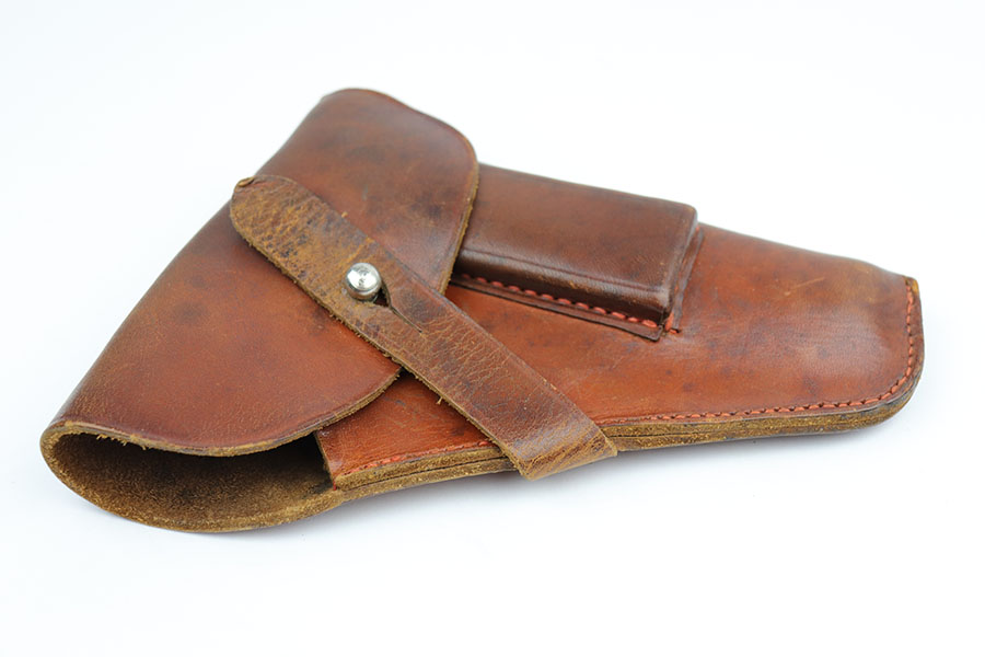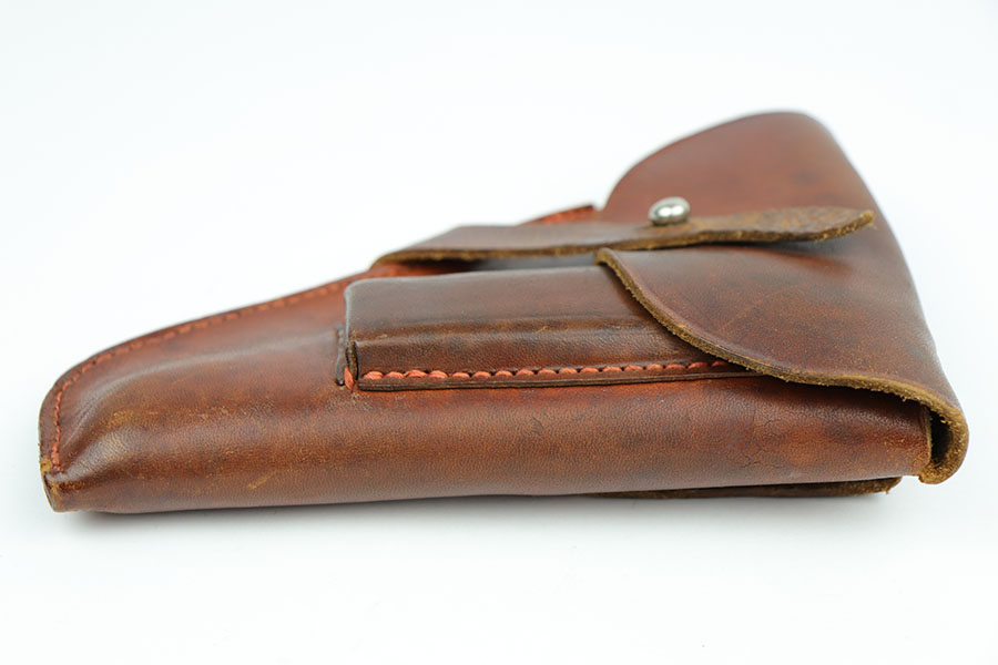 10/29/19 – This is an original WW2 production German navy – Kriegsmarine – holster. Suitable for either the model 1934 or model HSc. The holster is stamped on the front leather with an eagle/M. There are no other stamps or markings. The interior leather shows a white button cover. I believe this is original. The leather is in good condition overall with some normal / minor surface wear. All original stitching in tact.