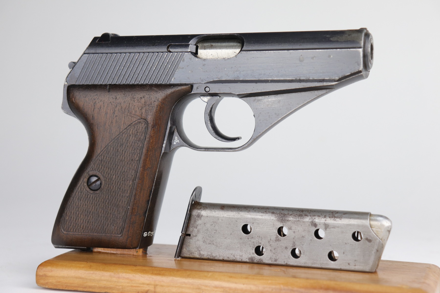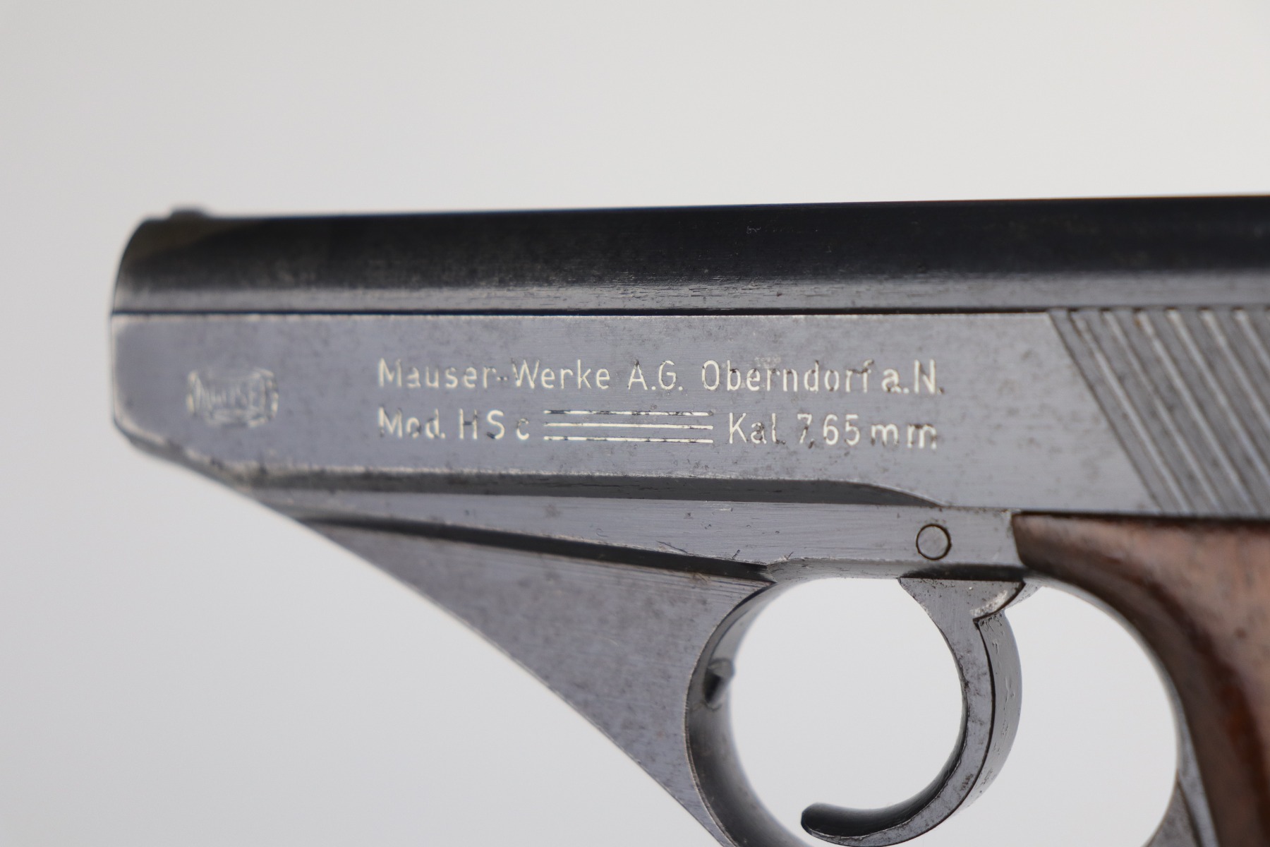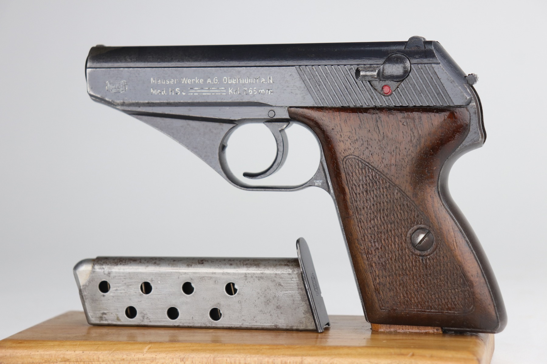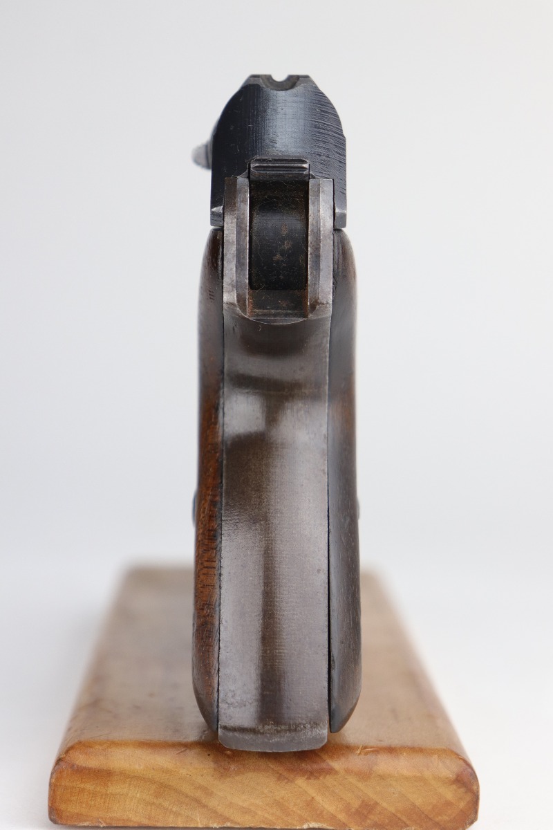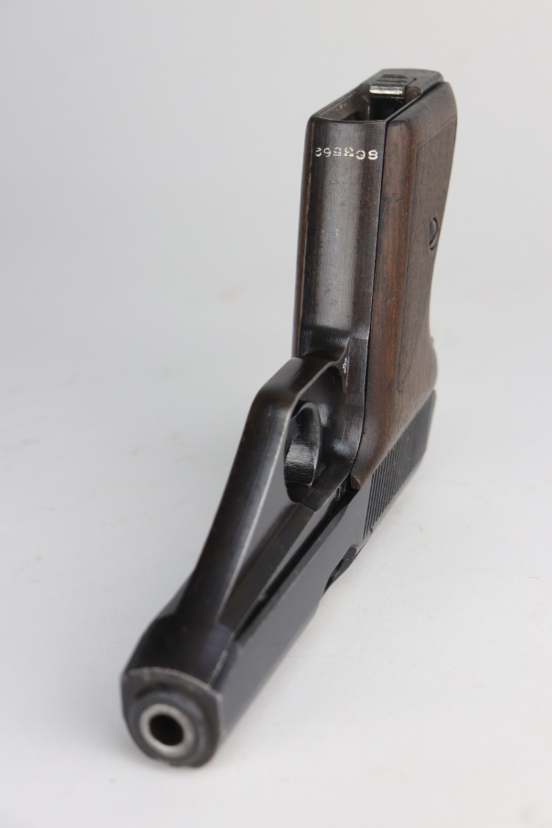 9/11/20 – This is a very nice example of a Mauser HSC issued to the Nazi Kriegsmarine in 1943. It is of the 4th variation, characterized by the “Eagle M III/3” marking on the web of the trigger guard. Only 4,500 of this particular variation were made. This gun has retained about 90% of its original finish. The most noticeable signs of wear are areas of discoloration around the muzzle and splotchy discoloration on the top and right side of the slide. There is spotty oxidation on the gun throughout. There is minor thinning on straps where there is some dark brown patina showing through. The bore is excellent – shiny with strong rifling. Excellent original grips and comes with one period-correct magazine.