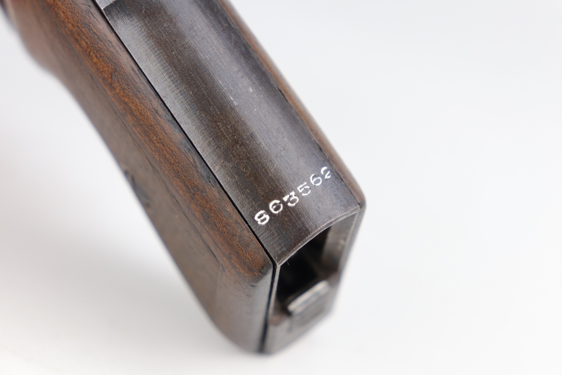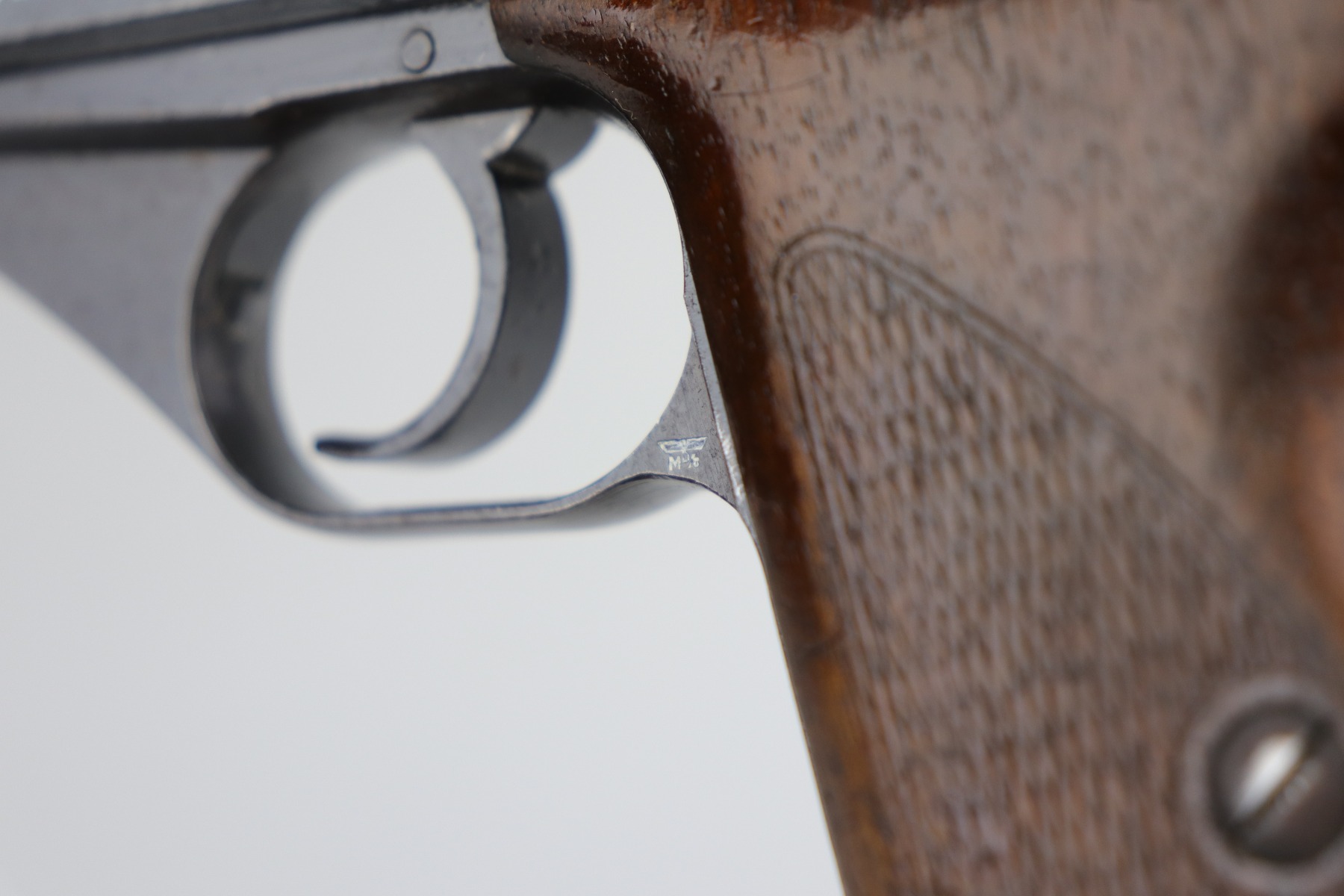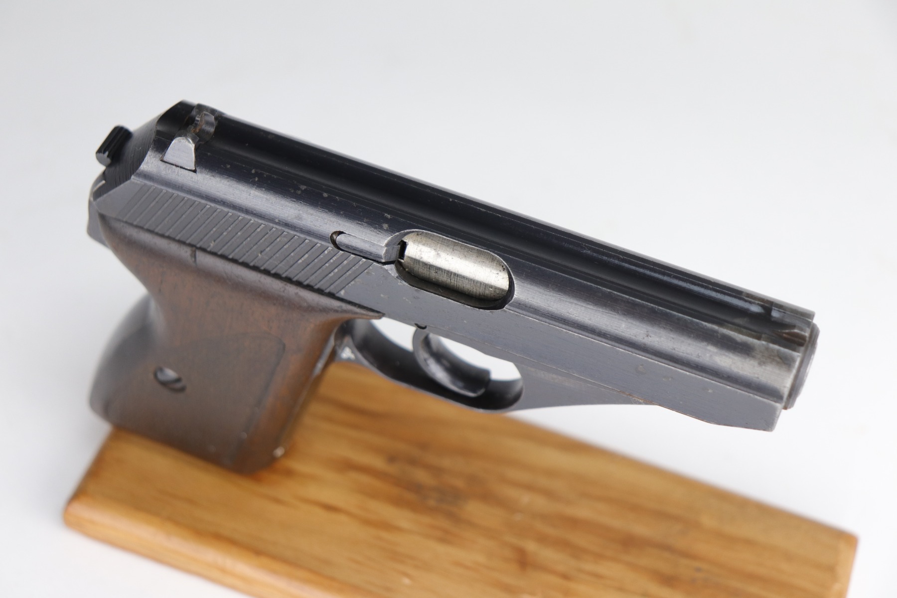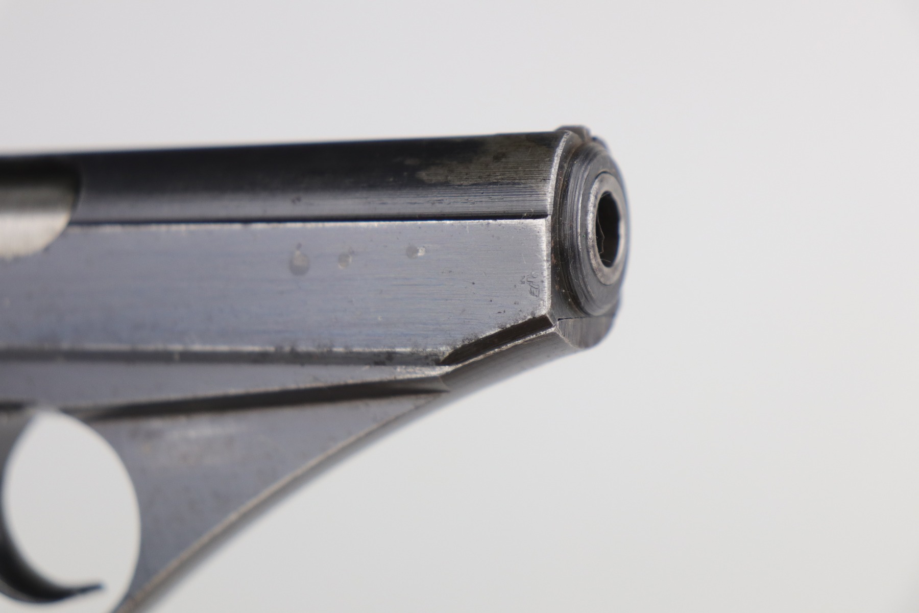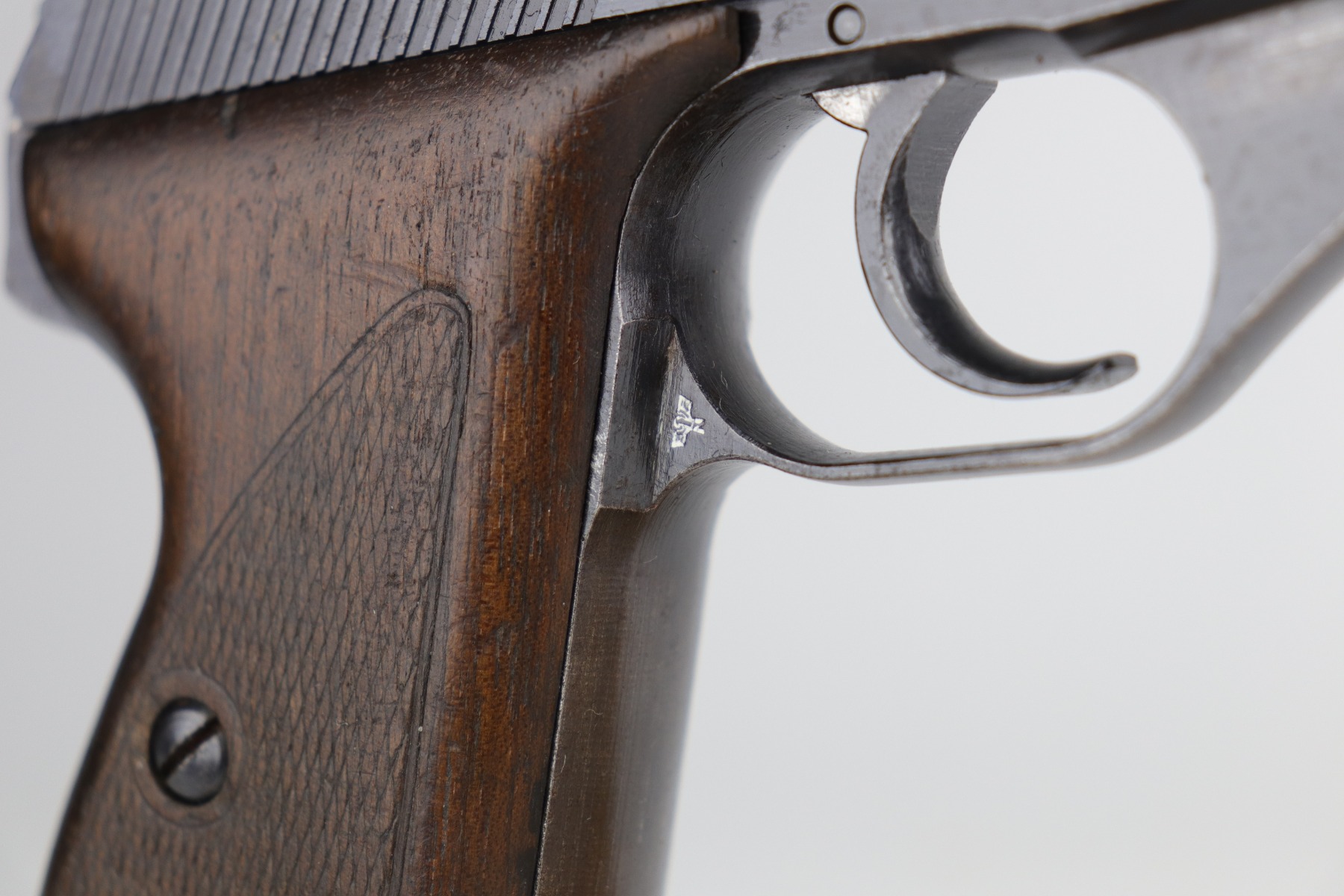 9/11/20 – This is a very nice example of a Mauser HSC issued to the Nazi Kriegsmarine in 1943. It is of the 4th variation, characterized by the “Eagle M III/3” marking on the web of the trigger guard. Only 4,500 of this particular variation were made. This gun has retained about 90% of its original finish. The most noticeable signs of wear are areas of discoloration around the muzzle and splotchy discoloration on the top and right side of the slide. There is spotty oxidation on the gun throughout. There is minor thinning on straps where there is some dark brown patina showing through. The bore is excellent – shiny with strong rifling. Excellent original grips and comes with one period-correct magazine.