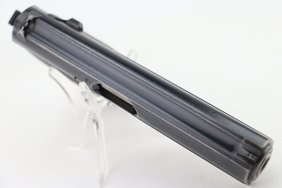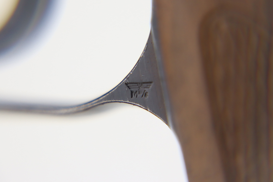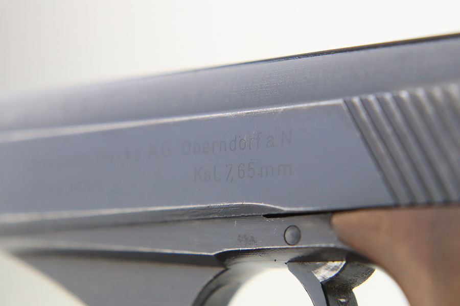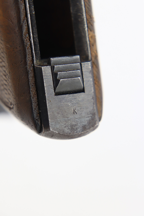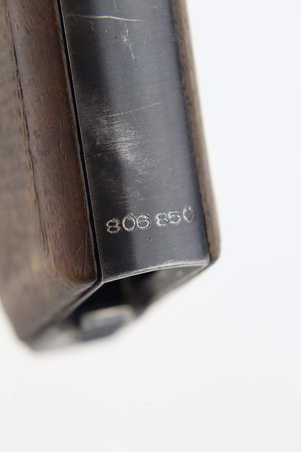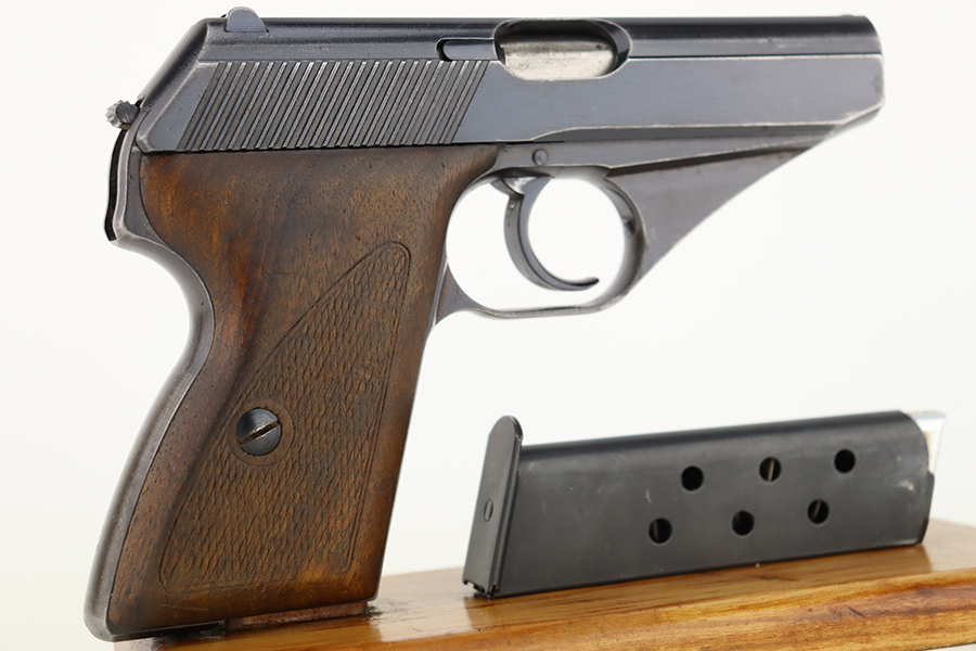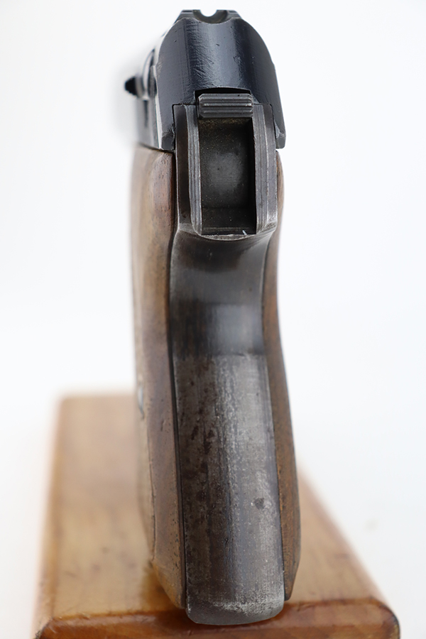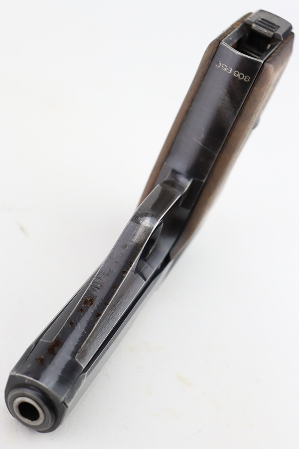 1/24/24 – This is a very nice example of a Mauser HSC issued to the Kriegsmarine in 1942. It is all matching and is considered a 4th variation example, characterized by having only the “Eagle M 111/8” on the left side of the trigger guard – no “Eagle M” on the front strap. This one has retained about 93% of its original finish. Most of the finish loss is on the grip straps, where there is also some spotty brown patina. A light scratch on the front strap as well. Fitted with nice period-correct wood grips and comes with a post-war magazine. Mint bore.