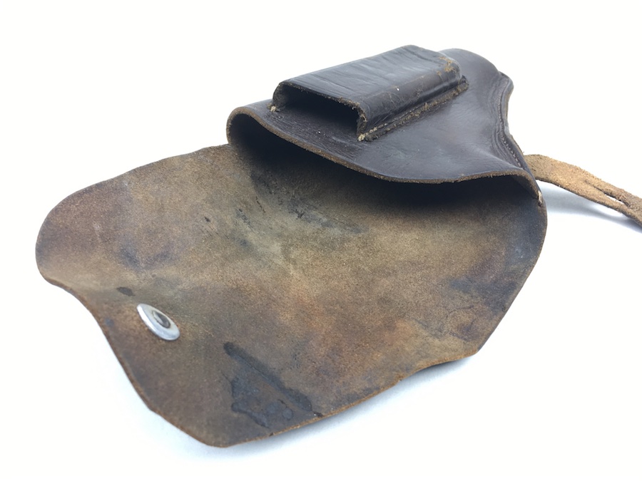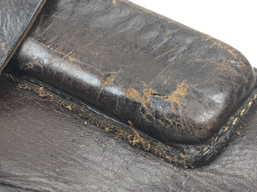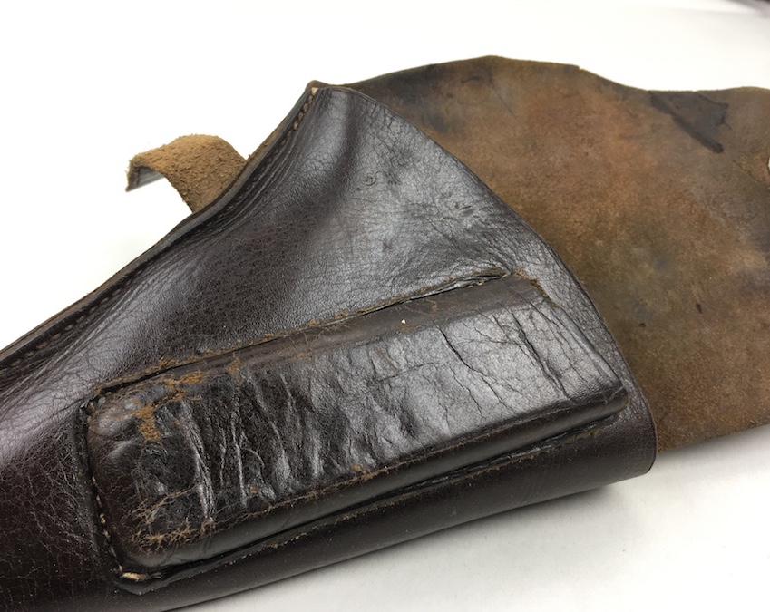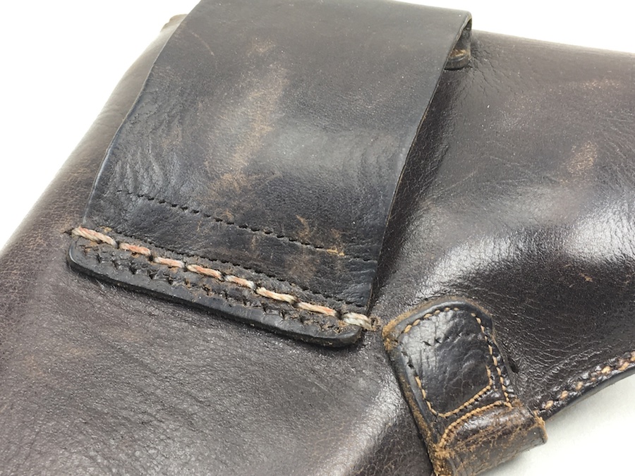 8/20/19 – This is an original WW2 production Kriegsmarine Mauser HSc holster. The interior leather has an eagle/M navy proof stamp, although it is faint. The leather is in good condition with minimal wrinkling on the back and top leather. The left portion of the flap has been cut and the belt loop has been restitched. Use wear on the closure strap, but it is secure. Small hole at the bottom of the mag pouch. The interior leather is clean. There’s also missing / restitching on the back belt loop. See photos.