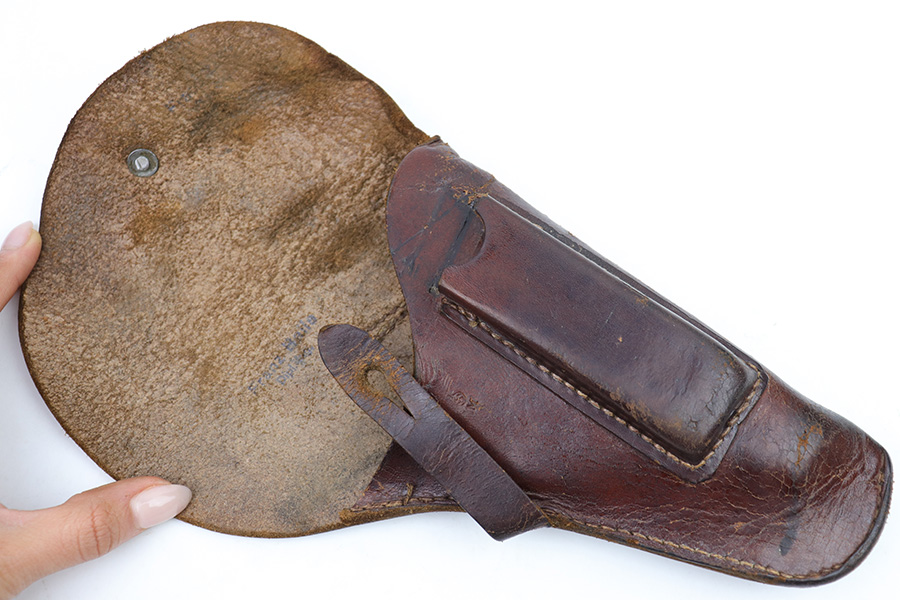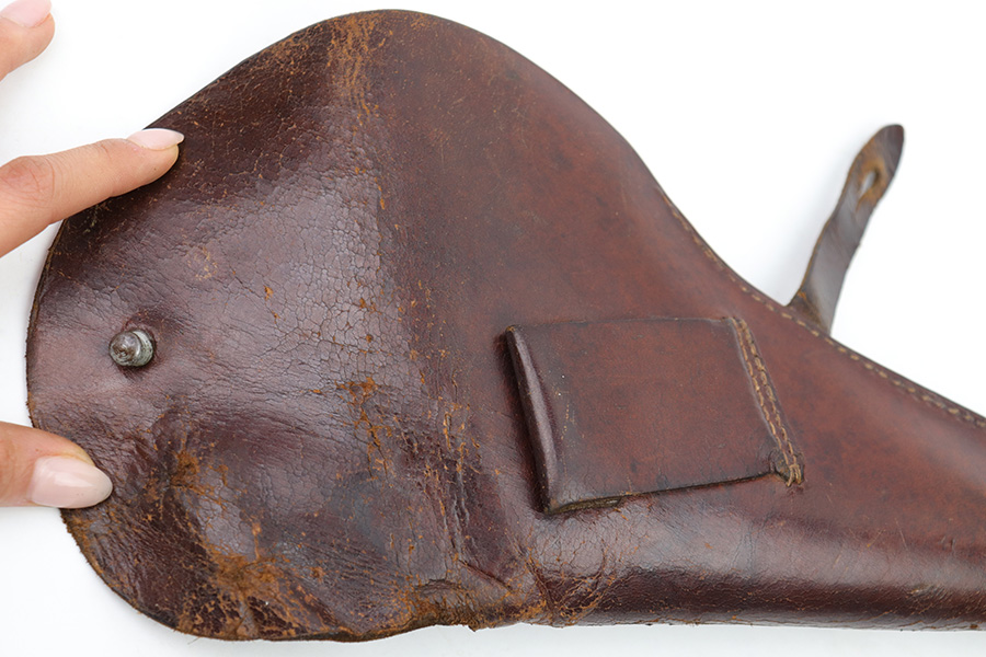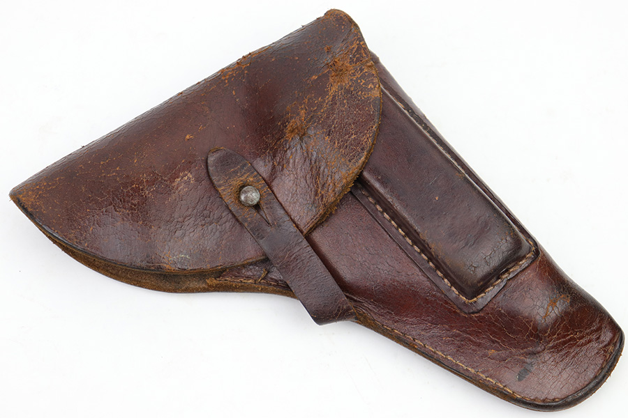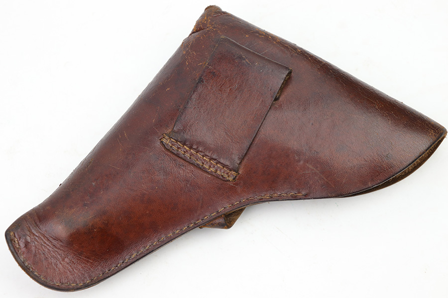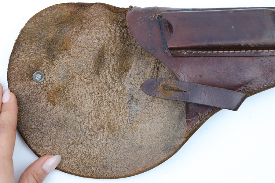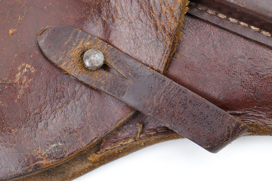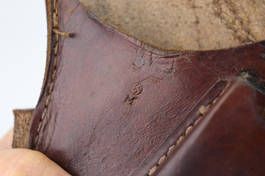 2/22/23 – This is an original WW2 production Kriegsmarine issued holster for a Mauser model HSC or model 1934 pistol. The holster is in good overall condition with the majority of the wear being on the front / lid of the leather. There’s surface wrinkling and scuffing which leads to general weakness of the leather in the area over the magazine pouch, but the leather is still completely intact. The rest of the holster leather has light wear and normal pliability. There’s a Kriegsmarine proof stamp under the closure strap on the front leather as shown. There’s also a light ink stamp on the interior leather that’s somewhat hard to read. The stitching is all original and intact.