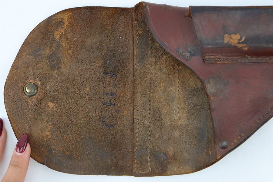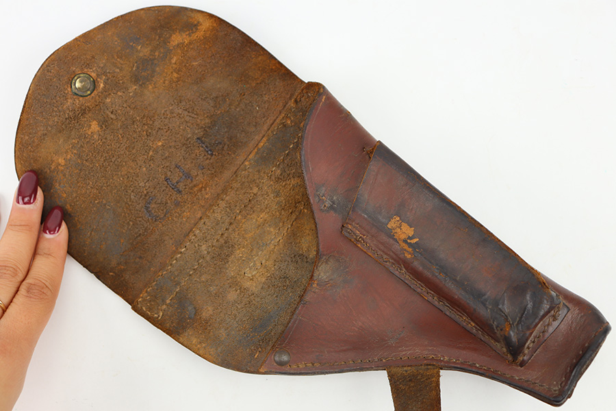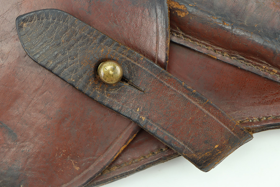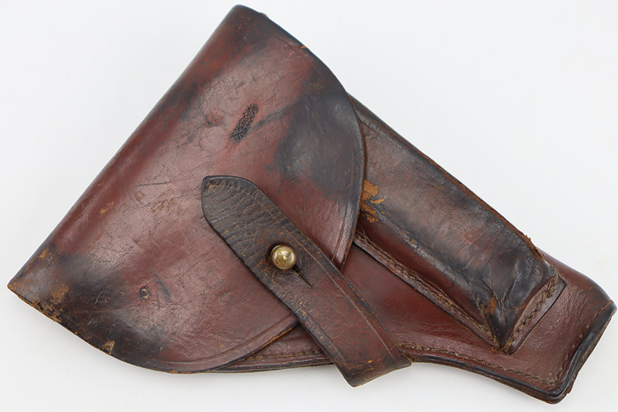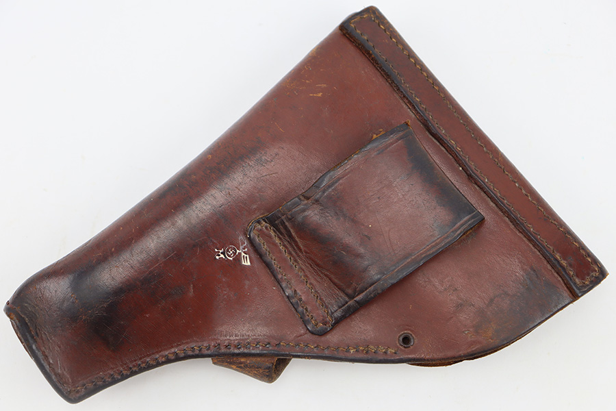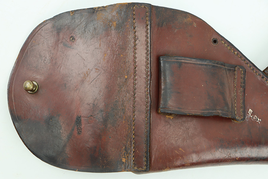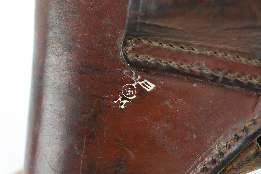 11/28/23 – This is an original WW2 German Navy (Kriegsmarine) issued holster for the Mauser M1934 or model HSc. We’ve seen this style more typically with the M1934, but the HSc also fits and is appropriate. The holster is in good overall condition with some exterior scuffs on the leather. These are on the front leather and mag pouch. There’s also light wrinkling throughout and normal signs of use and aging. The interior leather has initials written inside. The back leather has a Kriegsmarine proof stamp, as shown. All original stitching is in great condition.