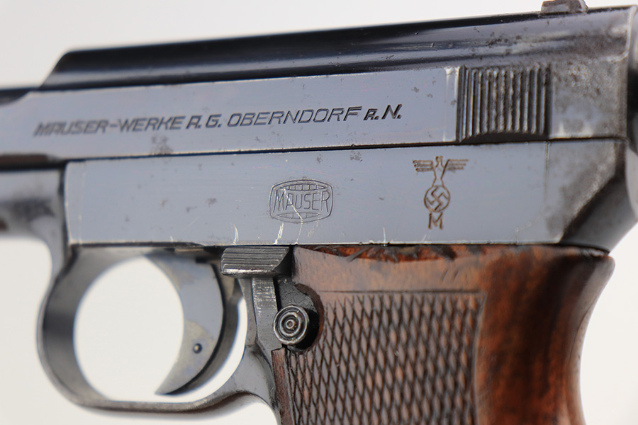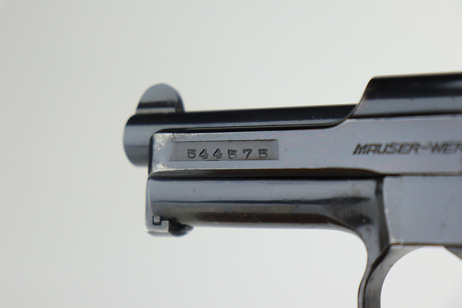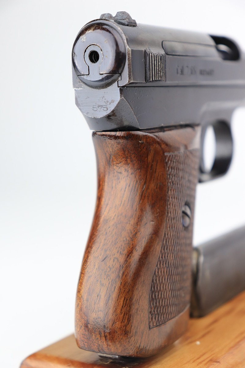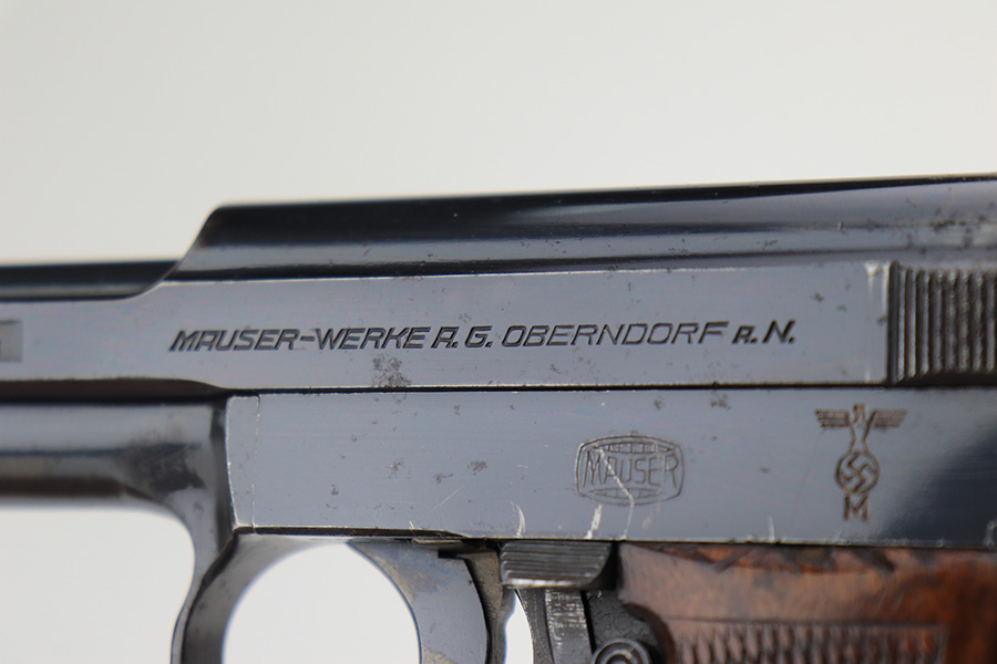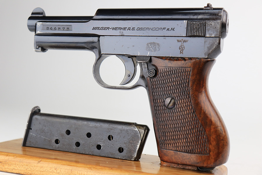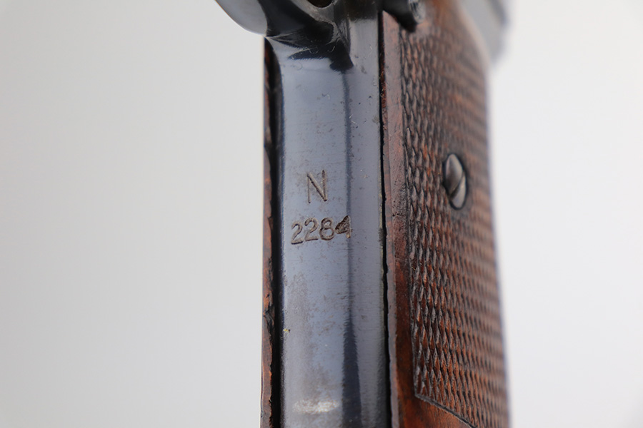 3/31/22 – This is an excellent example of a Mauser Model 1934 issued to the Kriegsmarine in the 1930’s. It is all matching and has the iconic open wing “Eagle M” Kriegsmarine marking on the left side of the frame. It also has an “N 2284” Navy property mark on the front strap. It comes with one original magazine with the matching property number on the base. The gun has retained about 96% of its original high polish finish. While there is very little actual finish loss, there is an area of noticeable pitting at the back of the left side of the slide. Minor muzzle wear and some freckling on the front strap. A few tiny scratches on the left side of the frame. There are some tiny dings on the right side of the frame just above the grip. Comes with a nice period-correct wood – a few small bruises here and there. Minty bore.