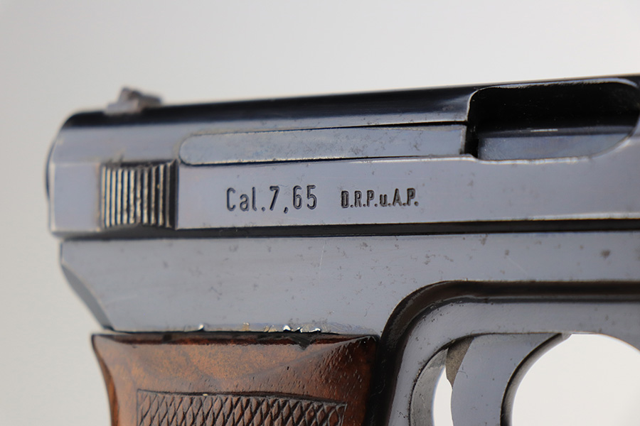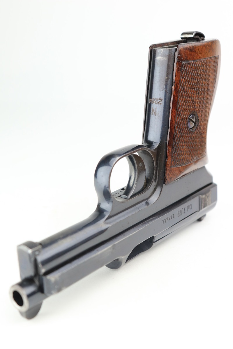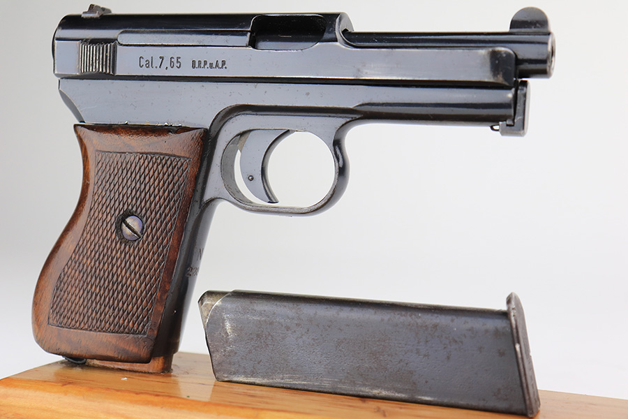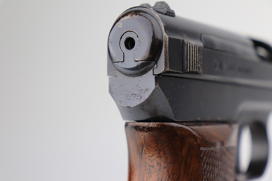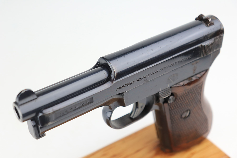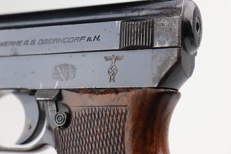 3/31/22 – This is an excellent example of a Mauser Model 1934 issued to the Kriegsmarine in the 1930’s. It is all matching and has the iconic open wing “Eagle M” Kriegsmarine marking on the left side of the frame. It also has an “N 2284” Navy property mark on the front strap. It comes with one original magazine with the matching property number on the base. The gun has retained about 96% of its original high polish finish. While there is very little actual finish loss, there is an area of noticeable pitting at the back of the left side of the slide. Minor muzzle wear and some freckling on the front strap. A few tiny scratches on the left side of the frame. There are some tiny dings on the right side of the frame just above the grip. Comes with a nice period-correct wood – a few small bruises here and there. Minty bore.