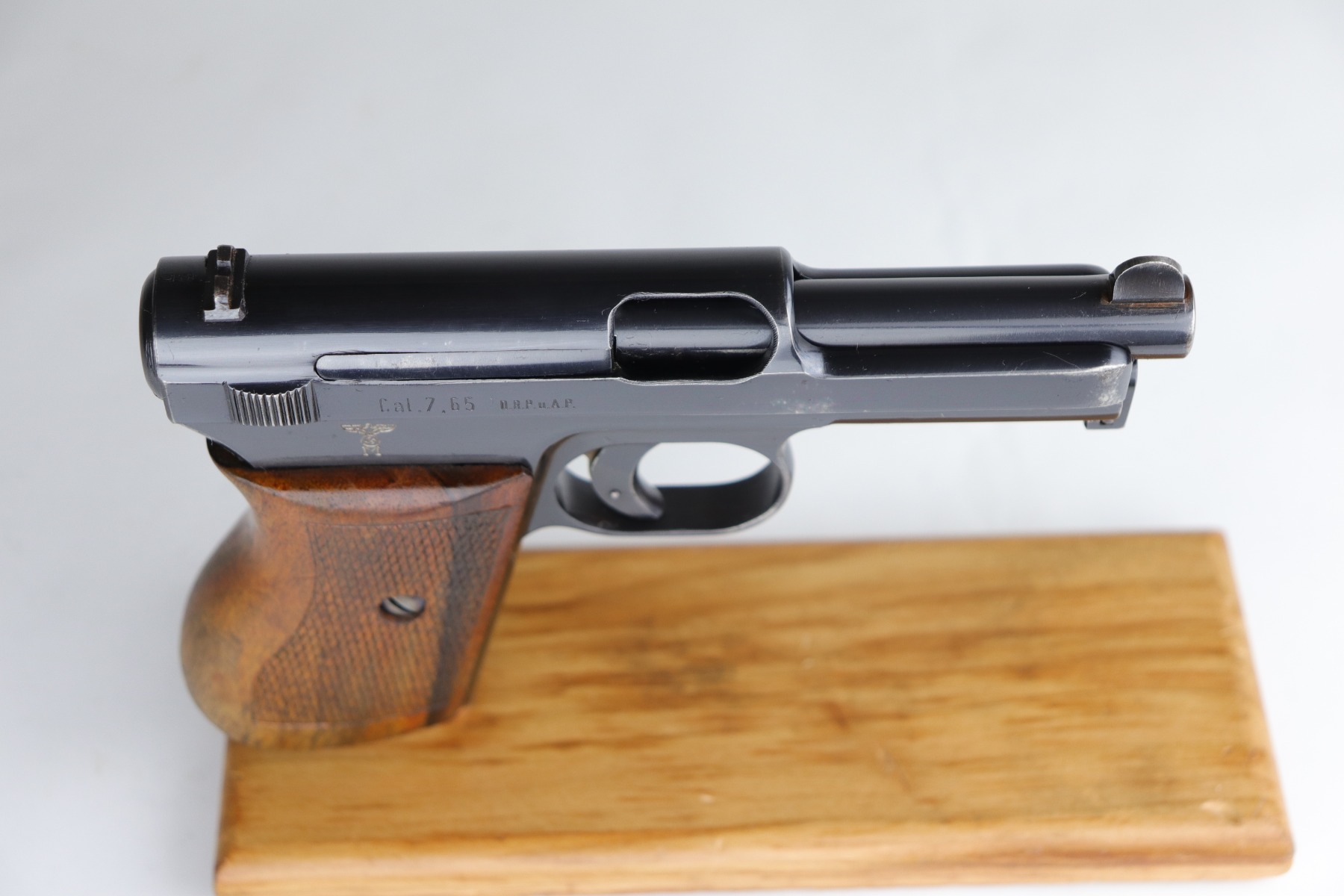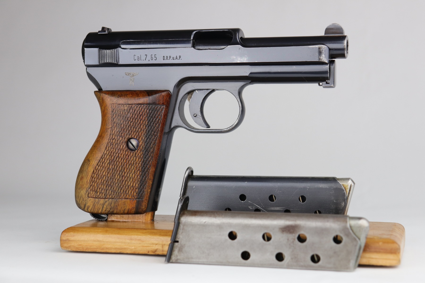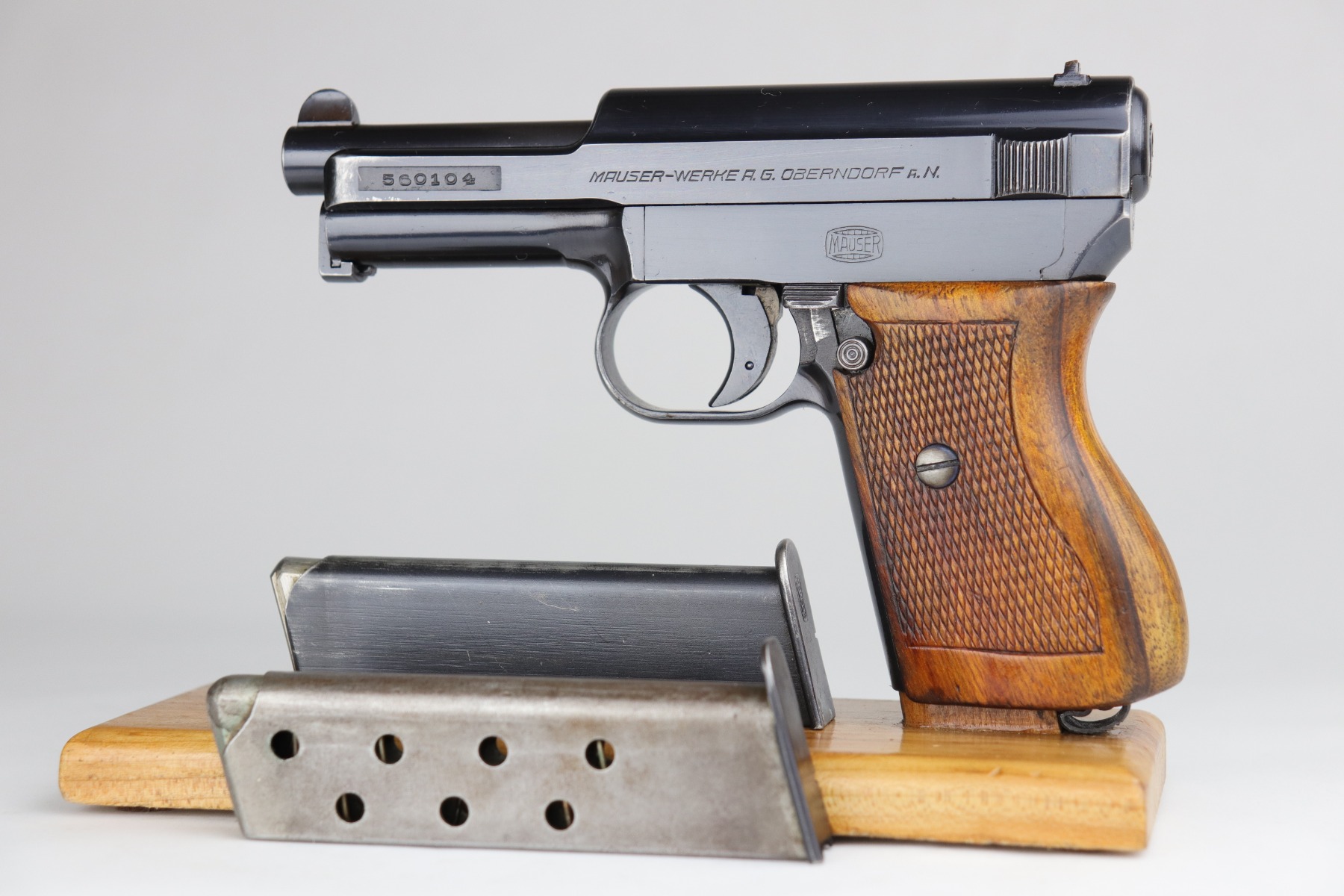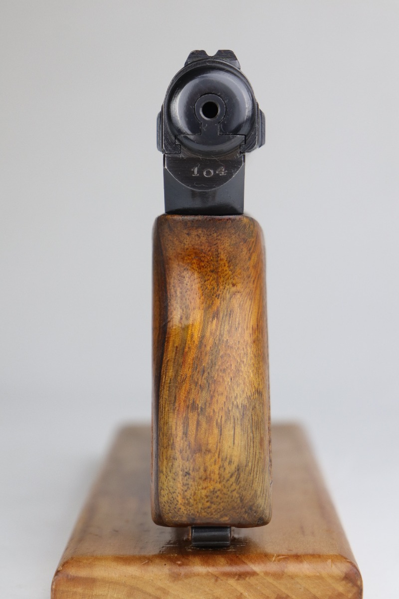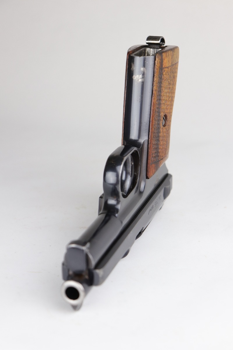 11/2/20 – This is a Mauser Model 1934 issued to the Nazi Kriegsmarine in 1934. About 23,000 Mauser 1934’s were procured and marked by the Nazi Navy from 1935 to 1941. This particular example is of the fourth variation, characterized by the Kriegsmarine marking on the right side of the frame and without a property number on the front strap. It is crown U proofed and all matching. It is in excellent condition, retaining about 95% of its original finish. There is minor muzzle wear, small spots of wear on the right side of the slide, and an area of wear on the front strap. The grip is original and excellent. The bore is excellent – shiny with strong rifling. NOTE: The listing comes with only ONE magazine, which is marked with Mauser banner on the bottom but no naval markings.
