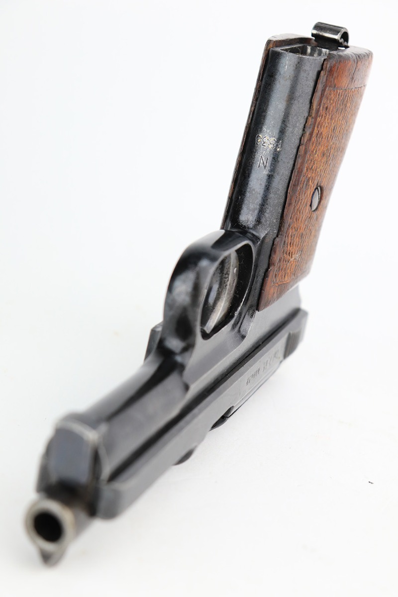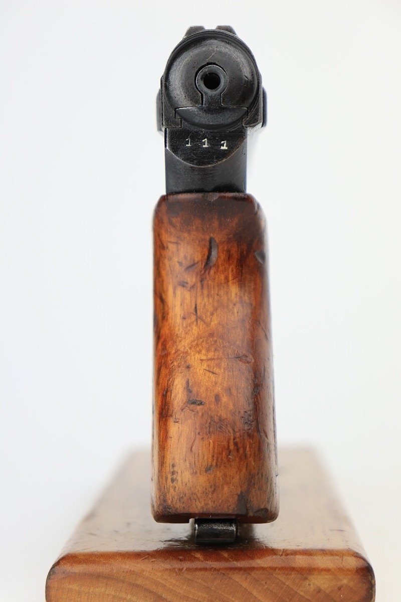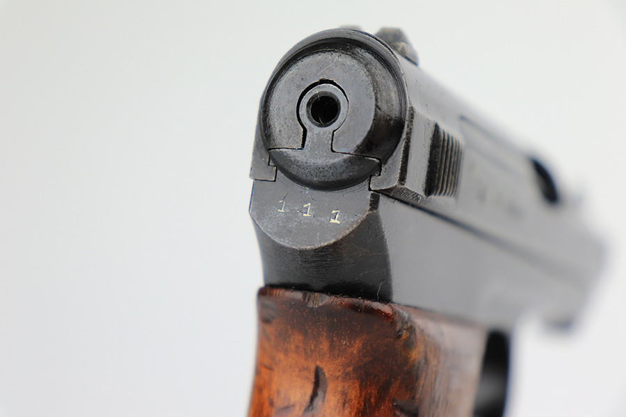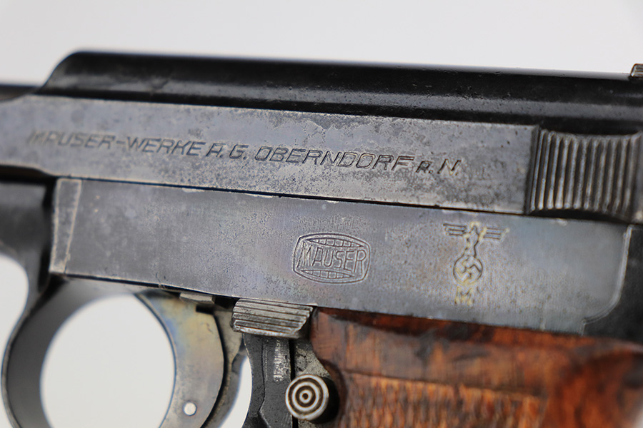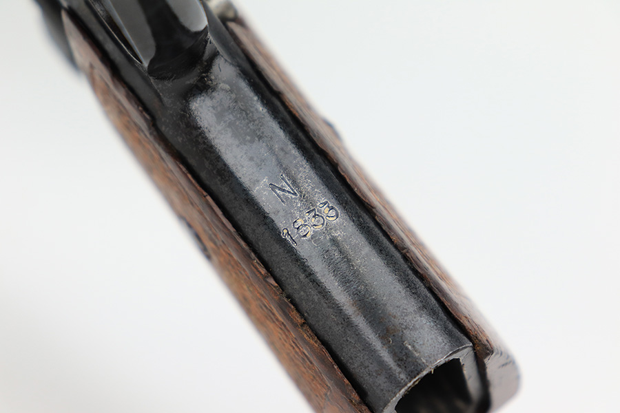 5/5/23 – This is a WW2-era Mauser M1934 issued to the Nazi Kreigsmarine. This particular example has an “Eagle M” Kriegsmarine marking on the left side of the frame and a “N 1833” navy property mark on the front strap. About 23,000 M1934’s were procured and marked by the Nazi Navy from 1935-1941. Since this one is “Double Crown U” proofed, it likely dates to the 1930’s. All parts are matching. This one also comes with one original matching magazine. The gun itself has an old re-blued finish. There is spotty wear, splotchy discoloration, and areas of pitting throughout. The wood grips is worn along the edges, and there are tiny bruises throughout. The bore has good rifling, but there is light spotty freckling throughout.