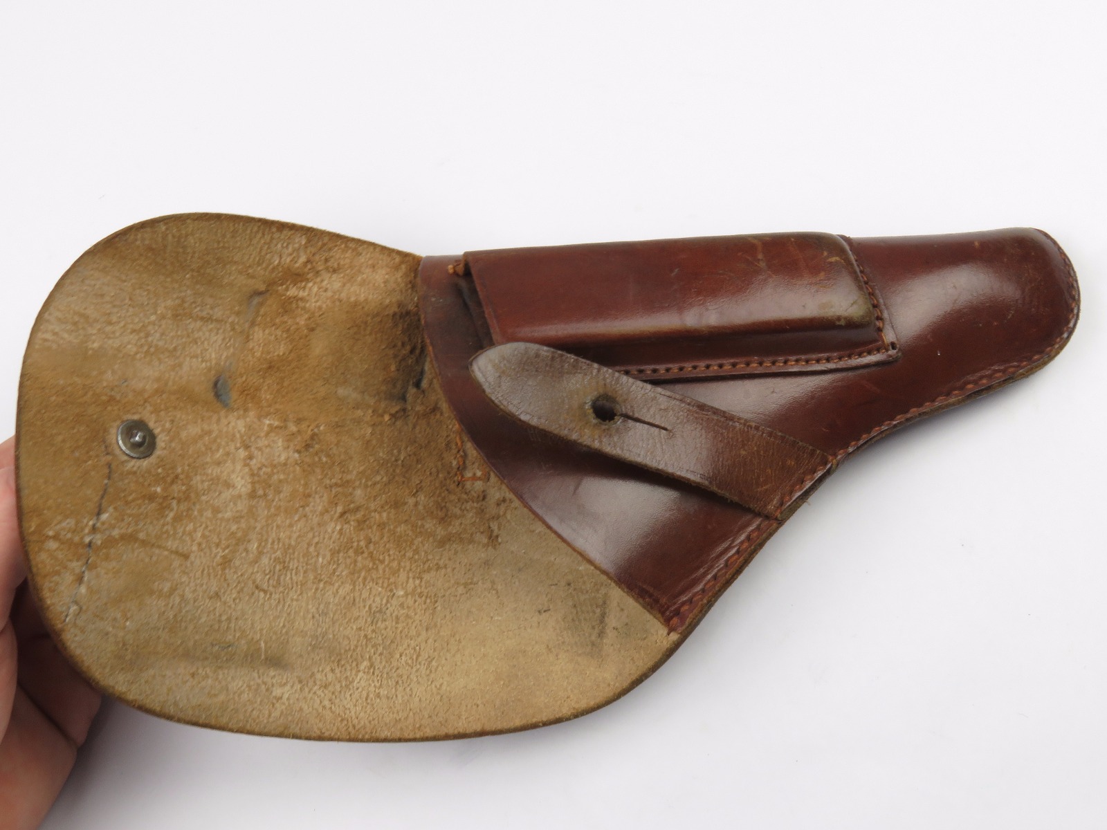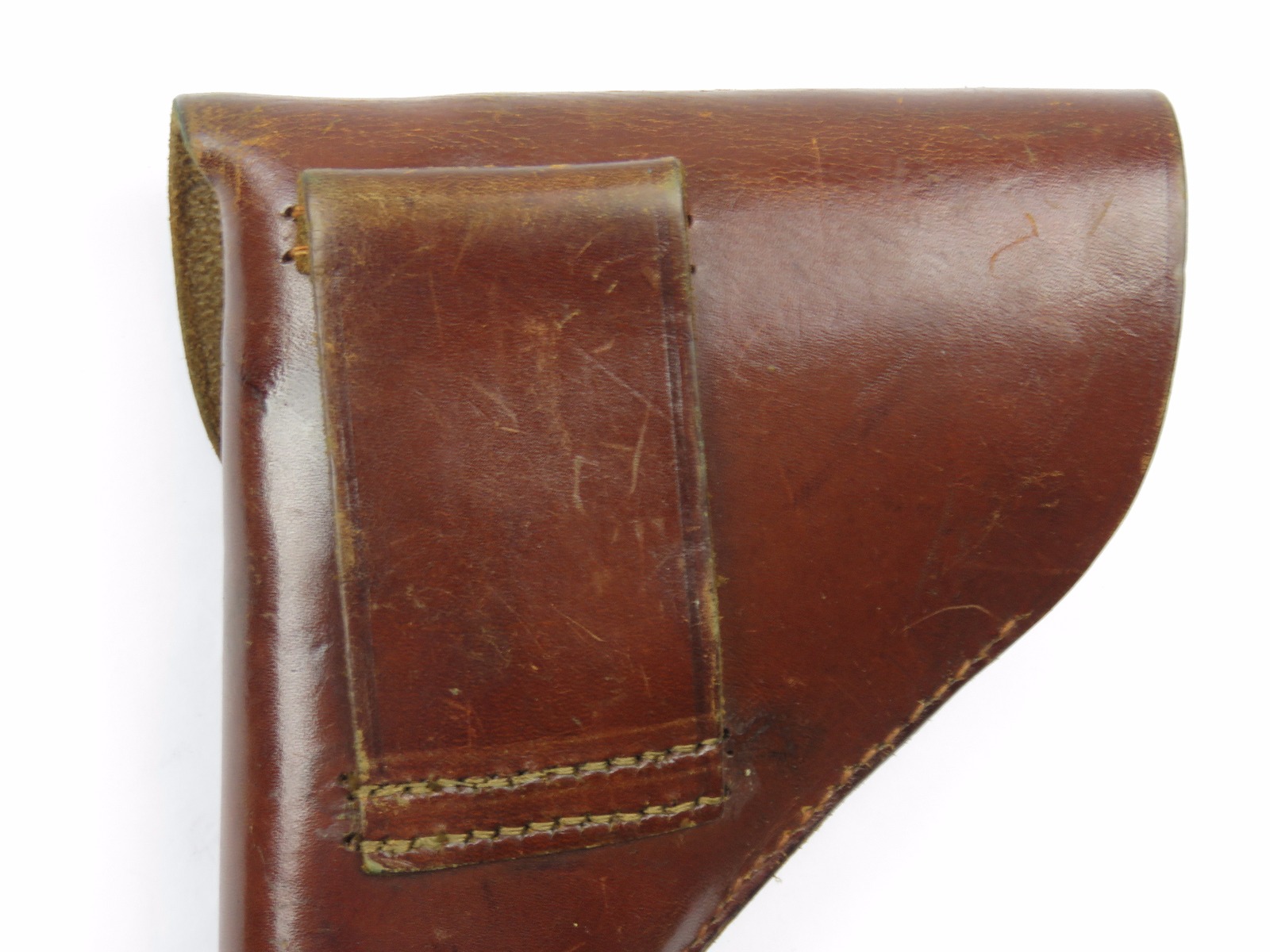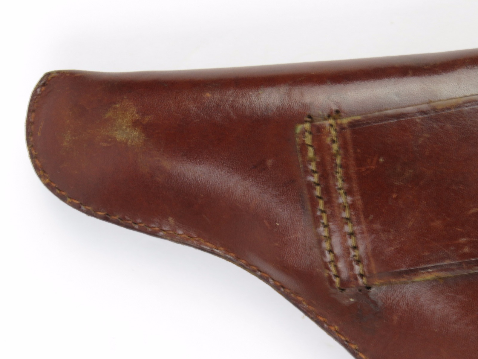 11/6/17 – This is an original WW2 production nazi navy (Kriegsmarine) holster. The holster is perfect for a Mauser HSc, or model 1934 (although this may be a little big for the 1934). The holster has very nice clean interior and exterior leather. Under the closure strap is a faded, but completely original eagle/M kriegsmarine stamp. The stitching is excellent and completely in tact. The top leather has some light surface wrinkles. Guaranteed original and authentic.