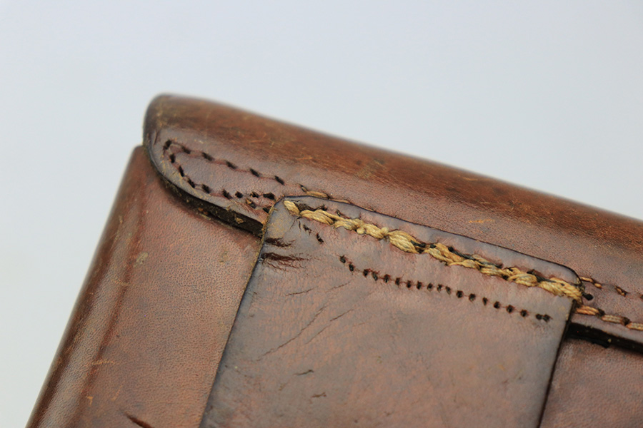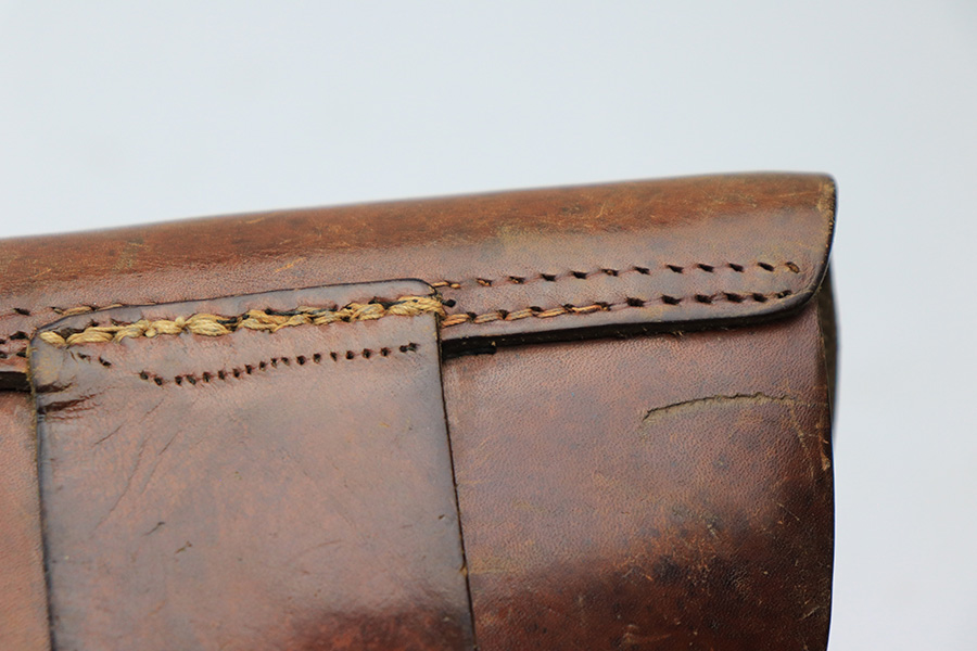 4/27/22 – This is an original WW2 production Kriegsmarine Mauser holster. The holster is appropriate for a M1934 or HSC that was issued to the German navy. The holster is in good overall condition with soft, pliable leather. There are typical signs of aging and no excessive wear to the leather. The back belt loop has been re-stitched, and there are some loose and missing stitches where the lid attaches to the body of leather. The rest of the stitching is intact without issue. There’s an original Kriegsmarine proof stamp under the closure strap. No other markings or stamps.