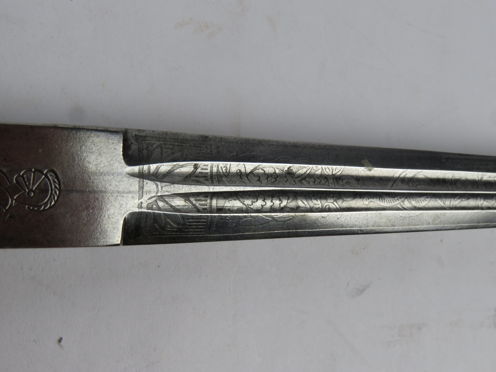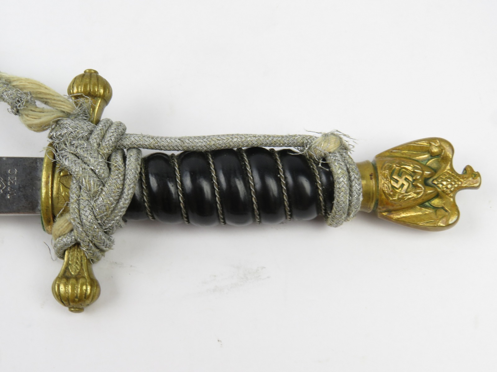 8/2/17 – This is a rare variation Kriegsmarine dagger from WW2. Notice the dagger has a black handle, whereas most Kriegsmarine daggers are white handles. These black handled daggers were given to the family of a deceased naval officer. The dagger has an engraved/etched blade as well making it a high quality collector’s piece. Additionally, the scabbard has late war golfball dimples. This is a late WW2 variant that is seldom seen on scabbards. The scabbard is in great shape with only one small dent on one side. The blade is in great shape with some normal patina throughout, which is darkening of the original finish. The engraving is somewhat faded and light, but still visible. The blade has an original WKC maker stamp. The handle is in excellent condition with no cracks or chips. Included is a portepee, that is all original although worth fairly throughout the string with some fraying. Guaranteed all original.