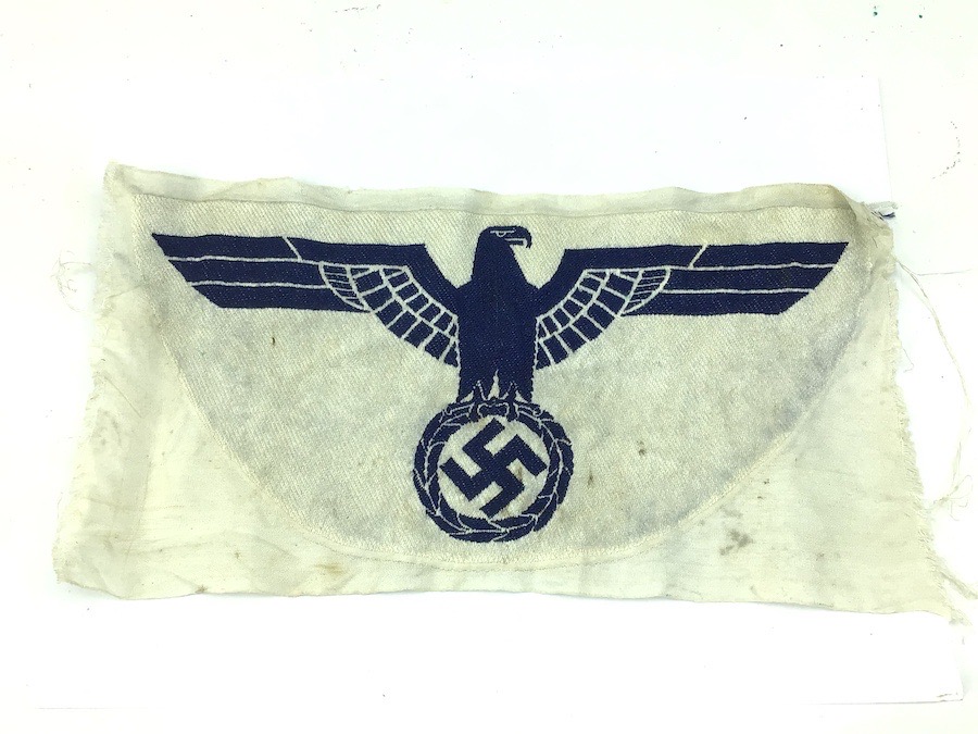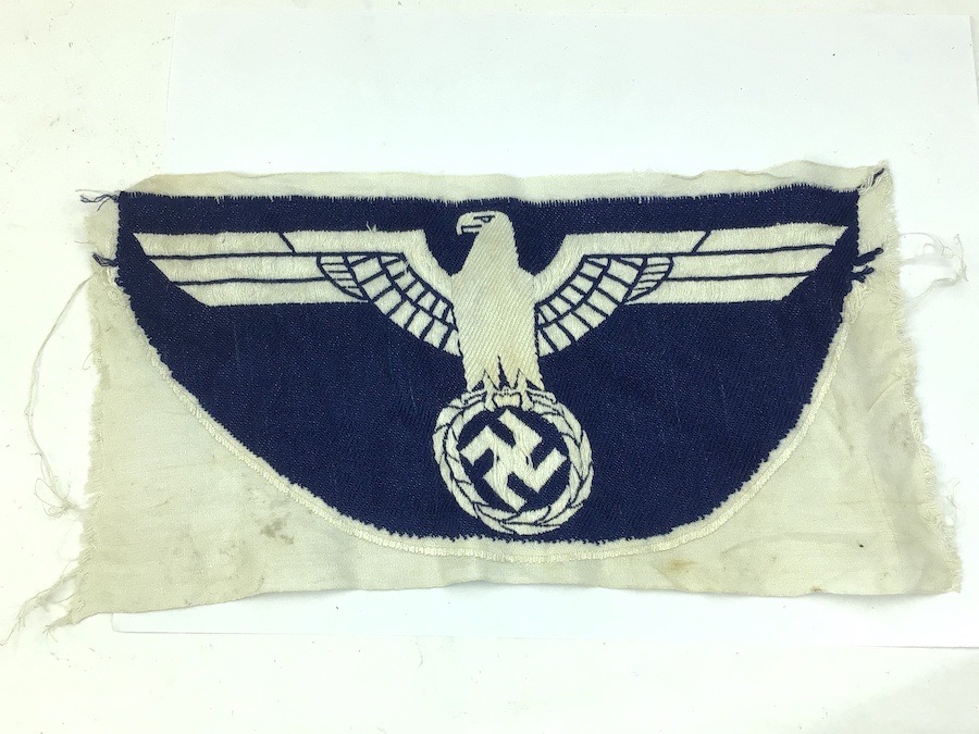 6/12/23 – Original and great condition. This Kriegsmarine Sport Shirt Emblem is blue and white, machine woven, with the national eagle. Showing out-stretched wings, clutching a wreathed, canted, swastika in it’s talons. Measures approximately 10″ x 6″. Some minor fraying on the edges, but otherwise very nice. Shows some minor staining.