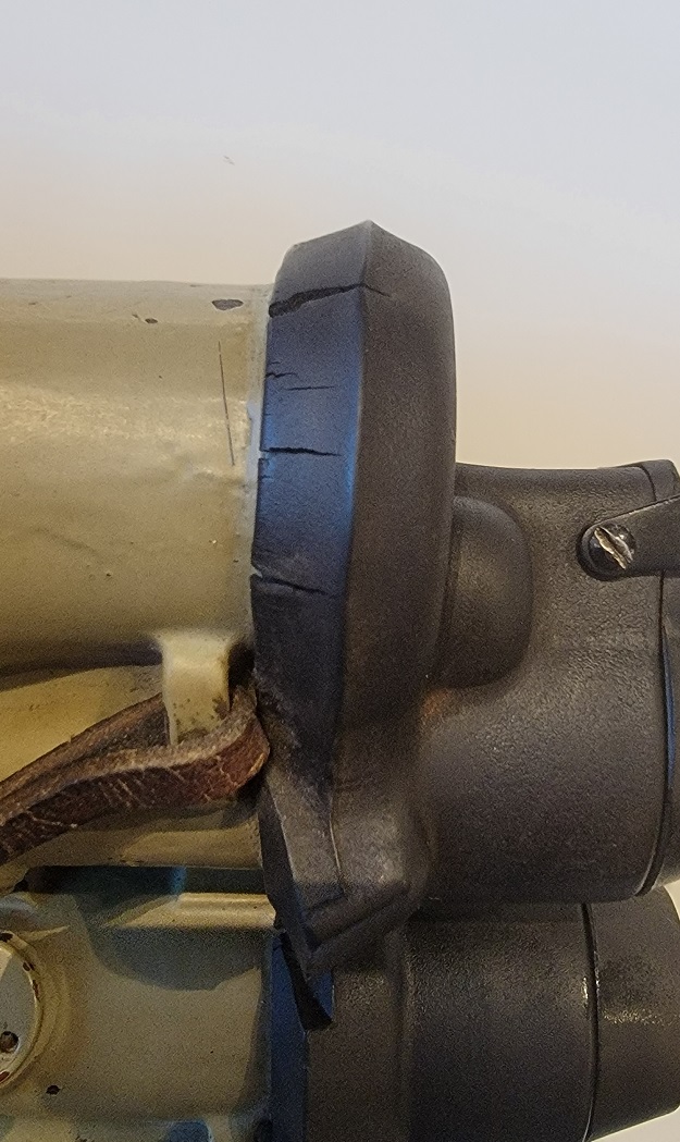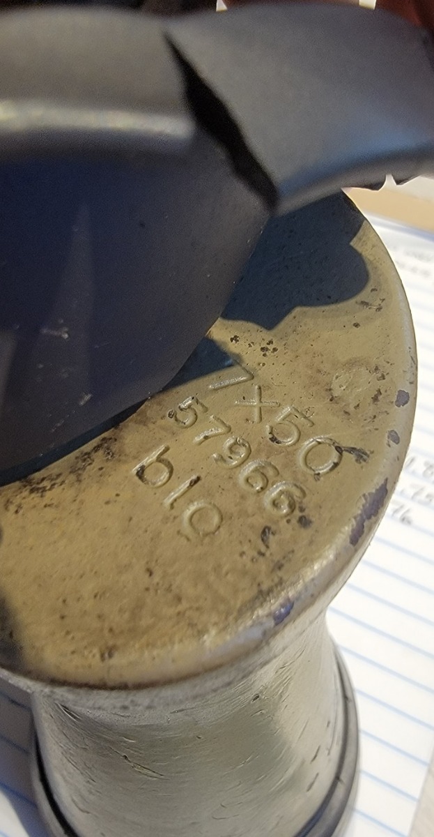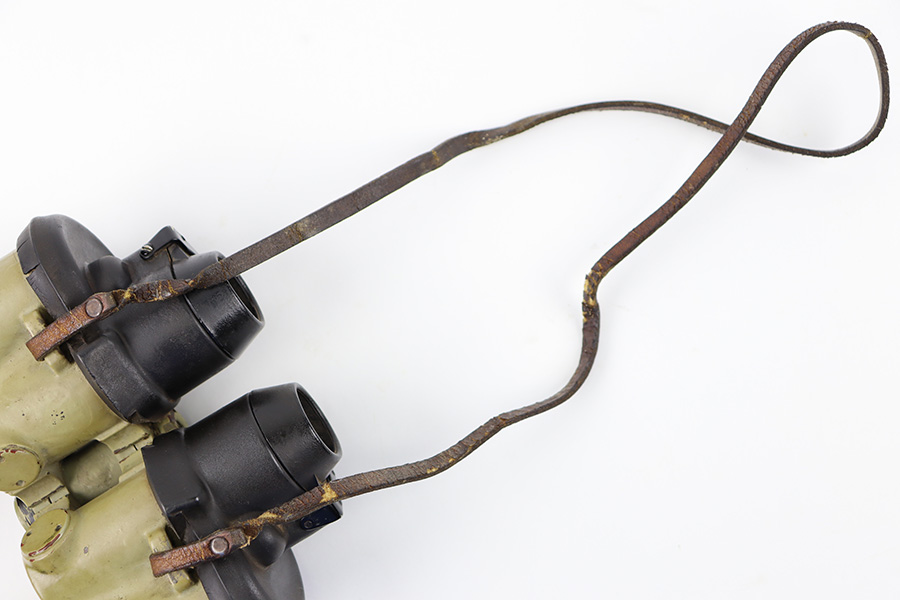 1/5/24 – This is a pair of WW2 original 7×50 Kriegsmarine U-Boat binoculars. The binoculars come as-shown with no case included. There’s an original leather carry strap attached to the binoculars, but the leather is stiff and fragile from age. The black rubber covers on each of the lenses, on both ends, is original and in great condition. There’s some natural cracking along the edges of the rubber, but the rubber is still pliable and in great overall condition (especially for its age). The exterior olive / tan paint is indicative of wartime production, and has a few small chips but is mostly intact. The optics are crisp and excellent!