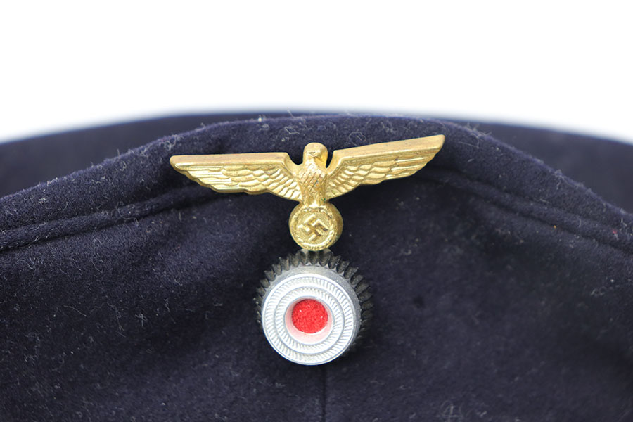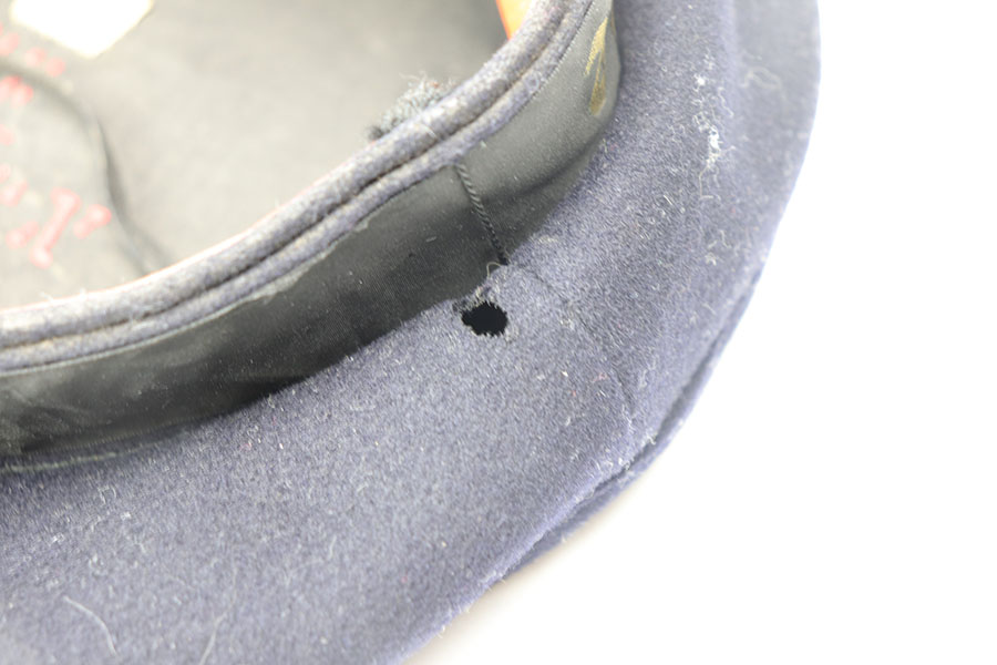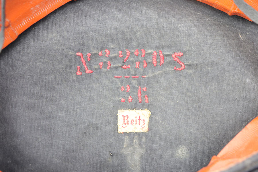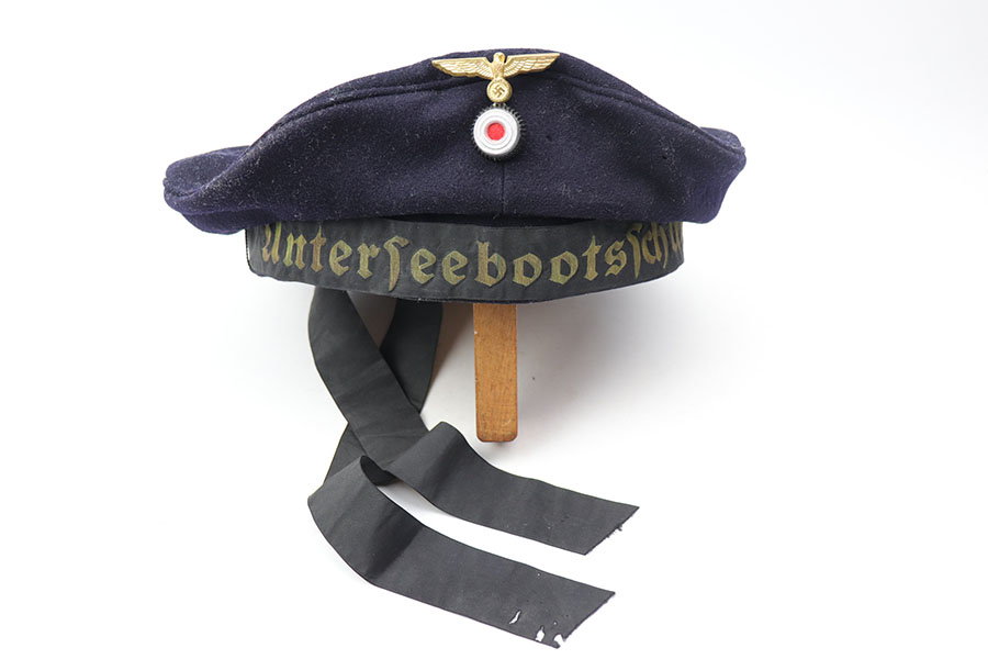 8/14/20 – This is an original “untersee bootsschule” or Kriegsmarine U Boat school cap from WW2. The cap is in excellent condition and still has the original black ribbons attached to the back. This cap would have been awarded / worn by cadets attending training for service on a U-Boat. The wool has no moth-holes and no notable issues. Some minor staining / fading and signs of aging on the front-brim where the writing is located. The interior is very clean with some minor leather wrinkling on the interior brim, but the leather is supple and completely in tact. Original labels still in tact as well.