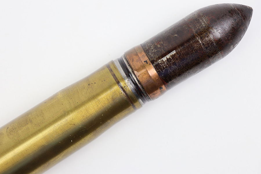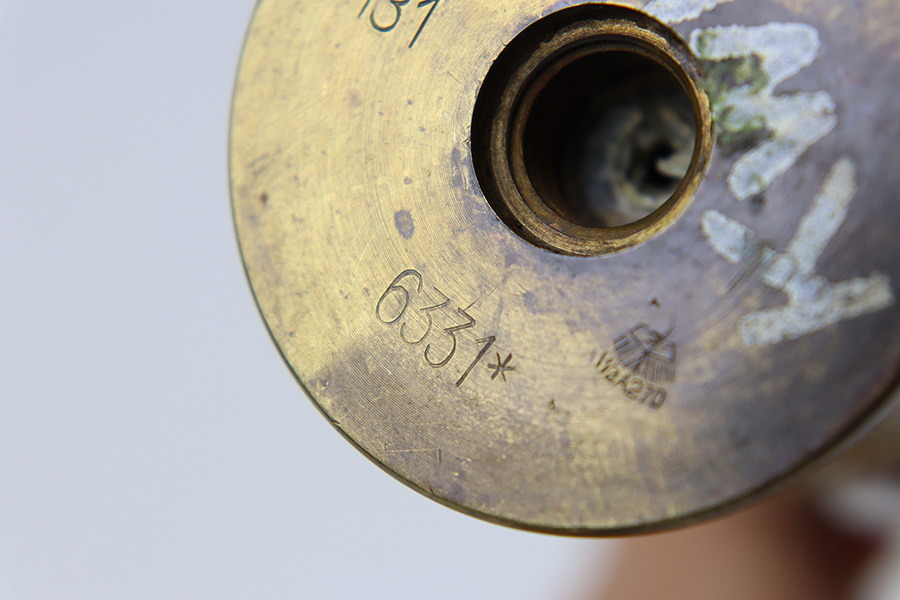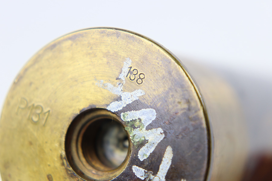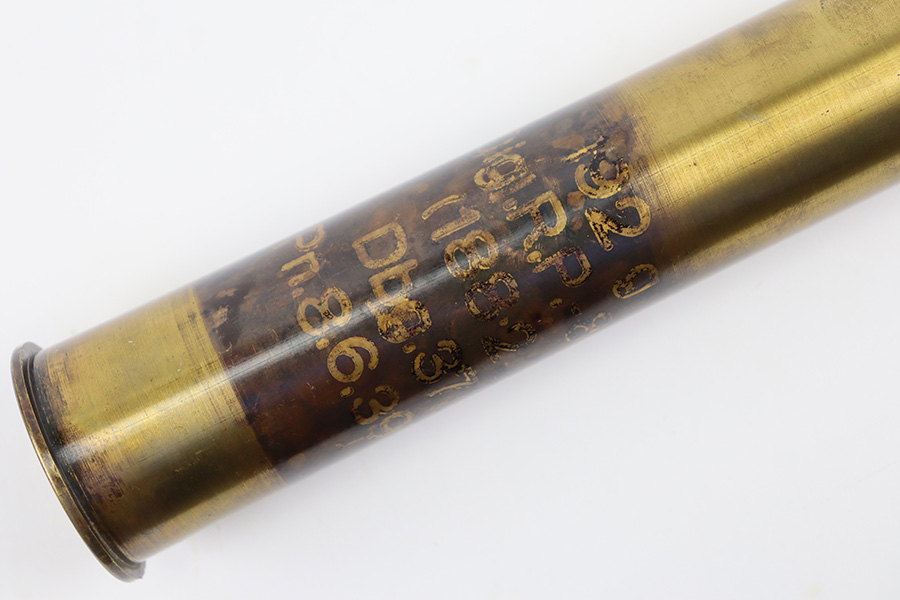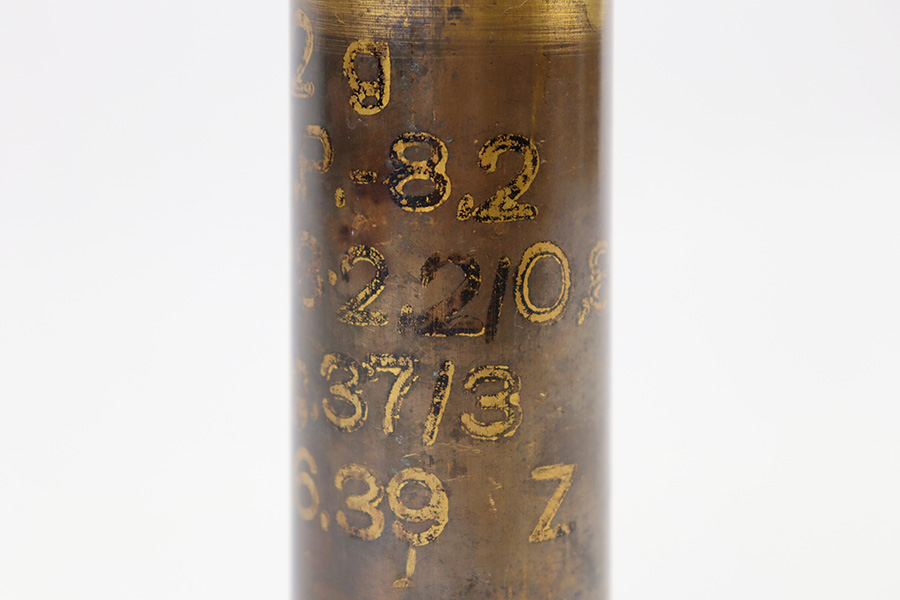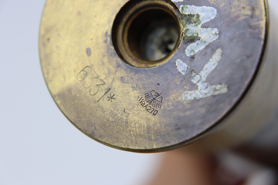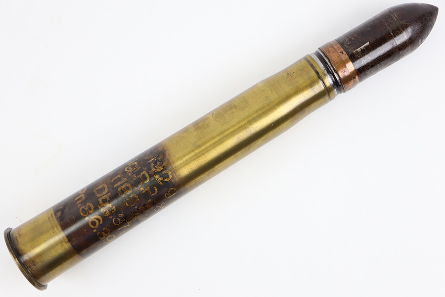 10/26/23 – This is an original 1936 dated German Panzer II or Panzer III 37mm tank round. The round is inert, and has markings on the side of the casing that look like they were burnt on with a stencil of some kind. Great overall condition with some natural patina and aging wear. The base of the shell is maker marked, waffen proof stamped, and 1936 dated.