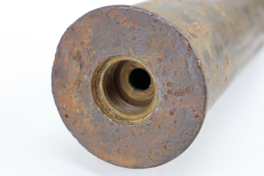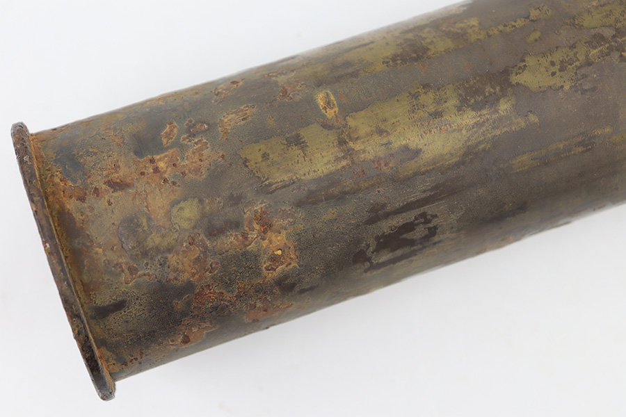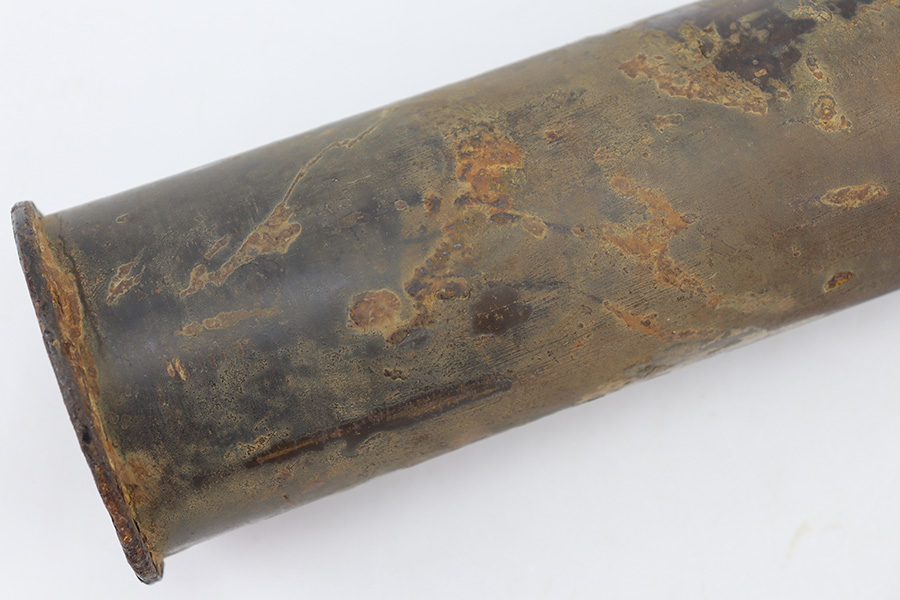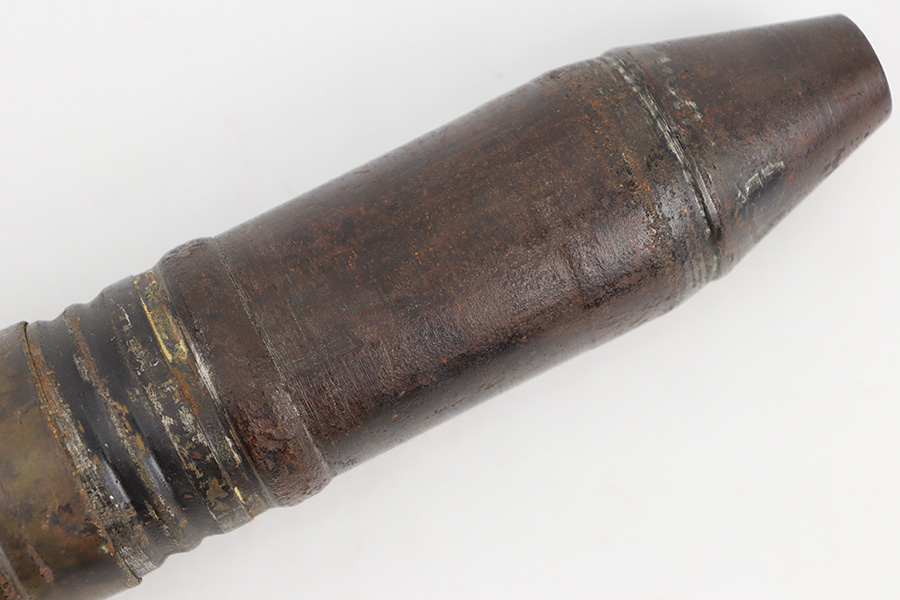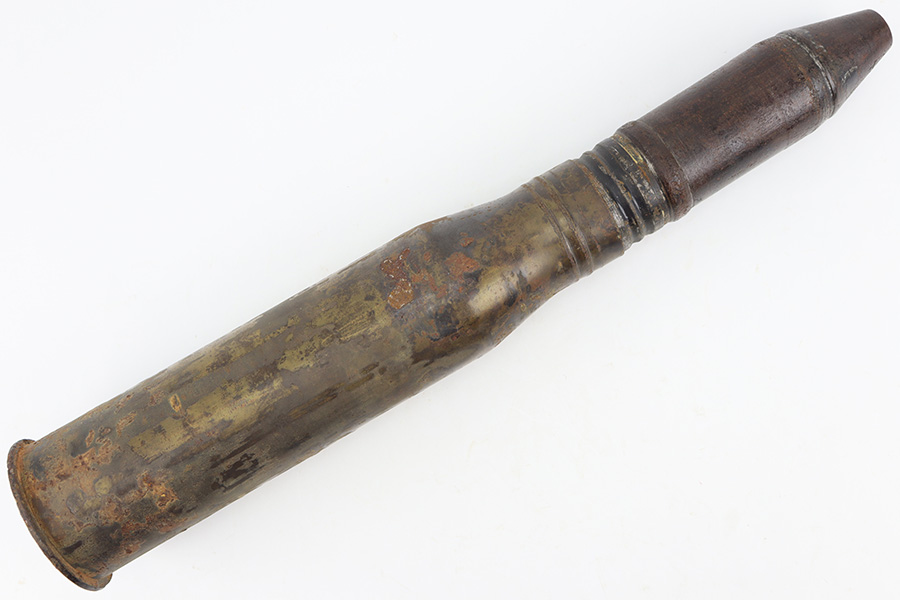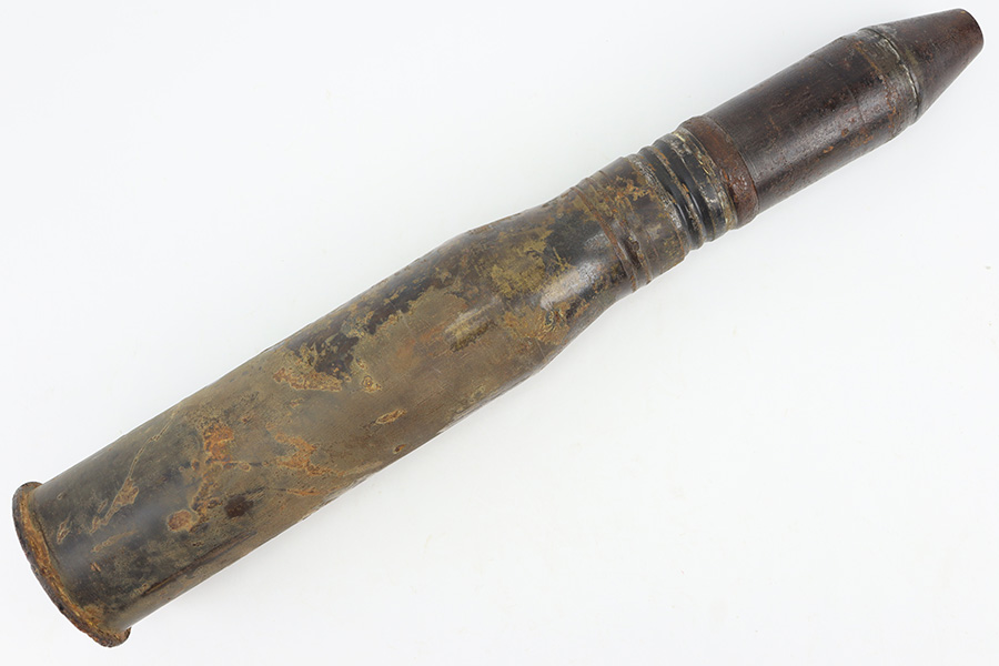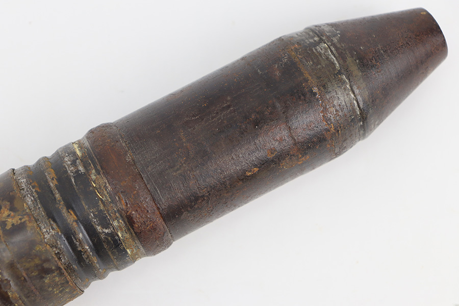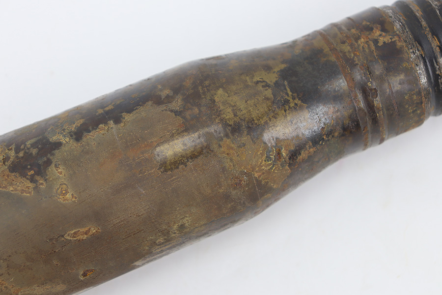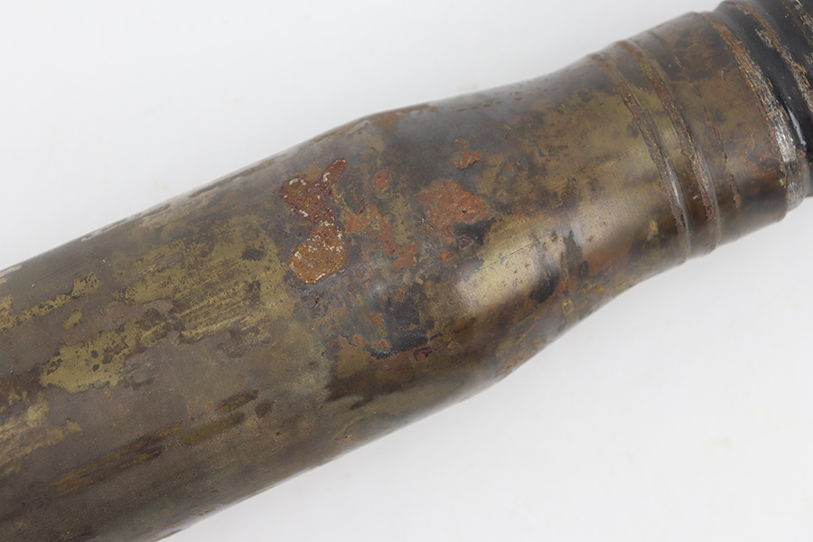 12/11/23 – This is an original KwK 39 Panzer III medium tank round. This was used for anti-tank and armored vehicle assault, known as a 5cm round. The shell is inert, and in good condition despite having some surface wear and aging throughout. There’s a visible waffen military proof stamp on the shell casing. The casing has a diameter of just under 8cm. Measures 45cm long.
