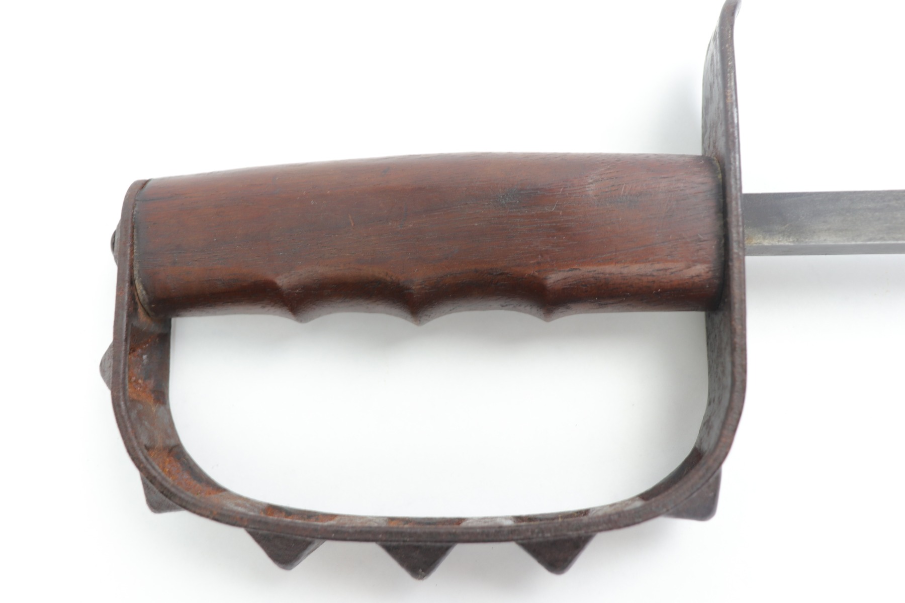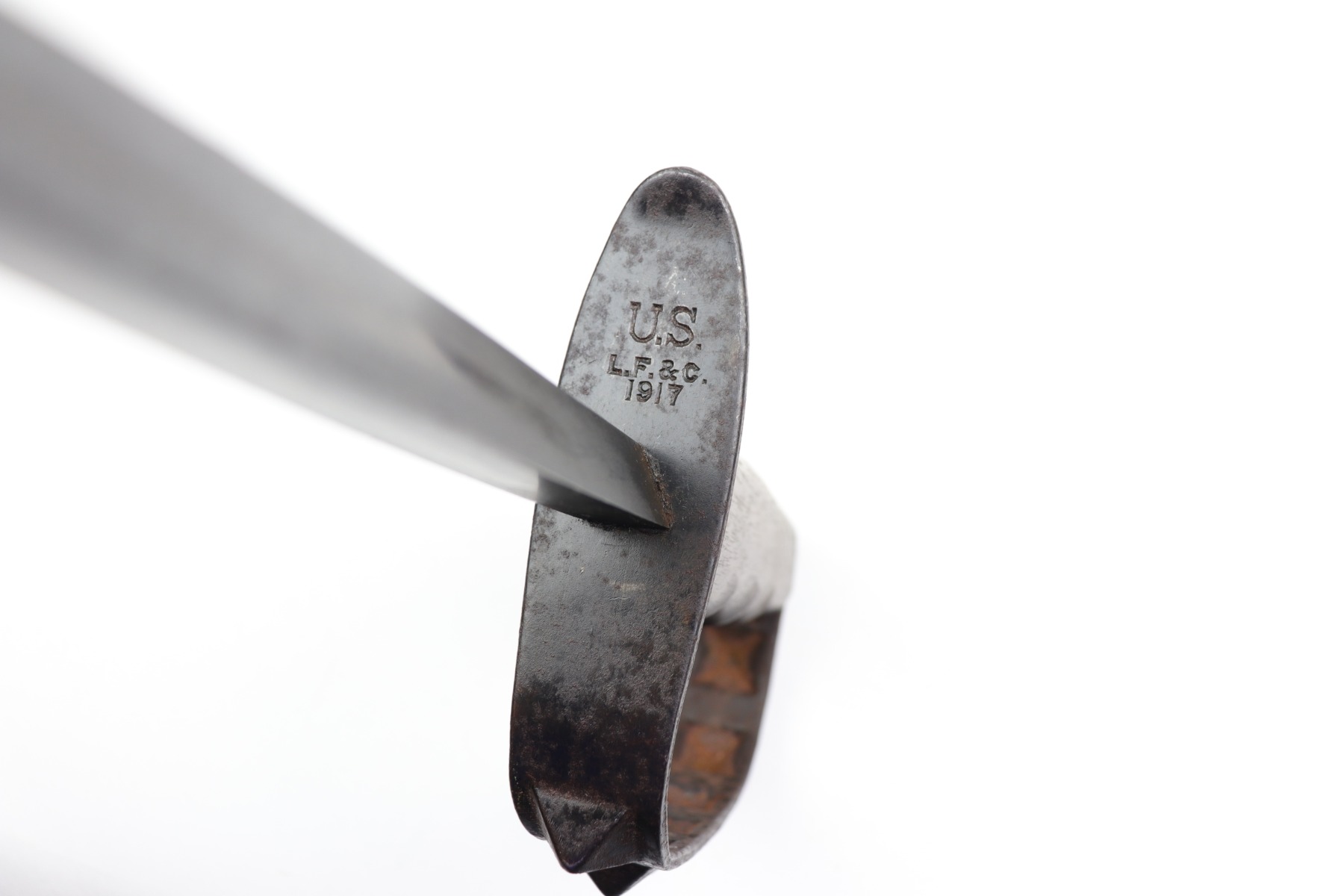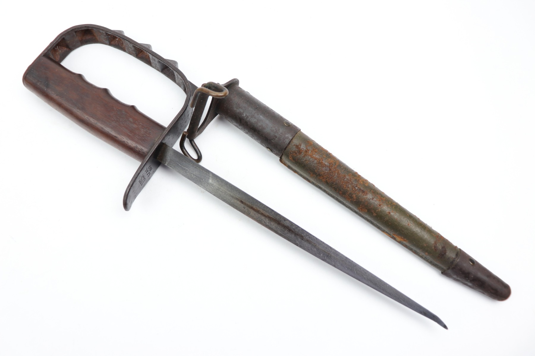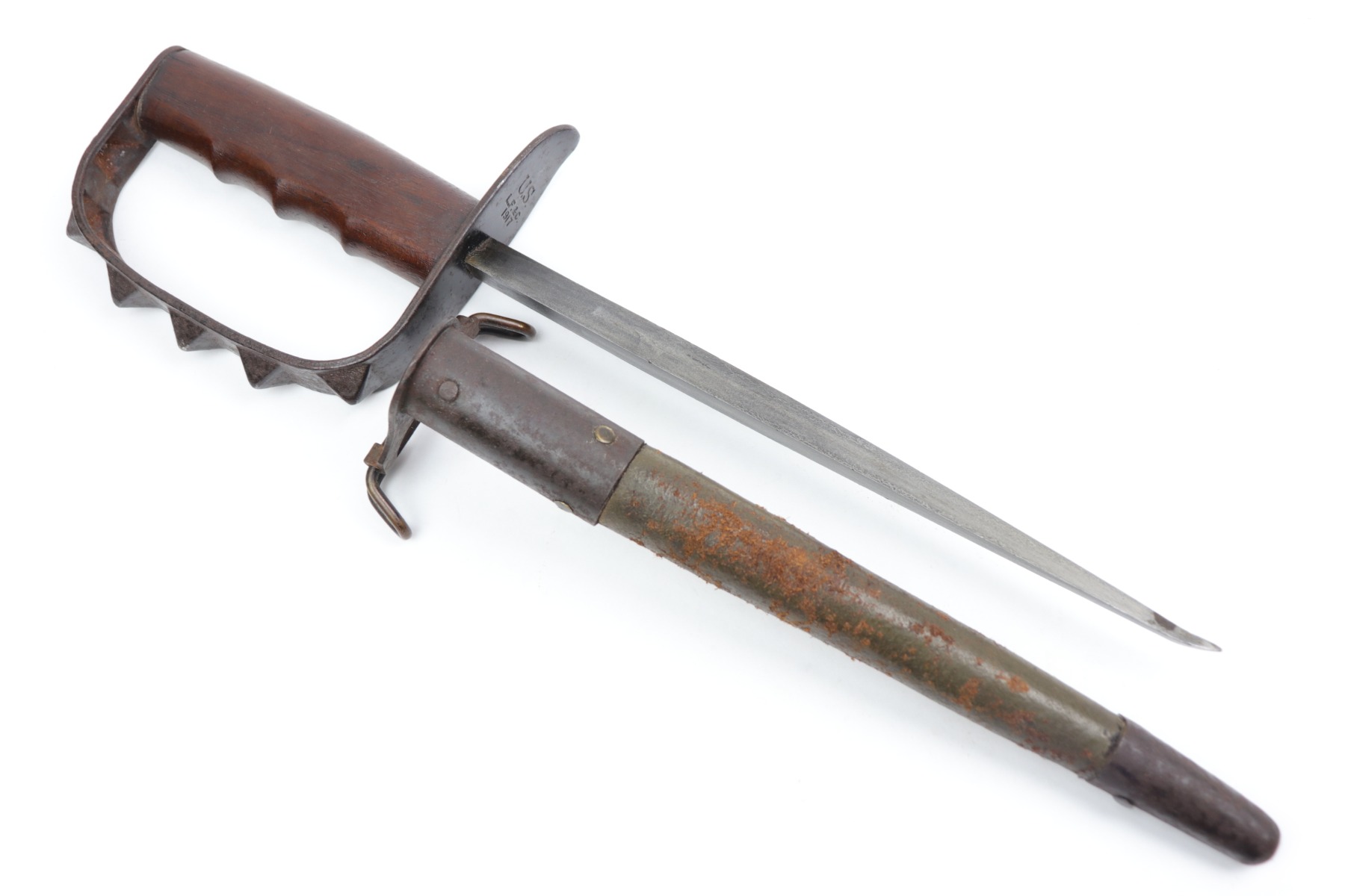 1/5/21 – This is an original 1917 dated L.F.&C. trench knuckle knife from WW1. The blued blade is in great shape but the tip is slightly bent – as shown in photos. The hand guard / knuckle guard has patina / surface rust throughout as shown in photos, but is worse around the knuckle portion. The wood handle is in great shape. Comes with the original scabbard that shows some honest wear throughout. There is surface rust on the metal parts, and the leather has surface wear. The toe of the leather has a tare that goes almost completely around the base and one of the pins in the metal toe of the sheath is missing. Priced accordingly.