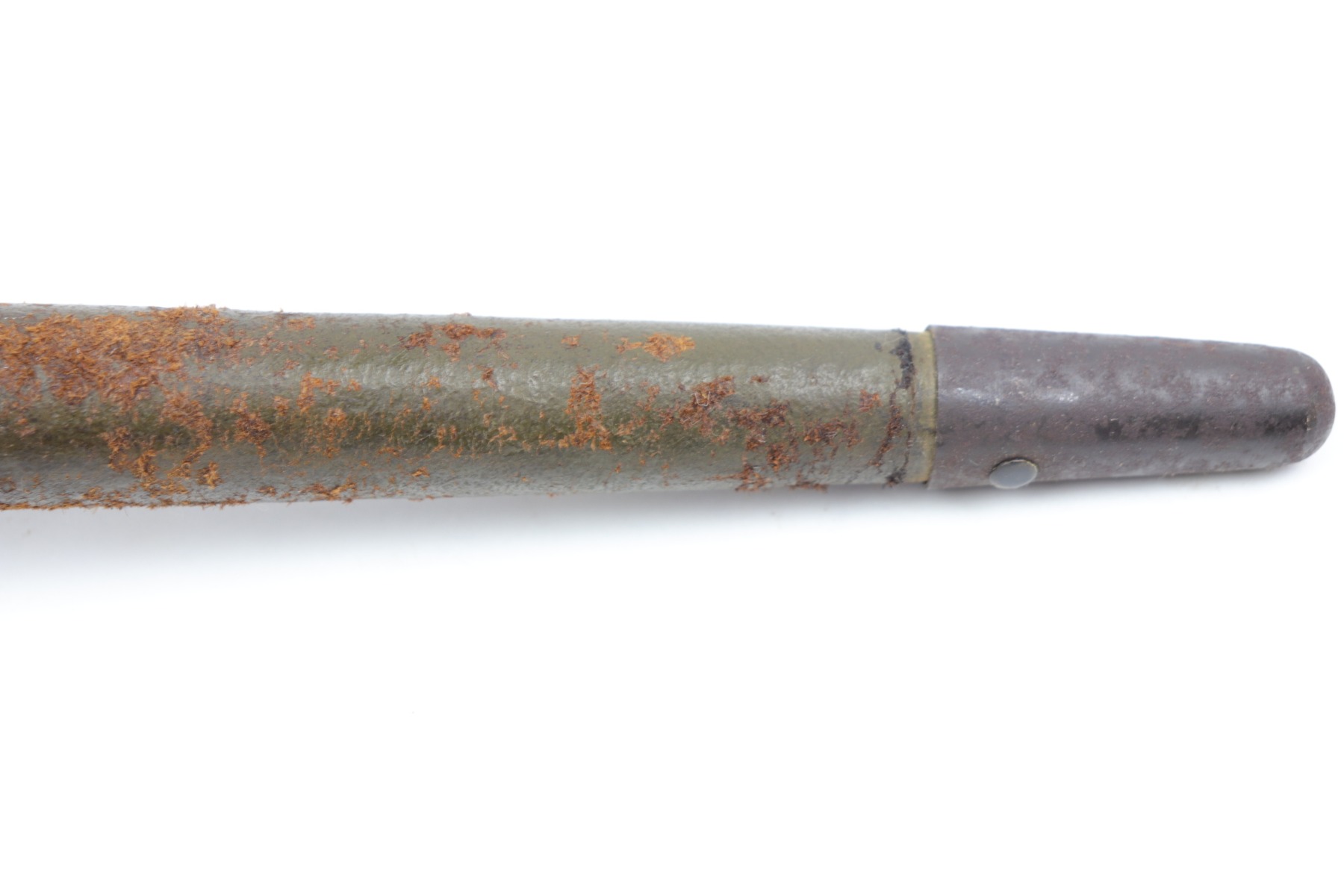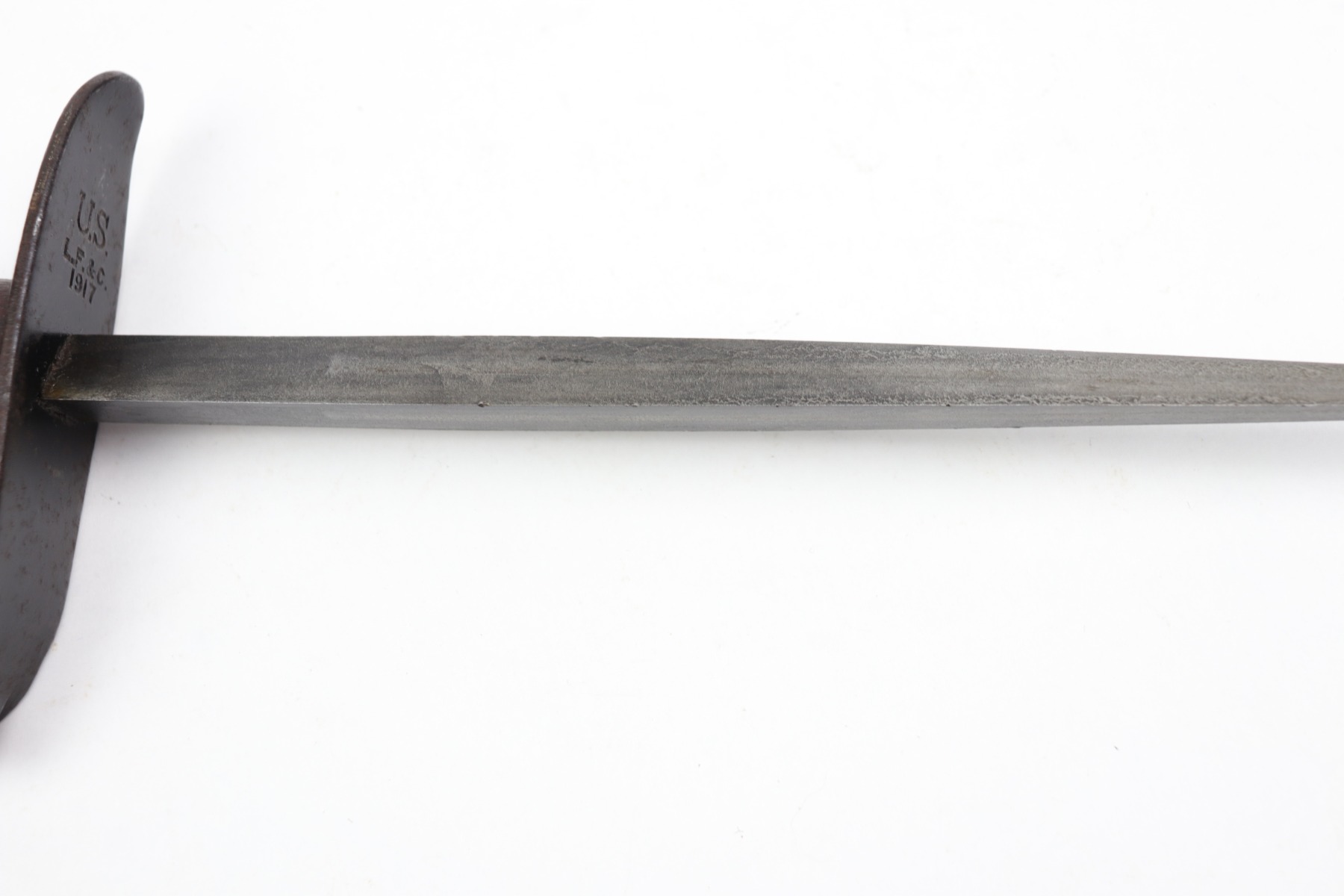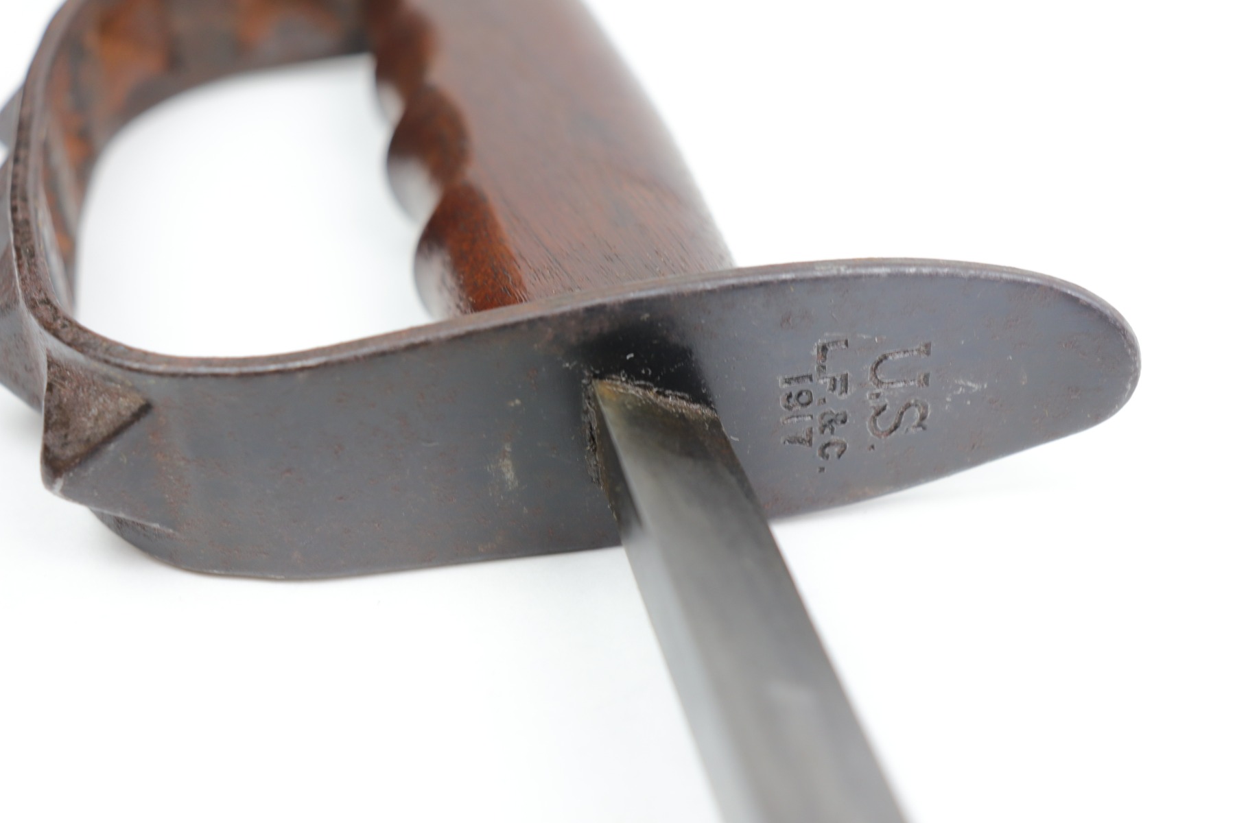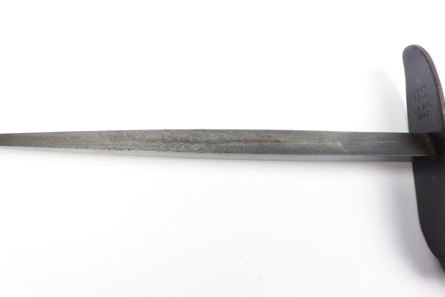 1/5/21 – This is an original 1917 dated L.F.&C. trench knuckle knife from WW1. The blued blade is in great shape but the tip is slightly bent – as shown in photos. The hand guard / knuckle guard has patina / surface rust throughout as shown in photos, but is worse around the knuckle portion. The wood handle is in great shape. Comes with the original scabbard that shows some honest wear throughout. There is surface rust on the metal parts, and the leather has surface wear. The toe of the leather has a tare that goes almost completely around the base and one of the pins in the metal toe of the sheath is missing. Priced accordingly.