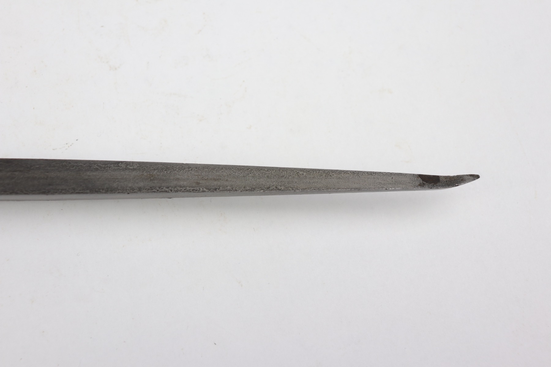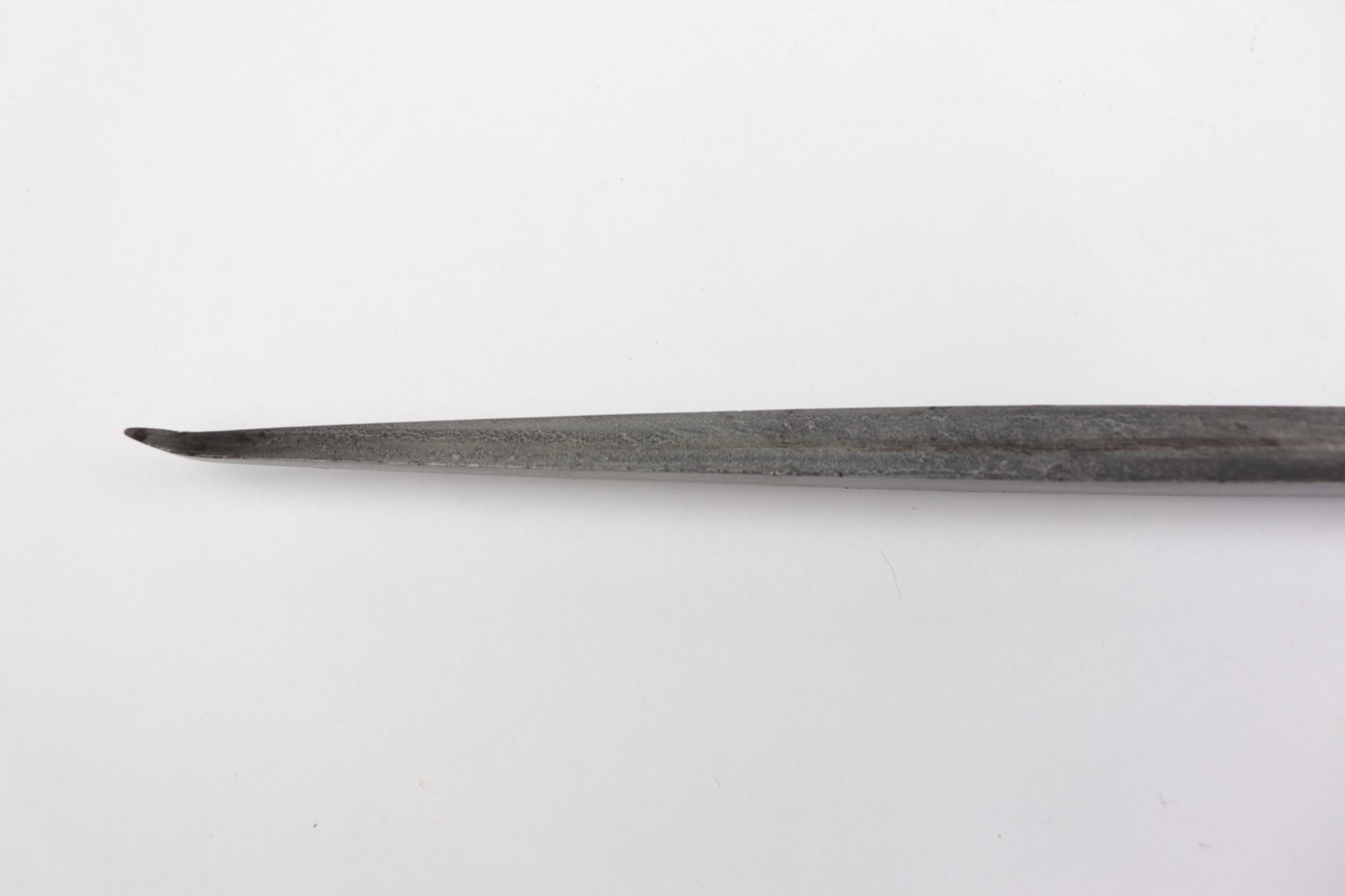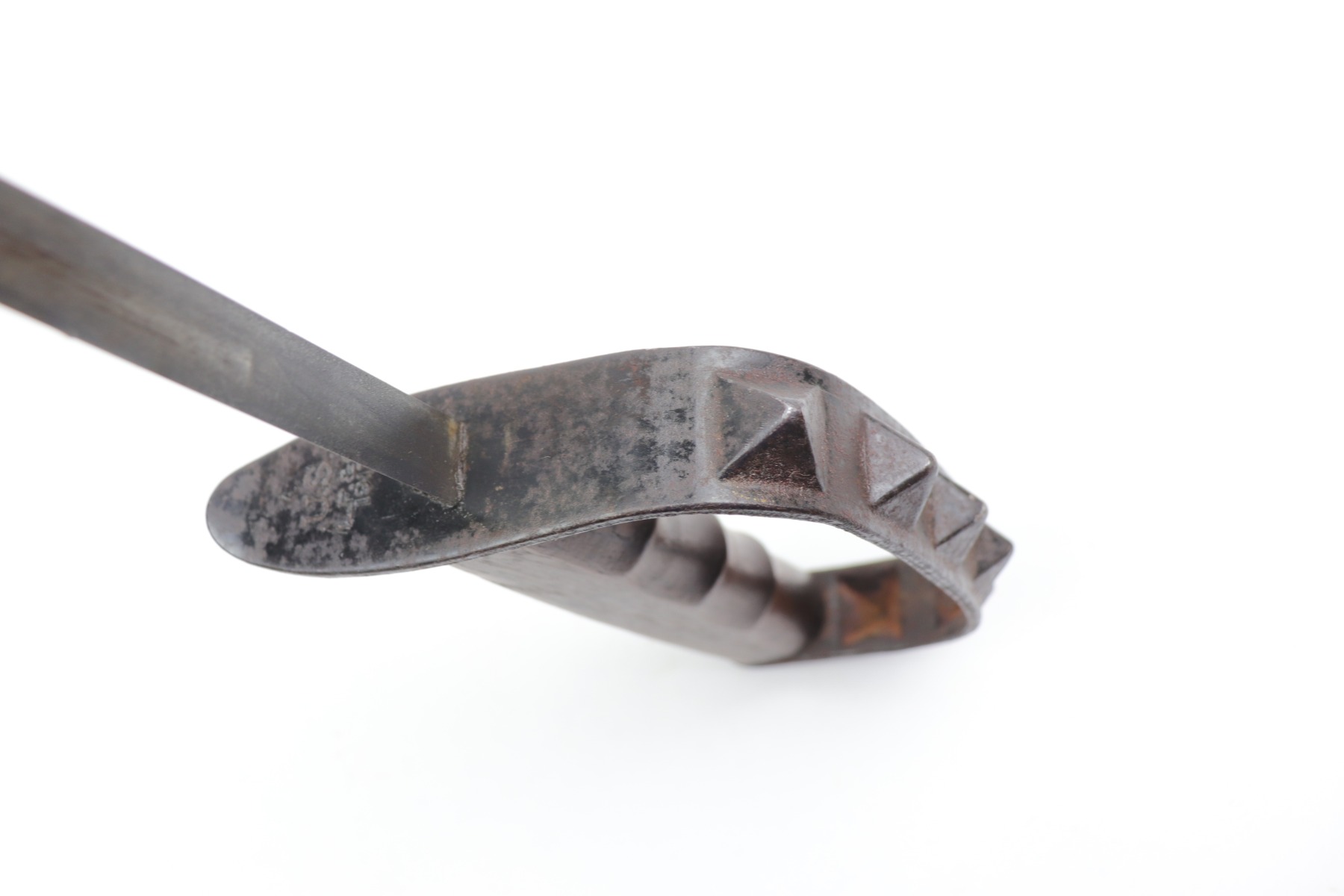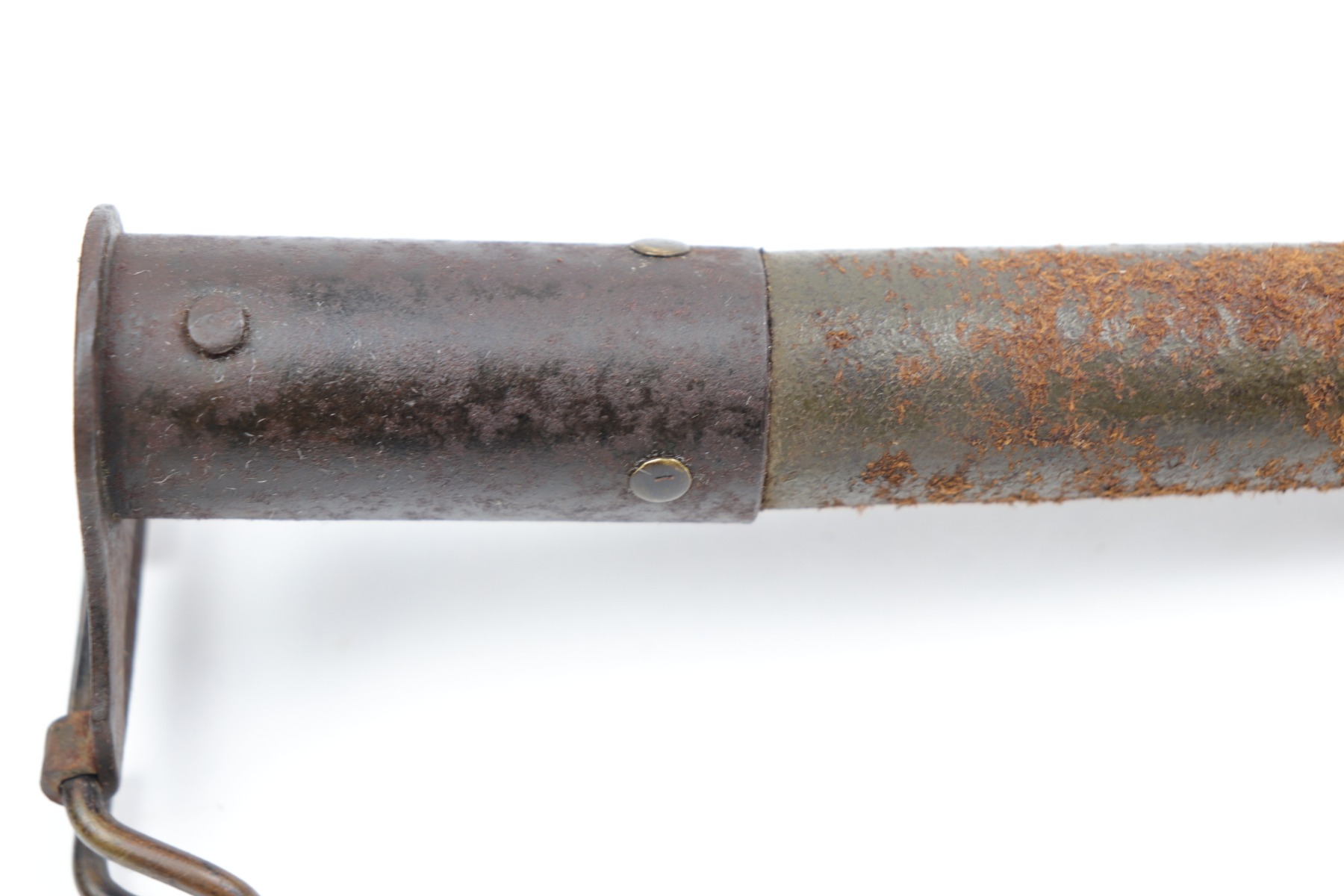 1/5/21 – This is an original 1917 dated L.F.&C. trench knuckle knife from WW1. The blued blade is in great shape but the tip is slightly bent – as shown in photos. The hand guard / knuckle guard has patina / surface rust throughout as shown in photos, but is worse around the knuckle portion. The wood handle is in great shape. Comes with the original scabbard that shows some honest wear throughout. There is surface rust on the metal parts, and the leather has surface wear. The toe of the leather has a tare that goes almost completely around the base and one of the pins in the metal toe of the sheath is missing. Priced accordingly.