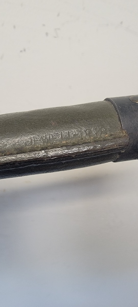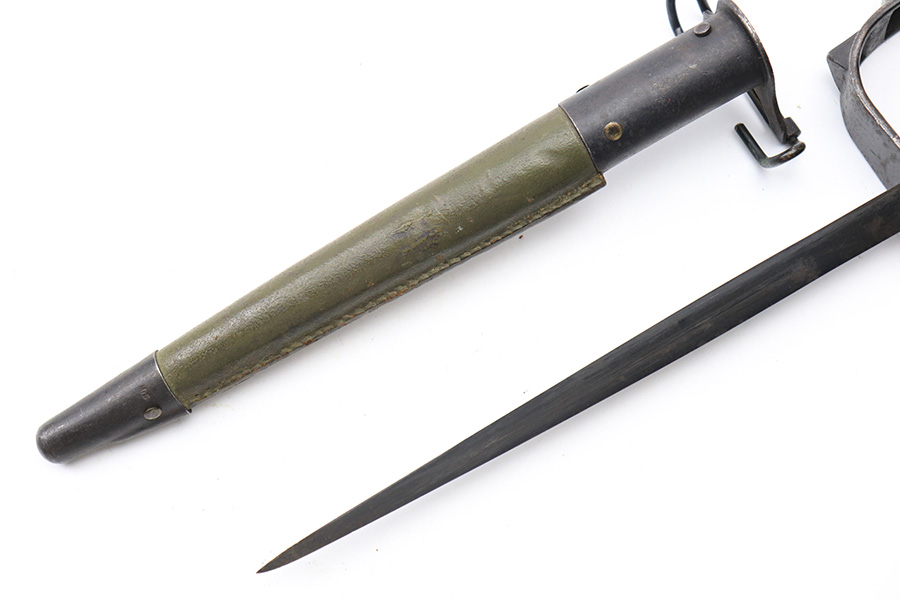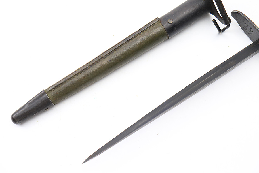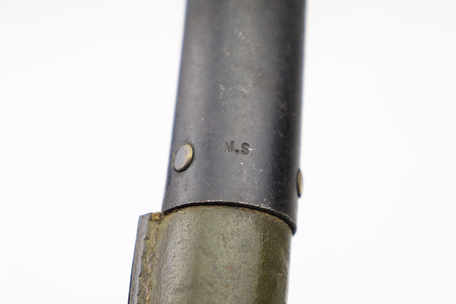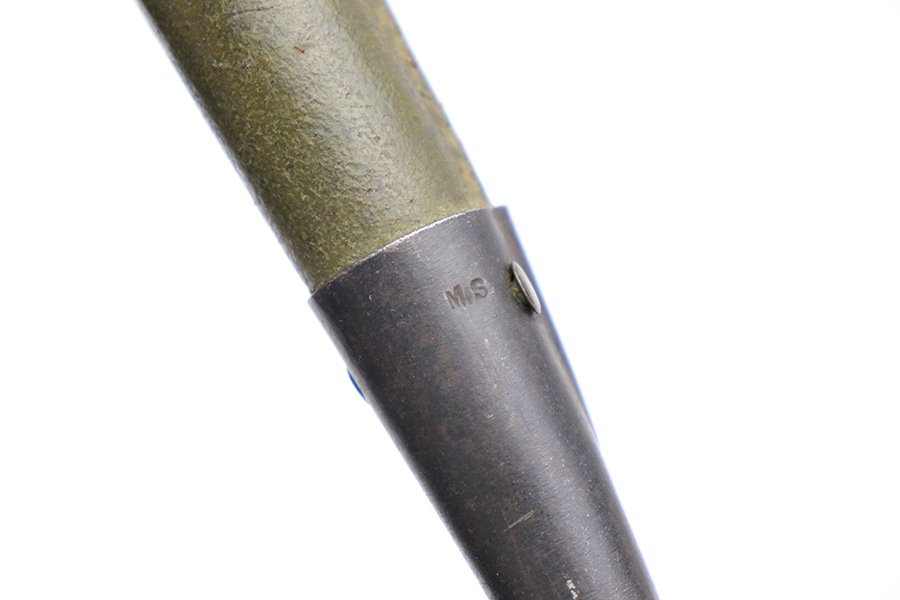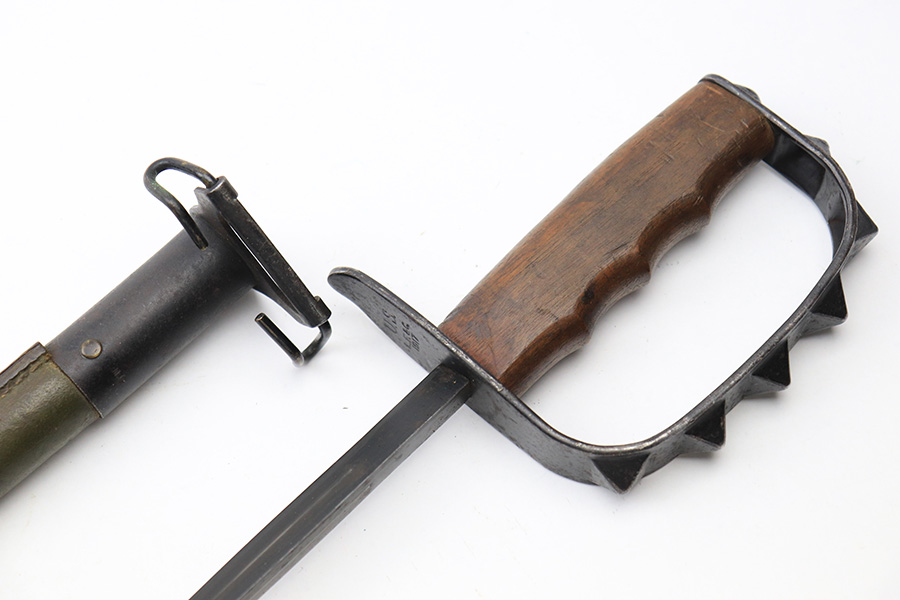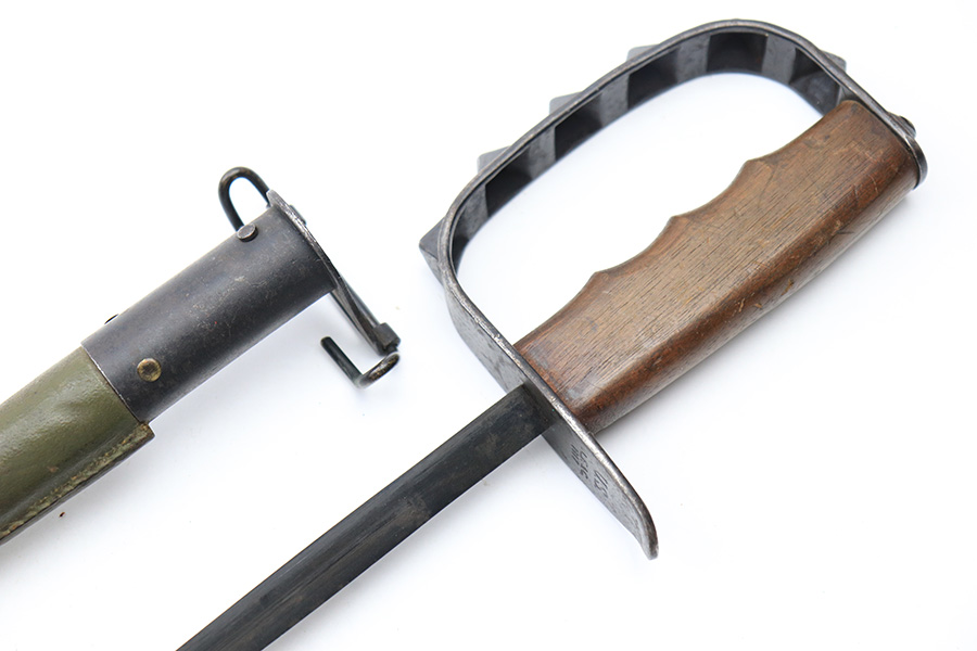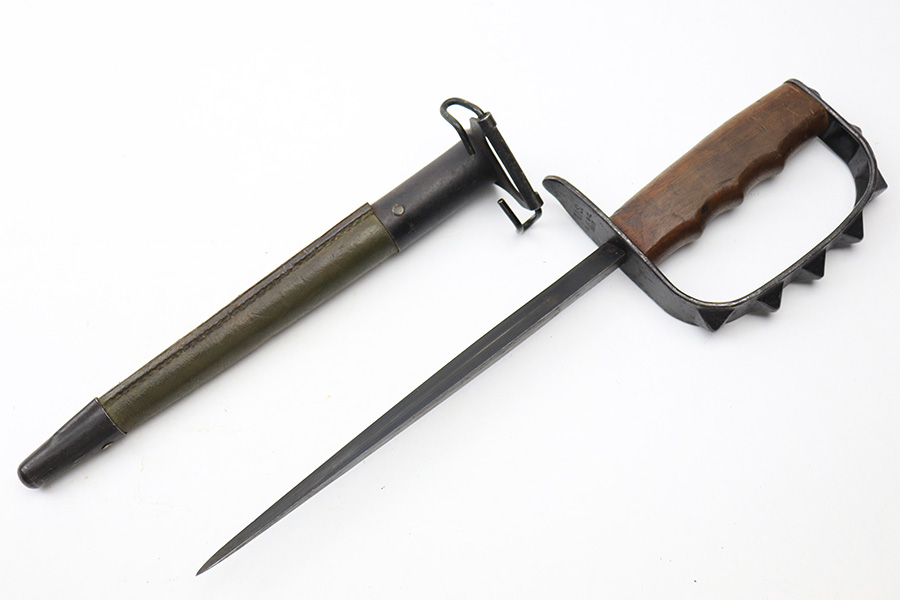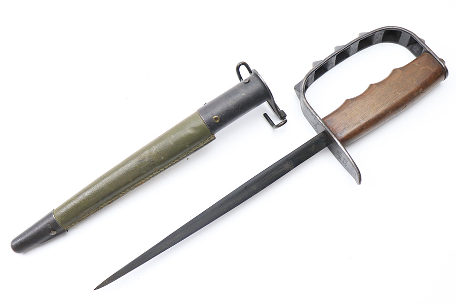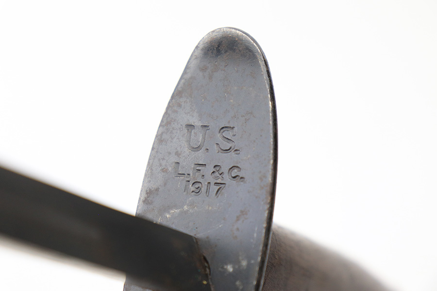 5/31/22 – This is an original US M1917 trench fighting knife from WW1. The knife features a blued spike blade that’s in excellent condition with most of the original finish in tact. No notable areas of rust or pitting, nor any notable flaws along the edges of the blade. The hand guard is maker stamped and dated, and has some light surface patina and spotty discoloration throughout the original blued finish. The wood handle has no cracks or chips. Comes with an original scabbard maker stamped by Jewell.