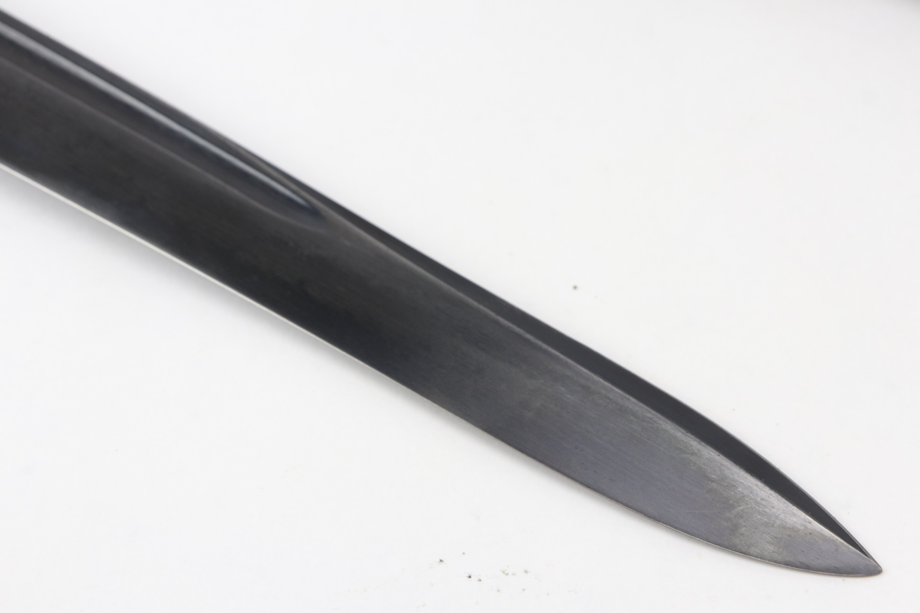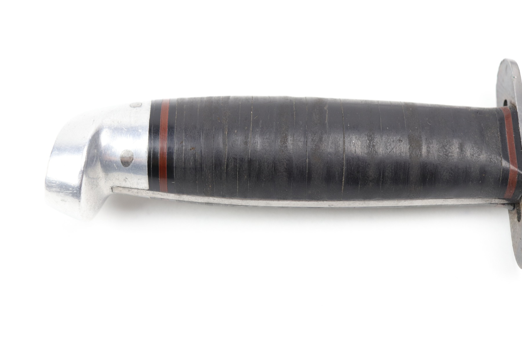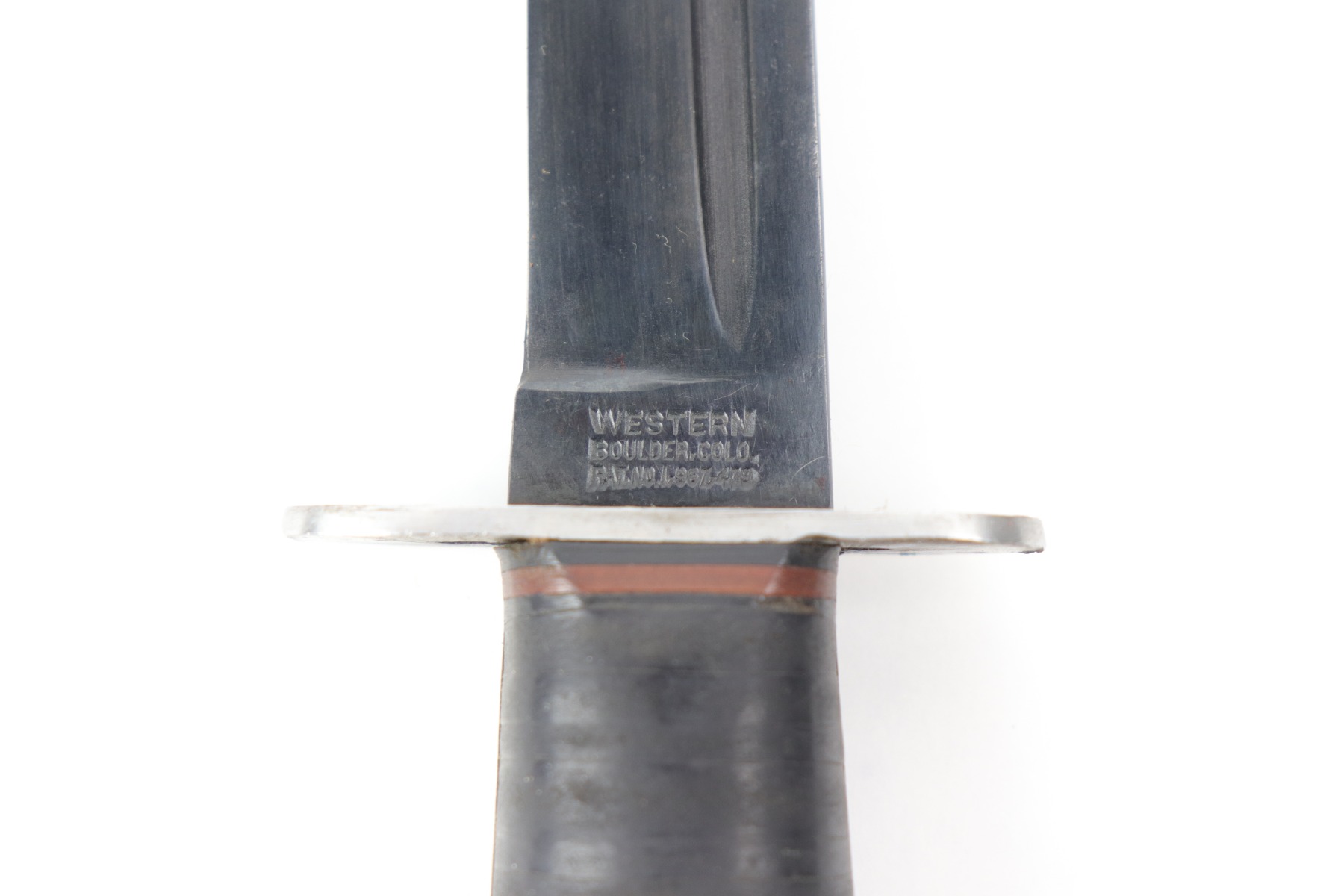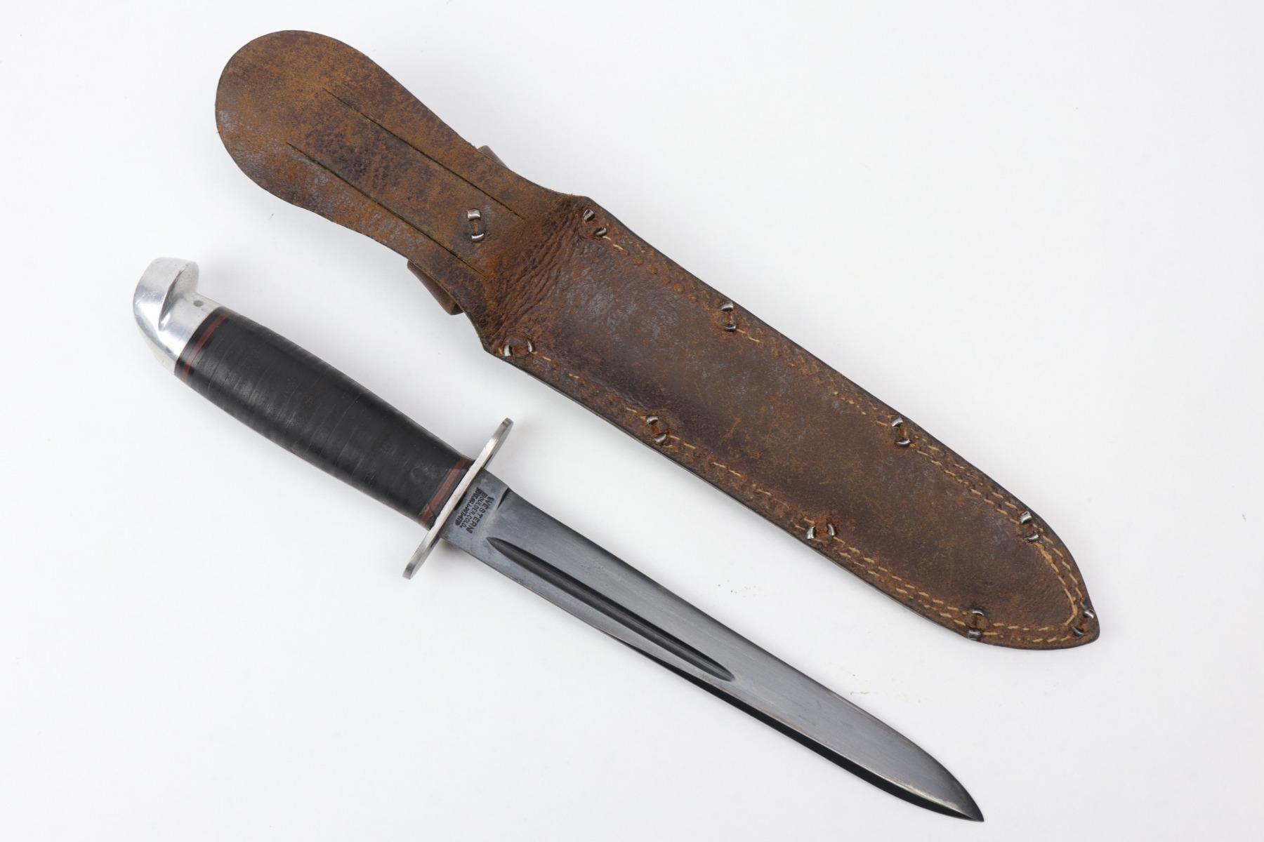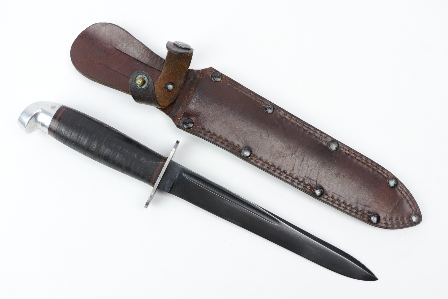 9/14/20 – This is a World War Two L77 Stiletto knife with correct Western sheath. The sheath is double stitched leather and all original. The pommel is stainless steel. The blade has some sheath wear due to age and use.
