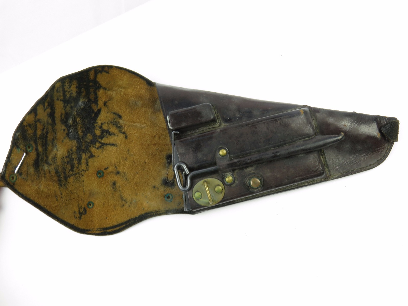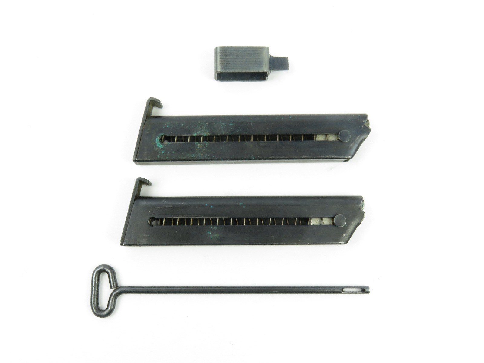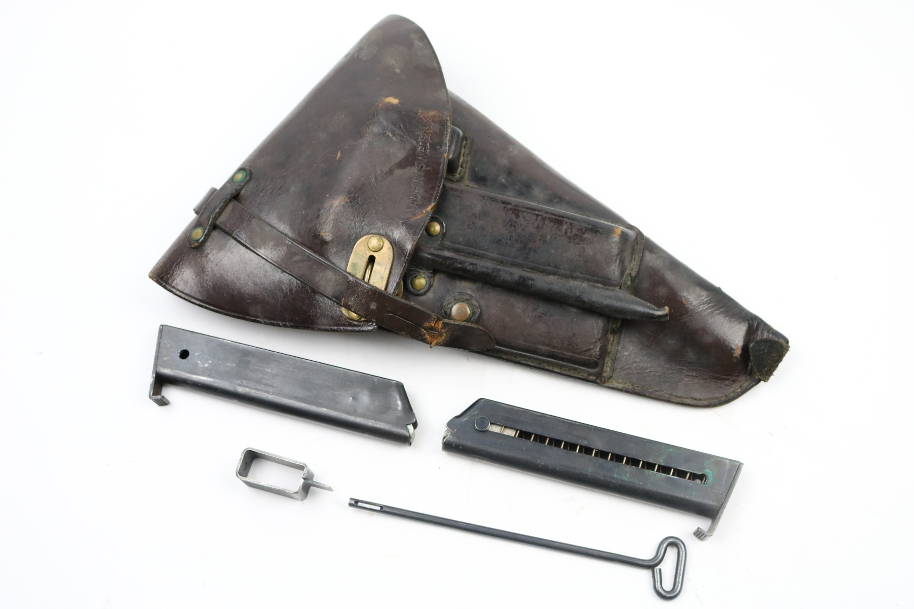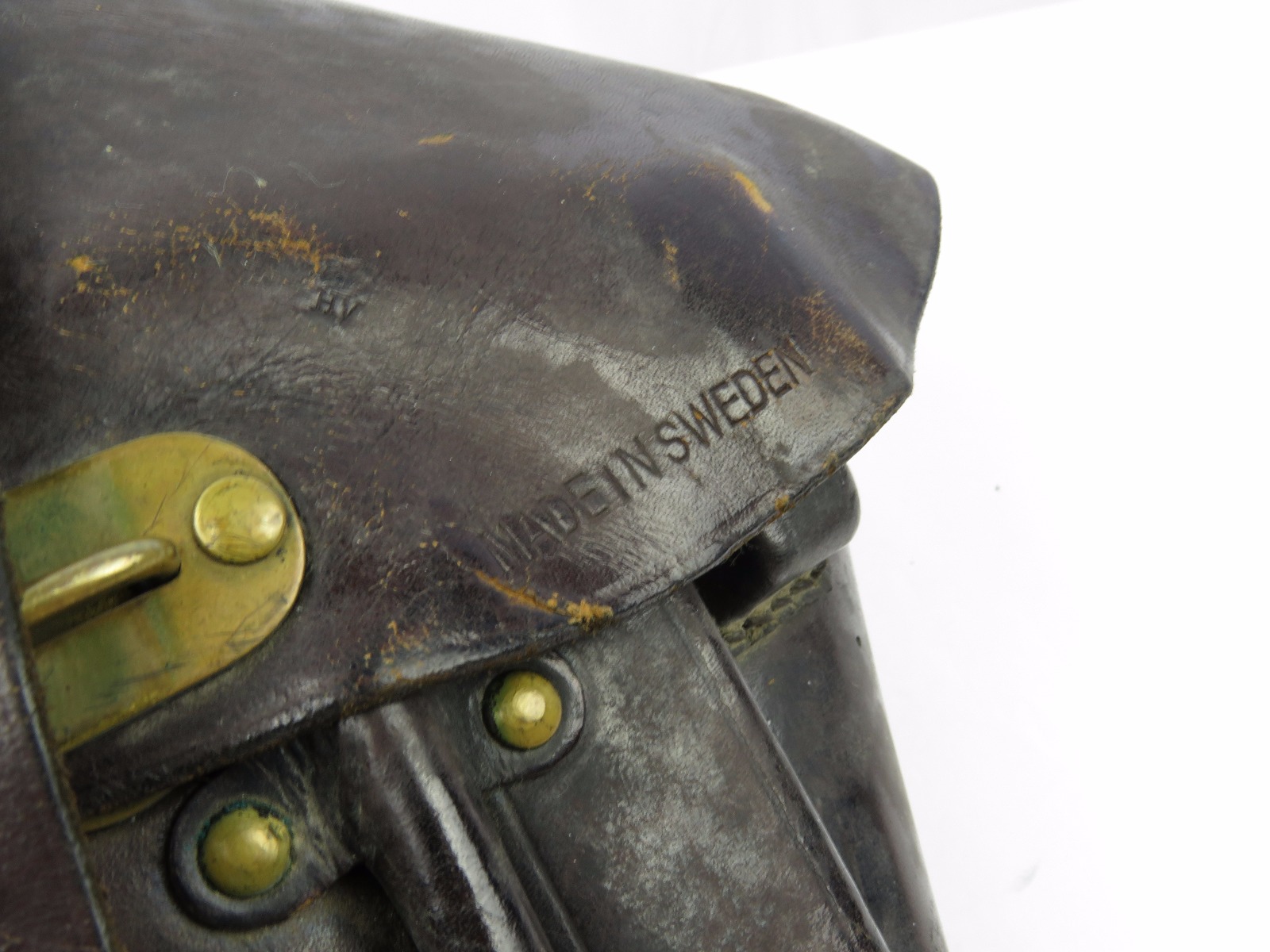 7/18/17 – This is an original Lahti m40 accessory set. The set includes two magazines, tool, cleaning rod, and holster. These all came together and are all original and authentic pieces. The holster is marked for export “MADE IN SWEDEN” and has a crown over “HV” proof stamp. The leather is soft and pliable but overall completely in tact and in good condition. The closure strap has some minor cracking near the hole, but is still in tact. The stitching is excellent and original. The magazines and tools are in great shape with no issues or markings. Guaranteed all original.
