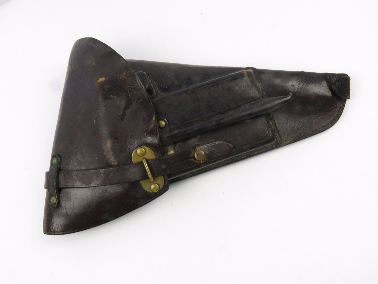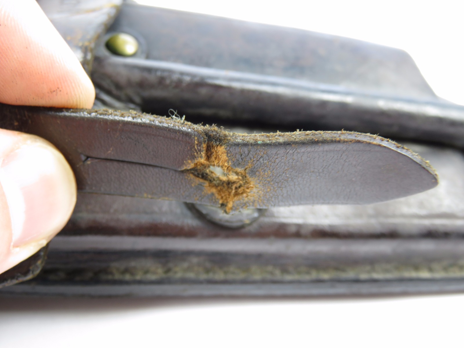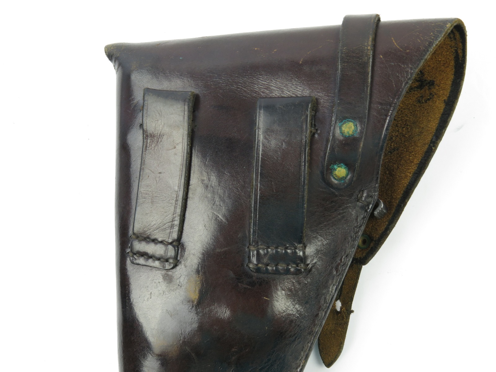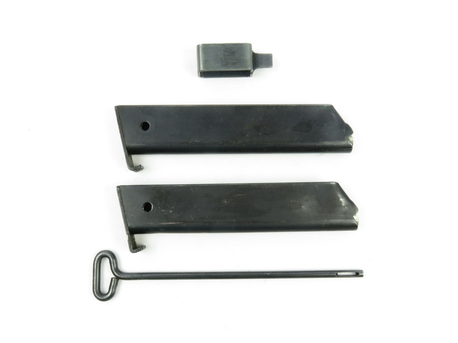 7/18/17 – This is an original Lahti m40 accessory set. The set includes two magazines, tool, cleaning rod, and holster. These all came together and are all original and authentic pieces. The holster is marked for export “MADE IN SWEDEN” and has a crown over “HV” proof stamp. The leather is soft and pliable but overall completely in tact and in good condition. The closure strap has some minor cracking near the hole, but is still in tact. The stitching is excellent and original. The magazines and tools are in great shape with no issues or markings. Guaranteed all original.