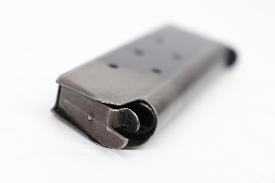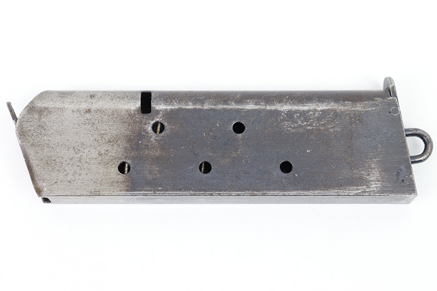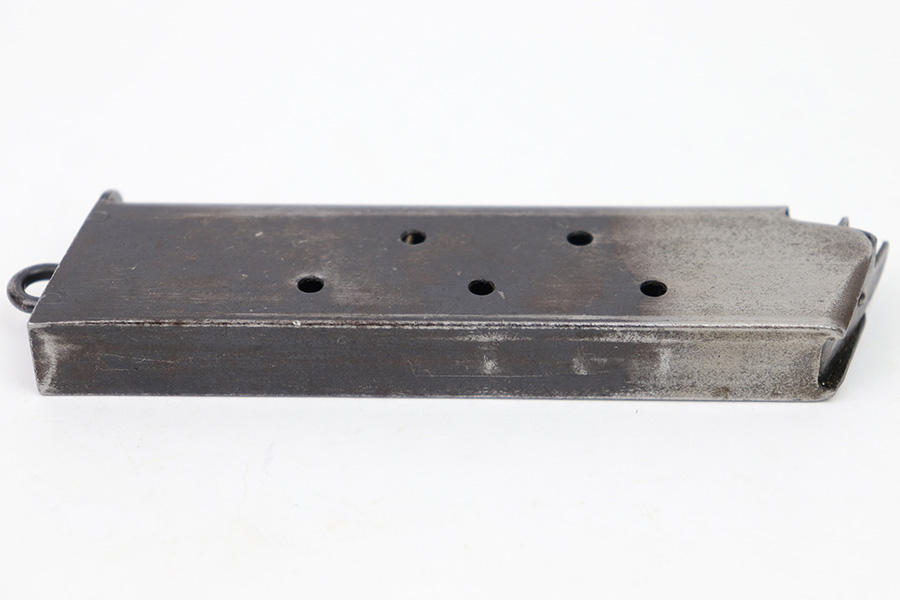 1/20/23 – This is an original WW1 era Colt 1911 magazine. The magazine has a lanyard loop on the base, and two toned finish on the tube. The blued portion of the magazine has some thinning to the finish and surface patina throughout. There is no rust or pitting however, and the magazine is in very good overall condition. No external markings or stamps and a fully functional spring.