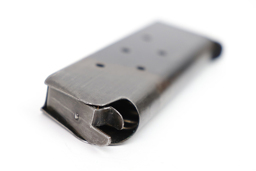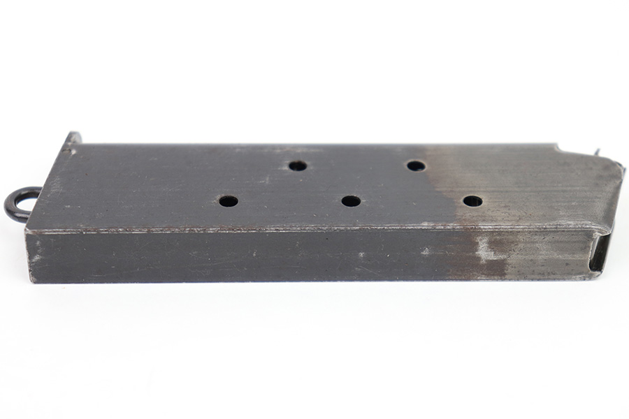 1/20/23 – This is an original WW1 early production Colt M1911 magazine. The magazine features a two-tone blued and steel finish, with the lower portion of the magazine being blued. The bluing is in great condition throughout with some mild surface patina and typical signs of aging but no rust or pitting. The base has an attached lanyard loop. There are no markings or stamps. Great overall condition with a fully functional spring.