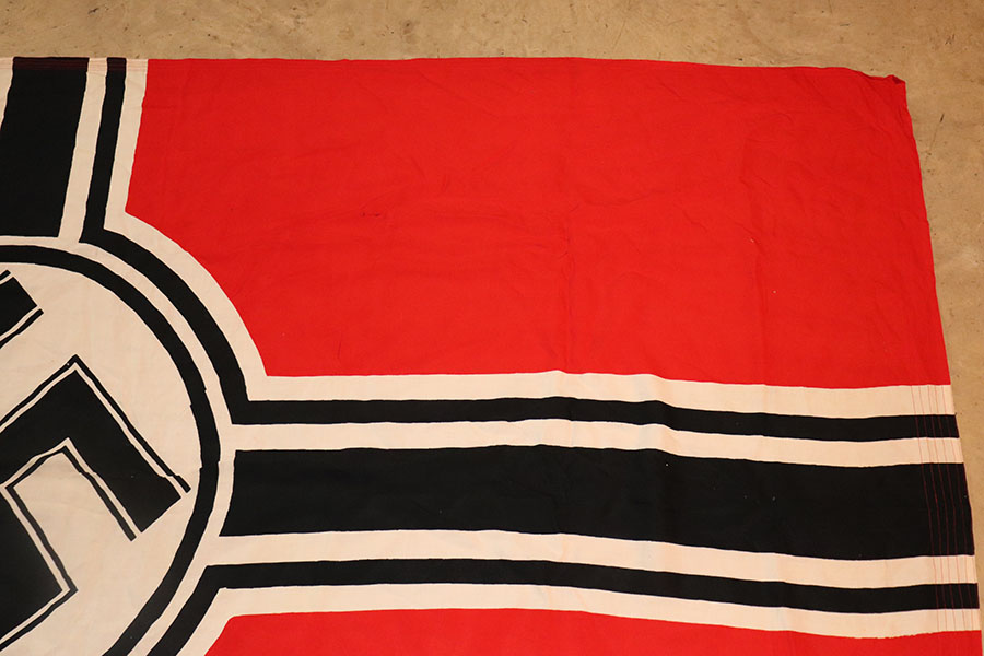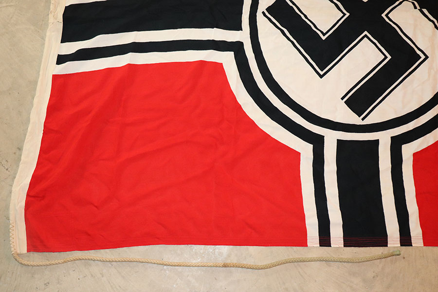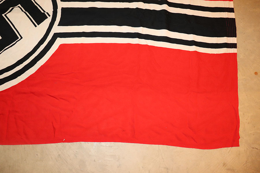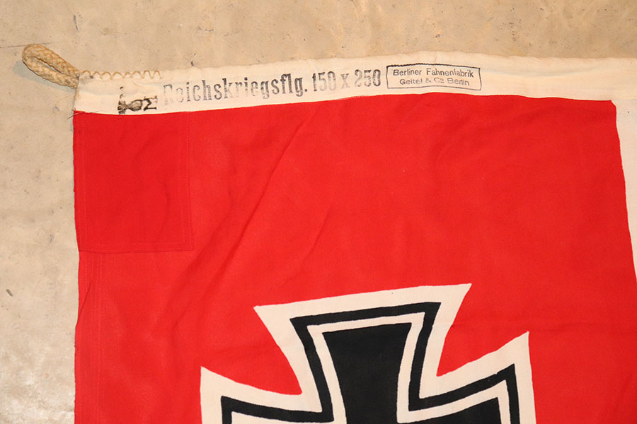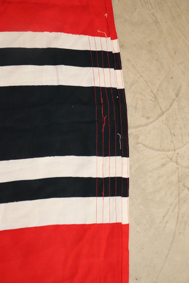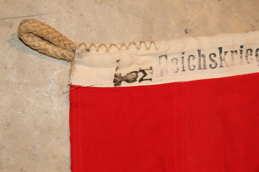 6/28/21 – This is a large Nazi Kriegsmarine banner flag. Complete with the original rope still in tact. The top of the flag is ink stamped, as shown. Measures 250×150 cm, which is roughly 5 feet wide and a little over 8 feet long. Ink stamp is complete and shows maker information as well. Generally in great condition with only some very minor wear / damage.