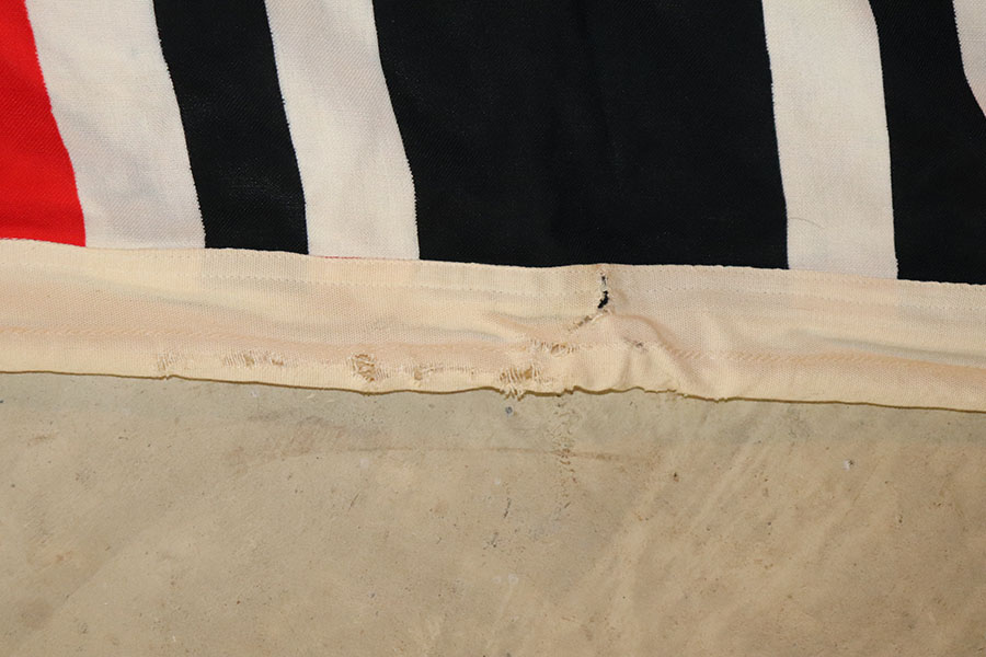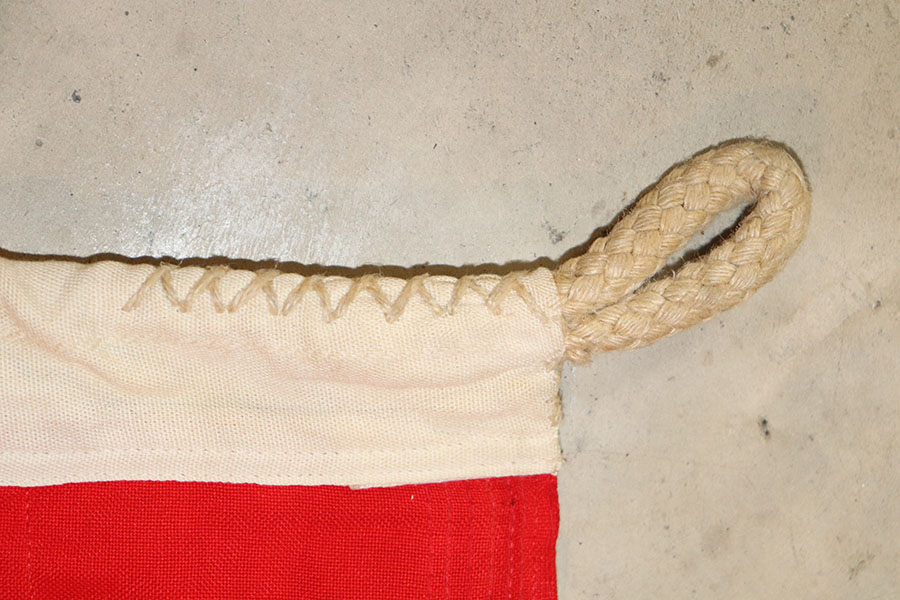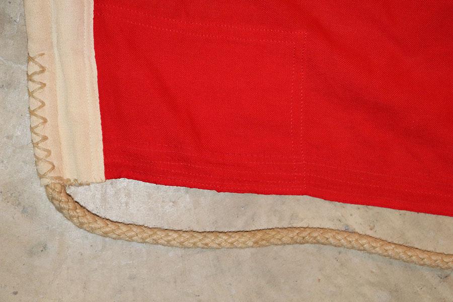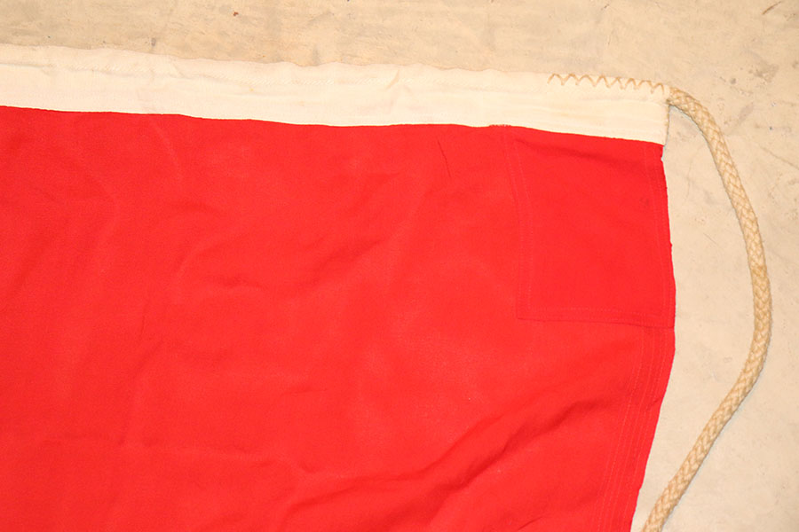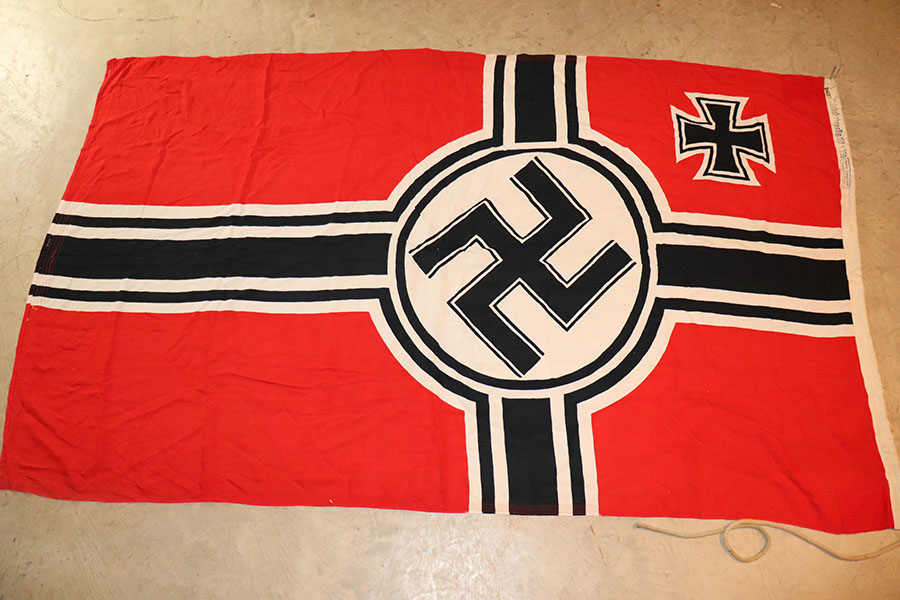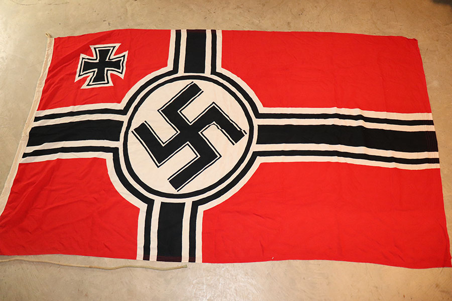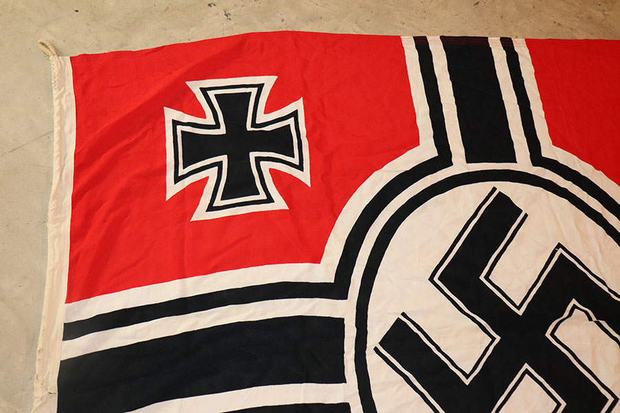 6/28/21 – This is a large Nazi Kriegsmarine banner flag. Complete with the original rope still in tact. The top of the flag is ink stamped, as shown. Measures 250×150 cm, which is roughly 5 feet wide and a little over 8 feet long. Ink stamp is complete and shows maker information as well. Generally in great condition with only some very minor wear / damage.