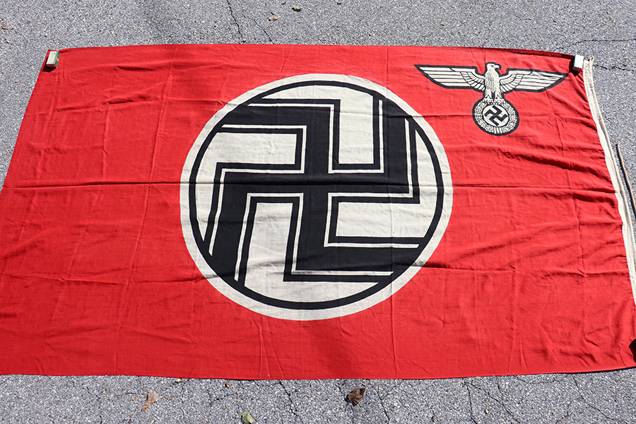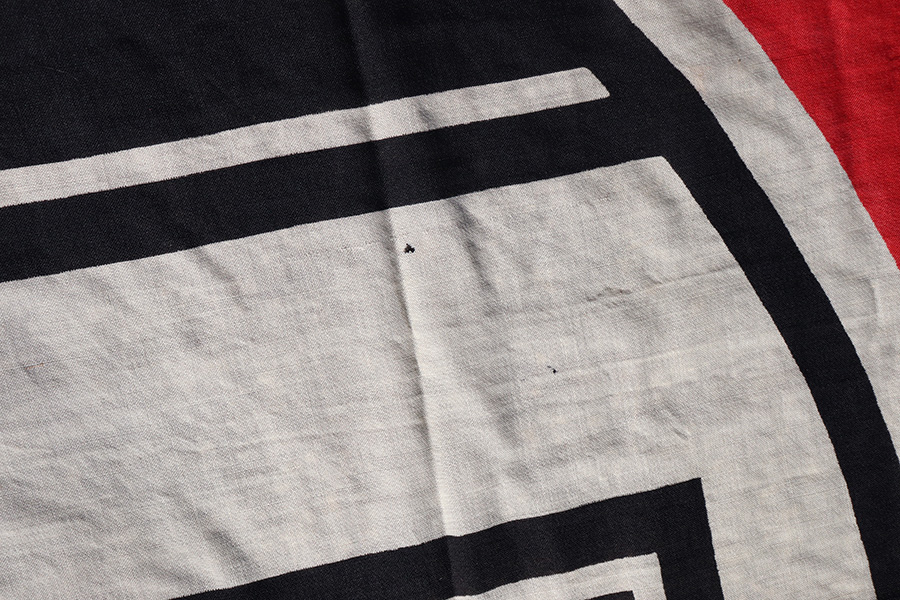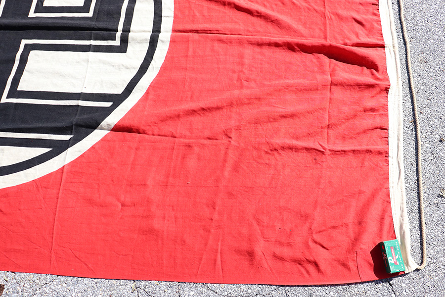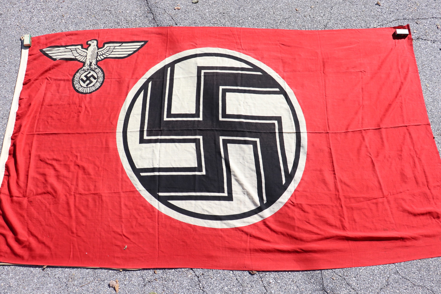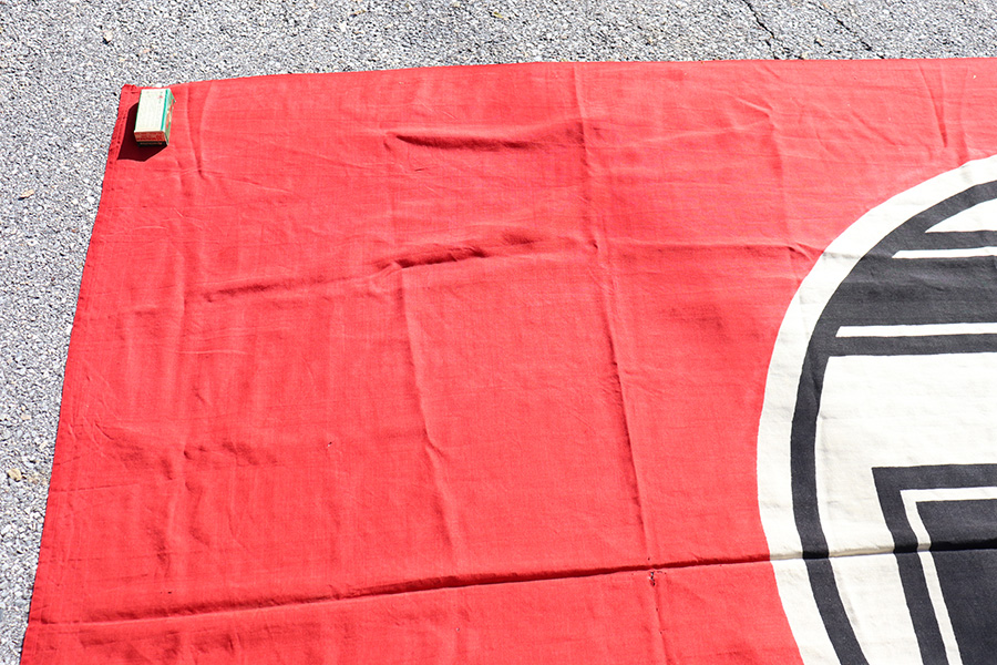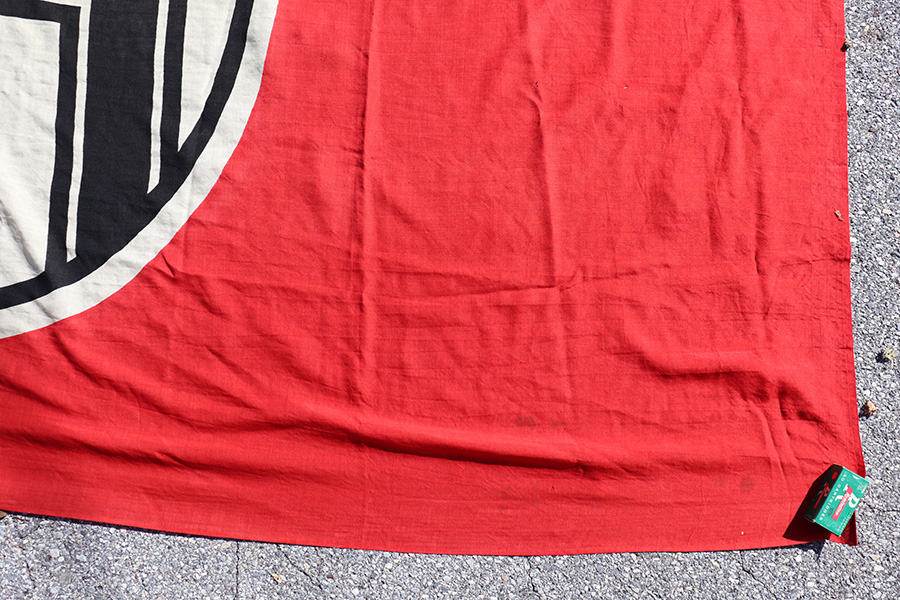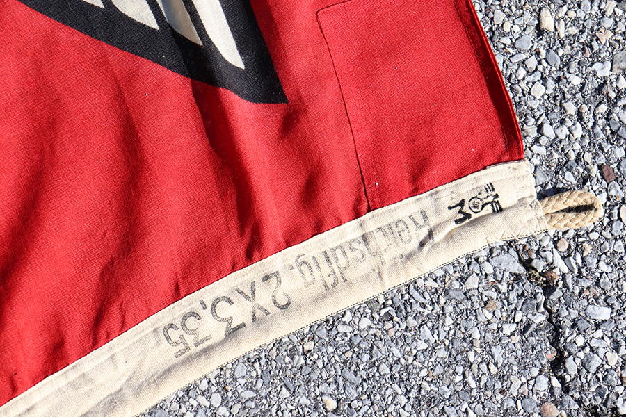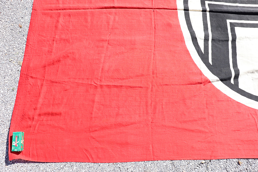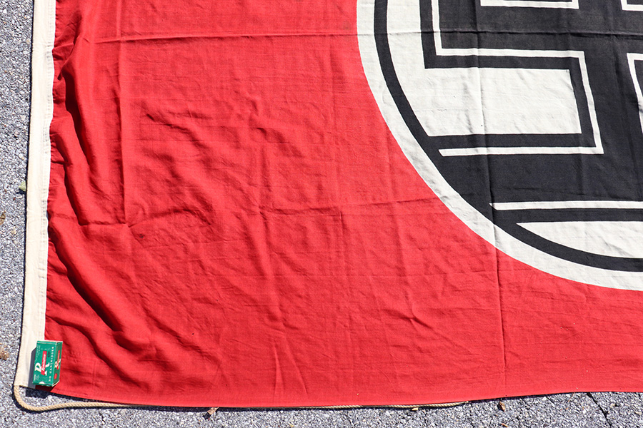 10/11/22 – This is a very large 2 x 3.35 meter (approx. 6.5 x 11 feet) Kriegsmarine banner flag. The flag is in great condition with no major holes, tares, or stitching issues. The hoist still has the original rope / hanging chord intact. The hoist is also ink stamped with dimension information as well as an eagle/M navy proof stamp. No frayed edges or notable issues. The small ammo boxes shown in photos are to hold the flag in place for photos and are not included with the flag.