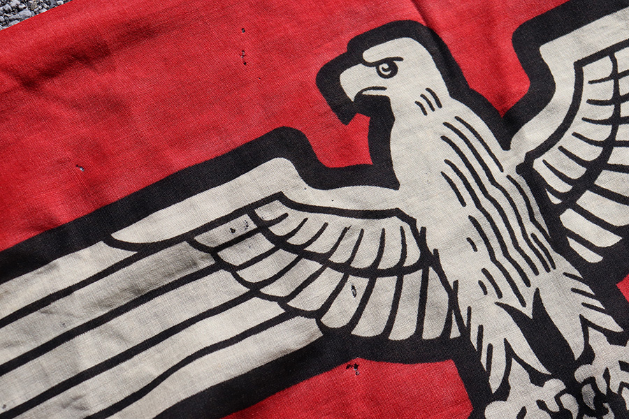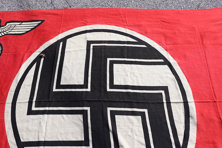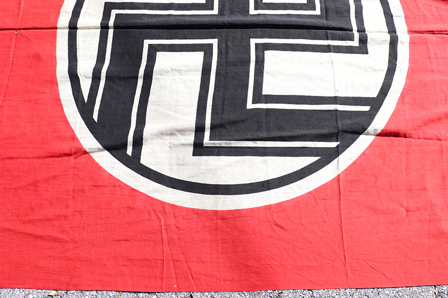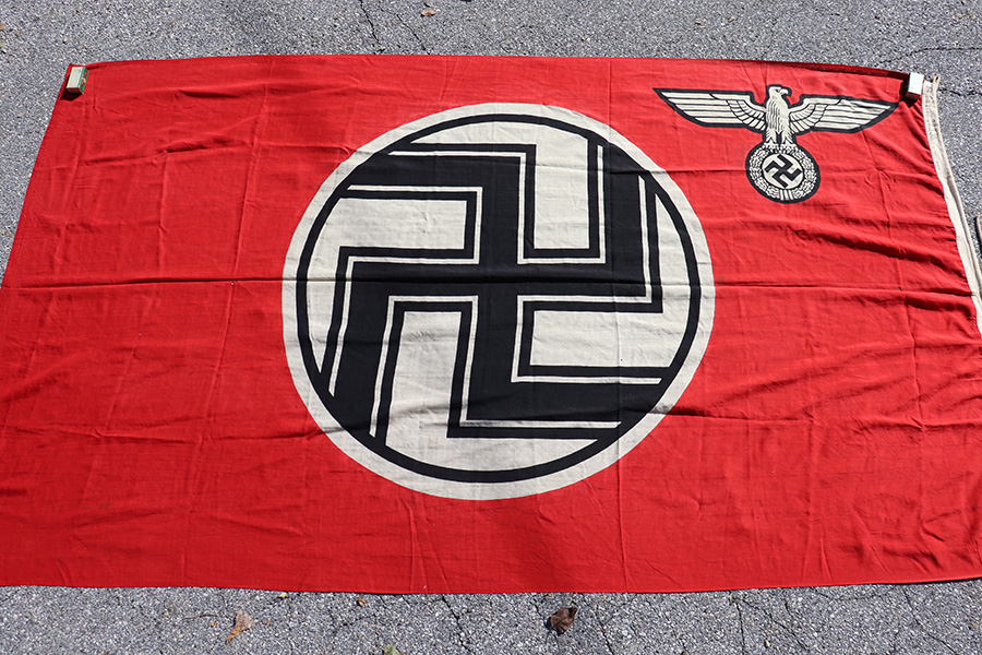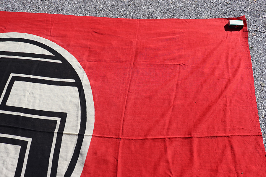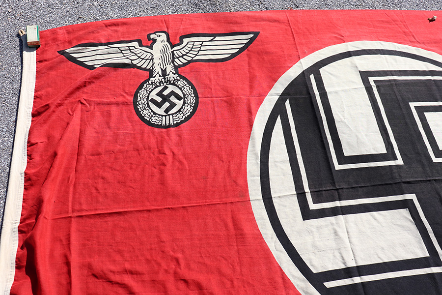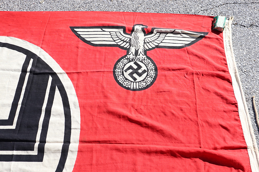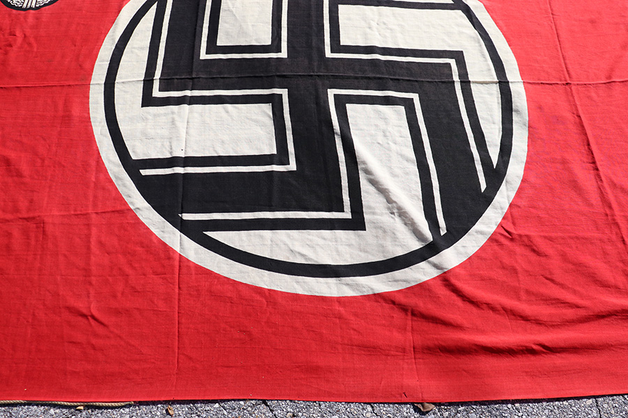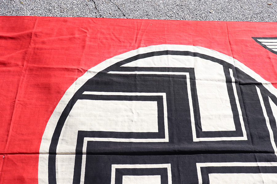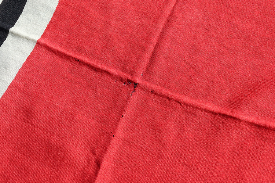 10/11/22 – This is a very large 2 x 3.35 meter (approx. 6.5 x 11 feet) Kriegsmarine banner flag. The flag is in great condition with no major holes, tares, or stitching issues. The hoist still has the original rope / hanging chord intact. The hoist is also ink stamped with dimension information as well as an eagle/M navy proof stamp. No frayed edges or notable issues. The small ammo boxes shown in photos are to hold the flag in place for photos and are not included with the flag.