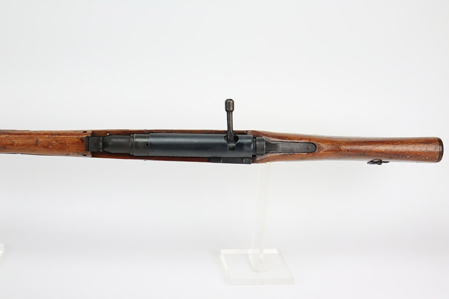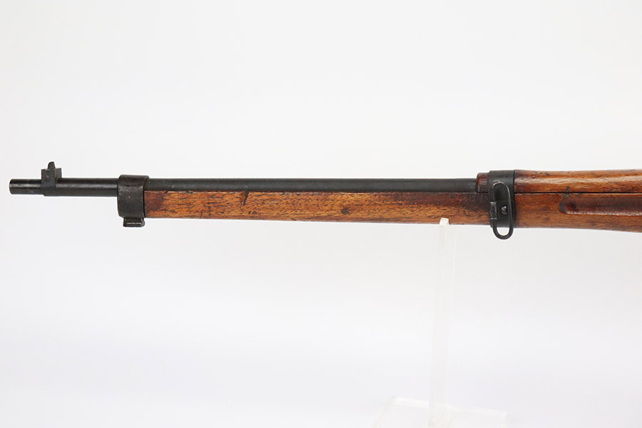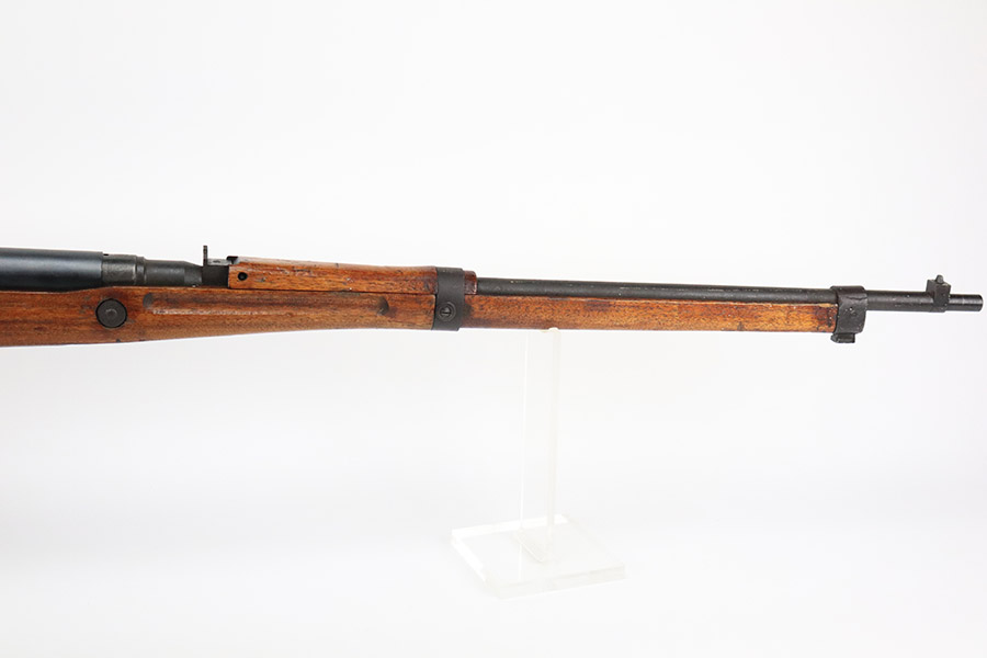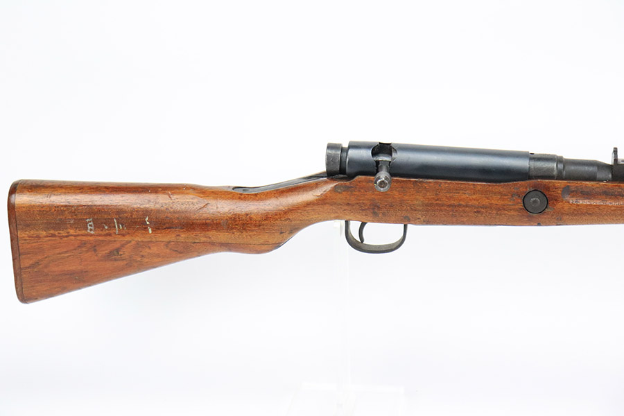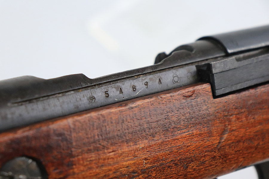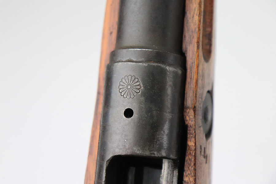 12/8/22 – This is a very nice excellent example of a “last-ditch” Arisaka Type 99 rifle issued to the Japanese military at the very end of WW2. It is mismatched but has the proper late war features such as crude bolt handle, peep rear sight, wood butt plate, and rough machining throughout. The imperial mum stamp on the receiver is fully intact. There is very little actual finish loss, but there are tiny dots of oxidation and light brown patina throughout. Some minor pitting along the barrel. Very nice wood stock in above-average condition for these late-war guns. There are, however, some tiny dots of white paint here and there and a small filled-in hole near the floor plate. Comes with a very nice reproduction dust cover. Very nice bore with good rifling.