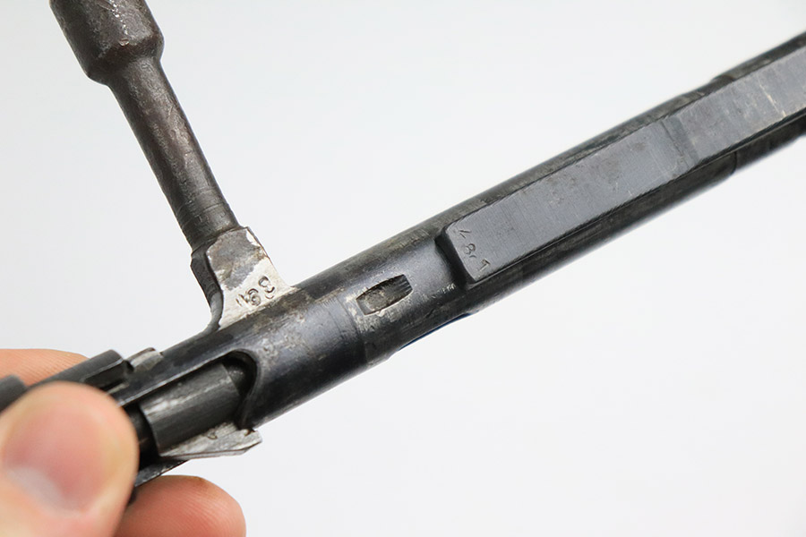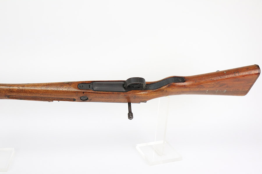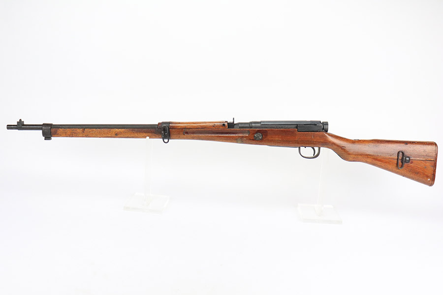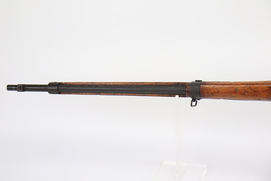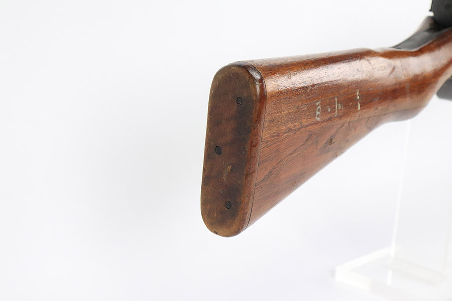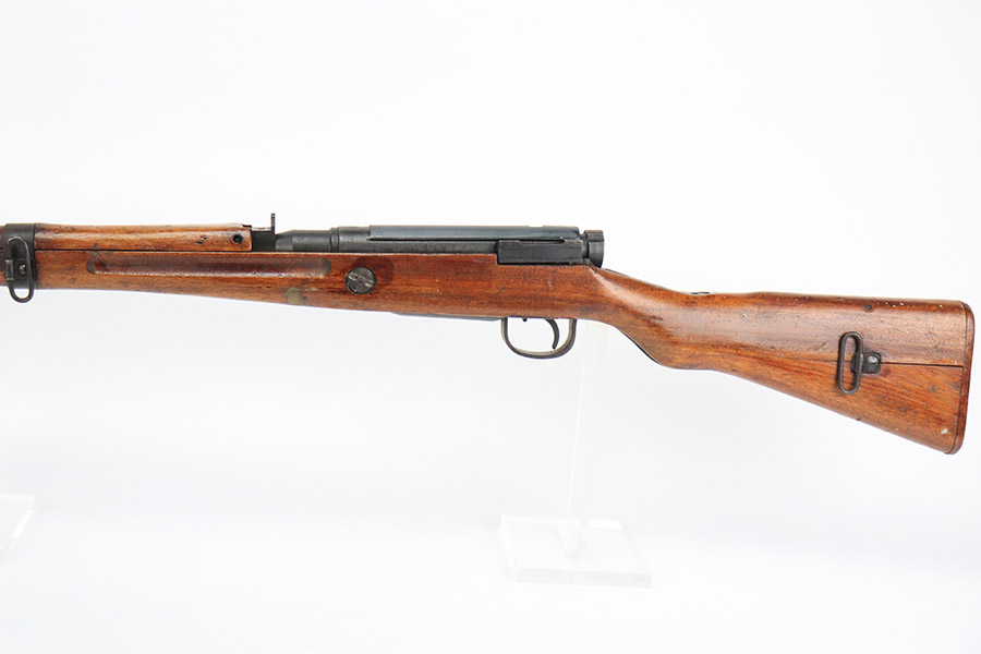 12/8/22 – This is a very nice excellent example of a “last-ditch” Arisaka Type 99 rifle issued to the Japanese military at the very end of WW2. It is mismatched but has the proper late war features such as crude bolt handle, peep rear sight, wood butt plate, and rough machining throughout. The imperial mum stamp on the receiver is fully intact. There is very little actual finish loss, but there are tiny dots of oxidation and light brown patina throughout. Some minor pitting along the barrel. Very nice wood stock in above-average condition for these late-war guns. There are, however, some tiny dots of white paint here and there and a small filled-in hole near the floor plate. Comes with a very nice reproduction dust cover. Very nice bore with good rifling.