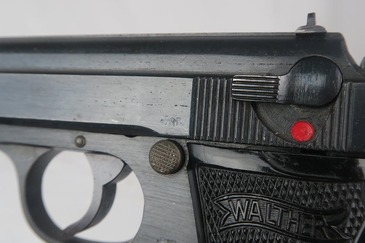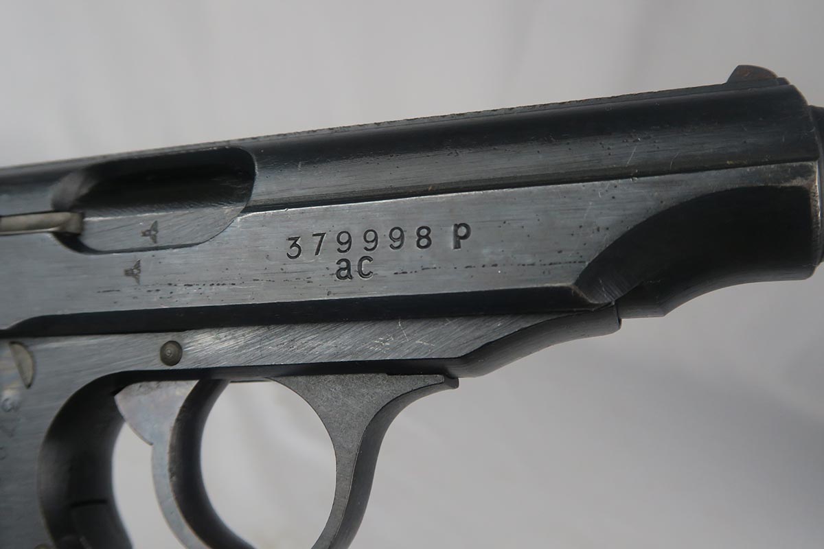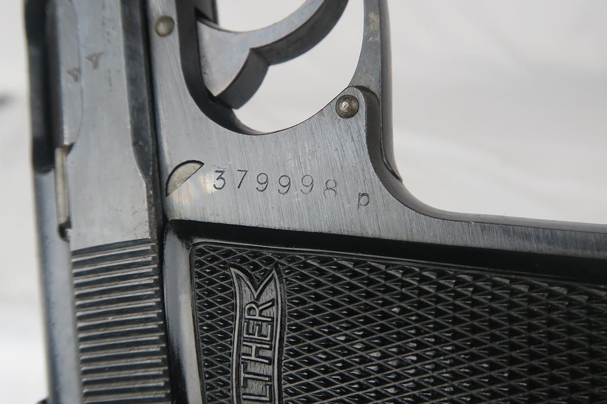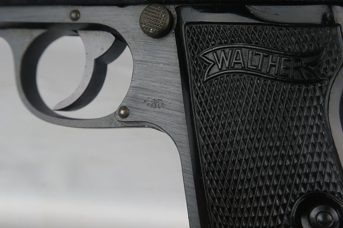 7/28/17 – This is a scarce variation 5 Army Walther PP in excellent original condition.  It is waffen marked on the frame and slide and has the ‘ac’ Walther code on the right slide.  There were only ~2,500 of this variation produced.  Bluing rates at 98% with minor muzzle/edge wear, and a little patina on the straps.  Excellent late war ‘W’ mag.  Good grips but the left panel has a minor crack.  Strong bore with no pitting or corrosion.
