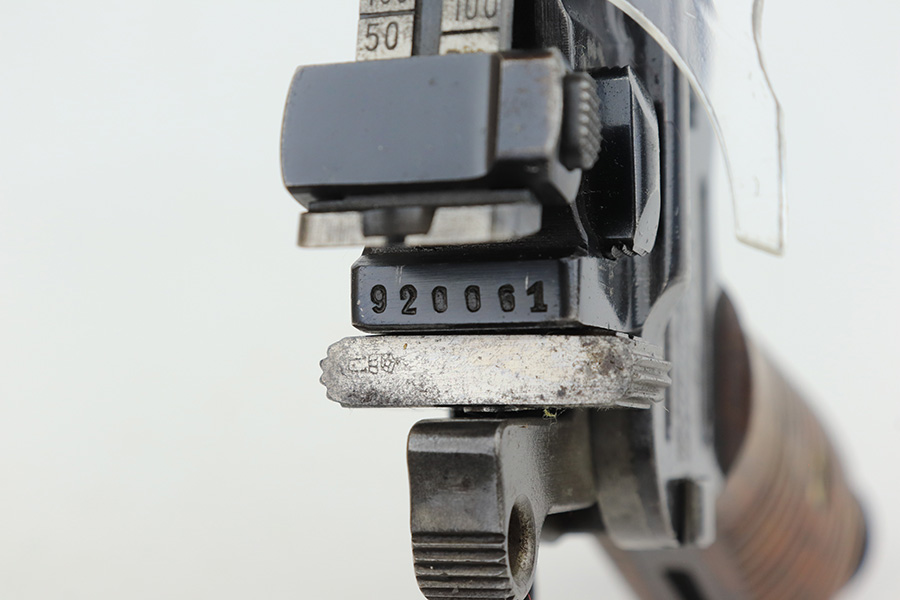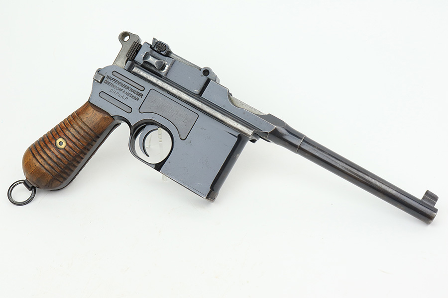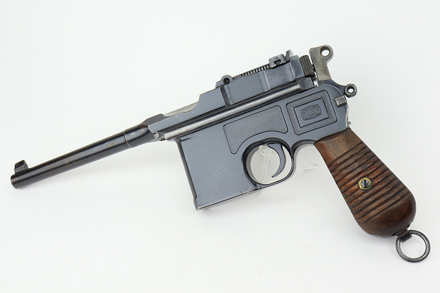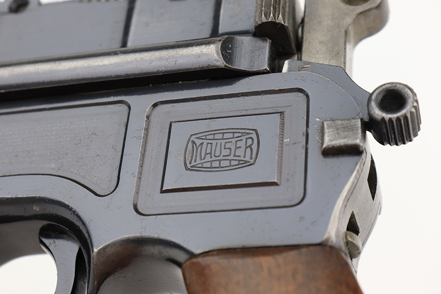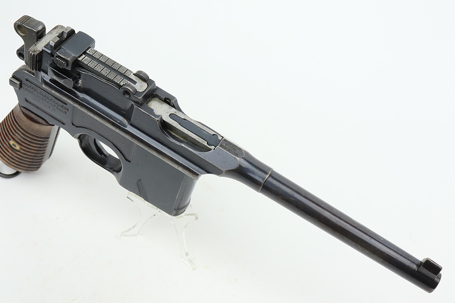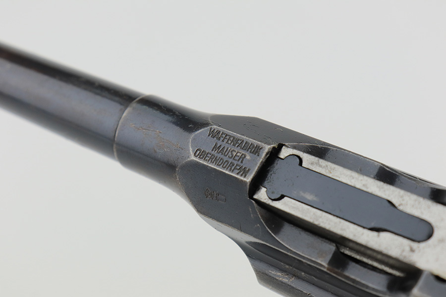 2/27/23 – This is a nice, original example of a commercial Mauser C96 Broomhandle from the late 1930’s. All matching numbers with 85+% of the high-polish commercial blue remaining. The wear on the pistol is in the common high-point areas from rubbing against the inside of the stock – most notably along the rails and front of the magazine well. There are also a few notable scratches on the left side of the barrel. Strong, shiny bore with just a little bit of frecklilng. Excellent, unmarked grips.
