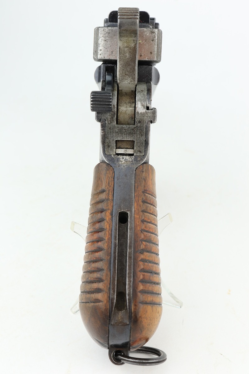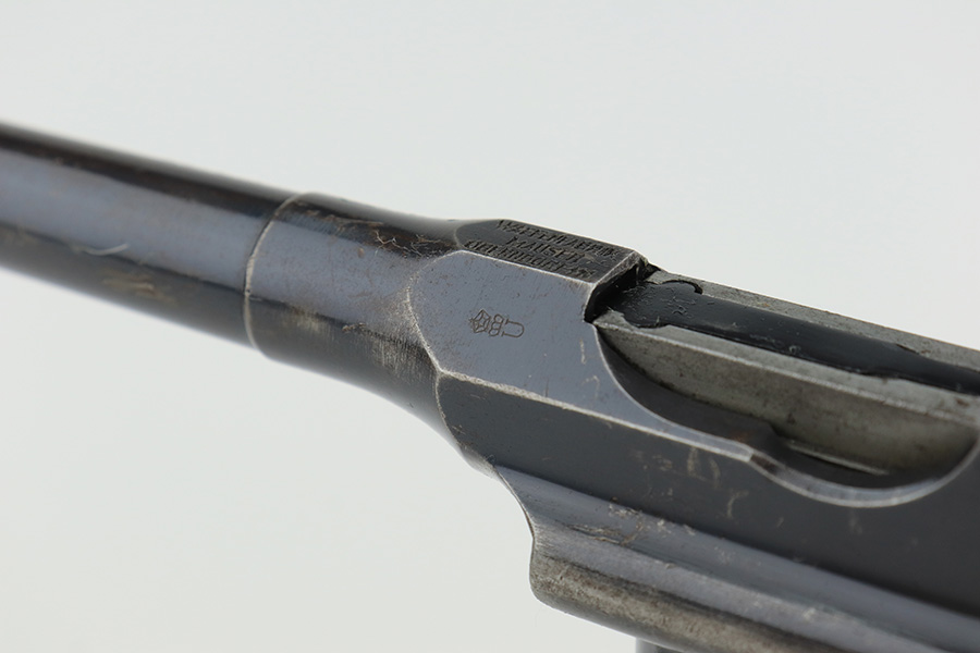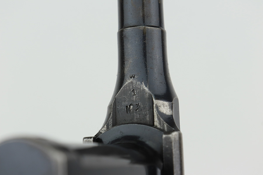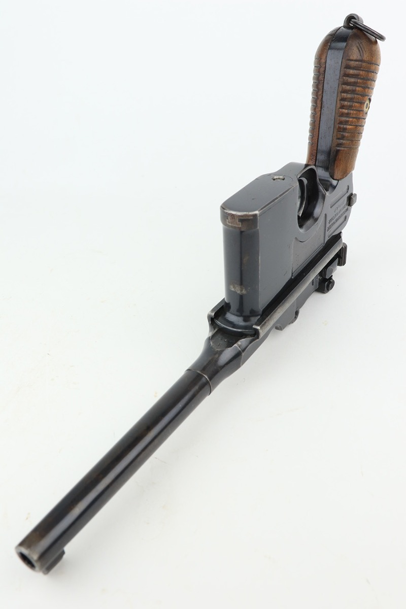 2/27/23 – This is a nice, original example of a commercial Mauser C96 Broomhandle from the late 1930’s. All matching numbers with 85+% of the high-polish commercial blue remaining. The wear on the pistol is in the common high-point areas from rubbing against the inside of the stock – most notably along the rails and front of the magazine well. There are also a few notable scratches on the left side of the barrel. Strong, shiny bore with just a little bit of frecklilng. Excellent, unmarked grips.