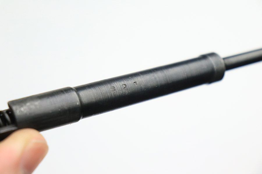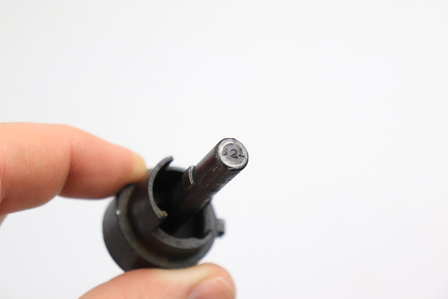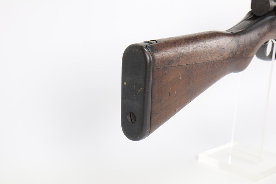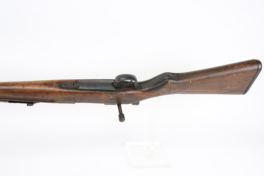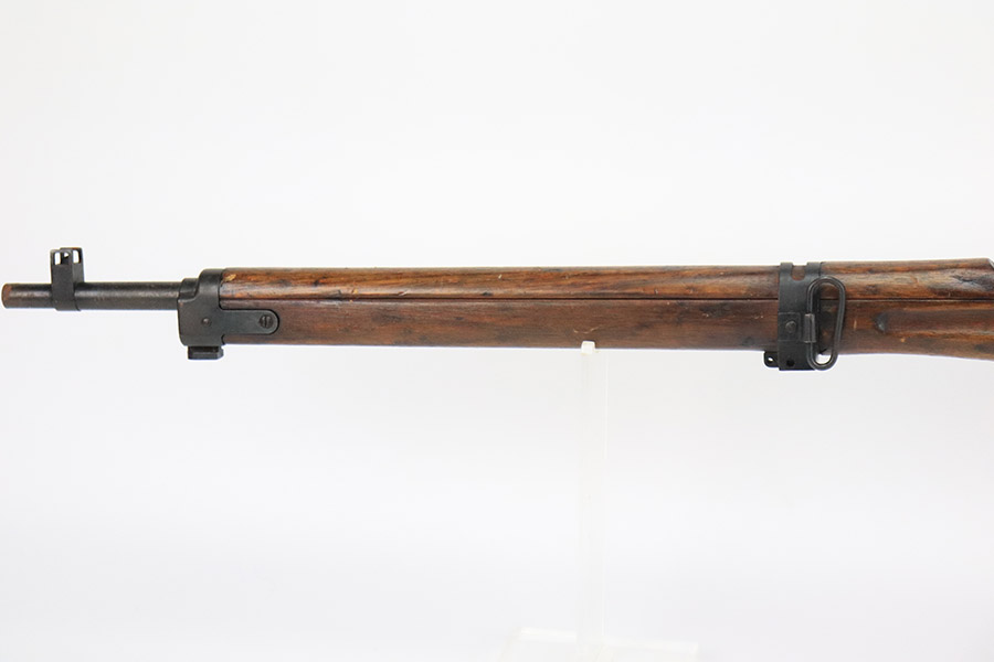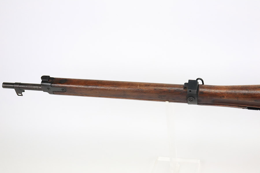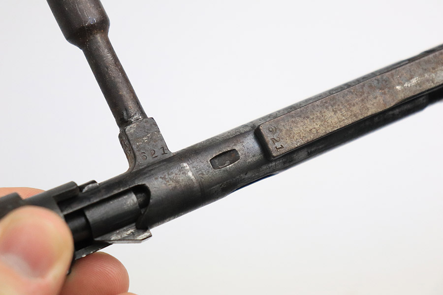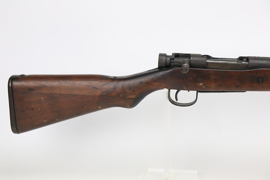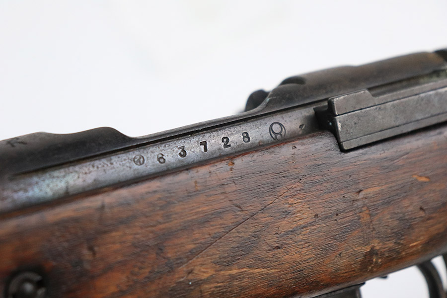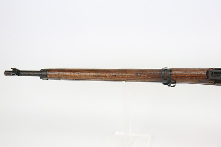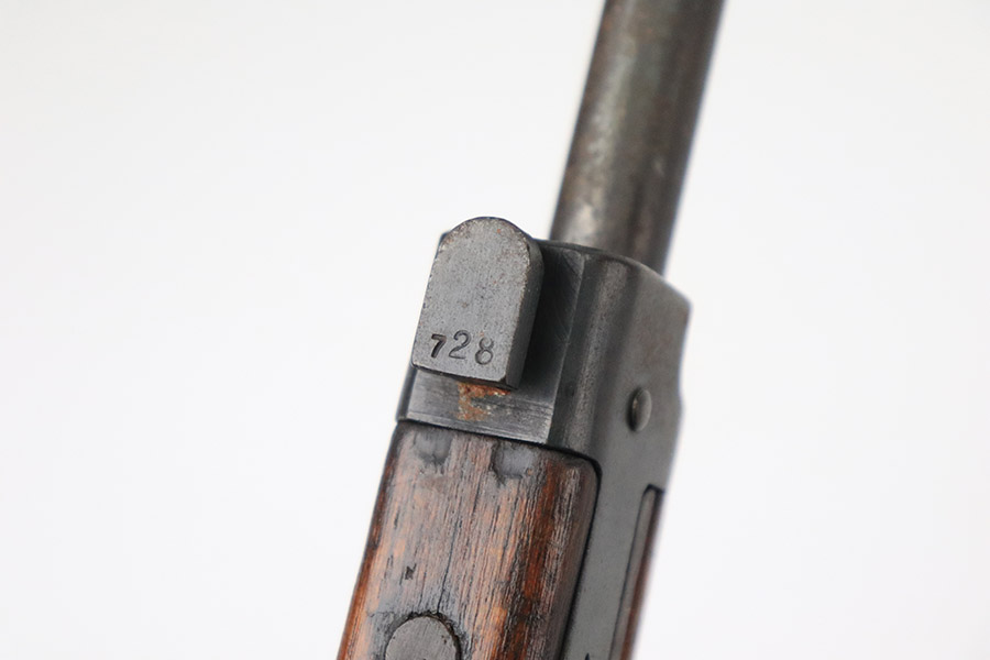 11/18/22 – This is a late-war example of an Arisaka Type 99 rifle issued to the Japanese military during WW2. The bolt is mismatched from the rest of the gun, but it does have a completely intact Imperial mum stamp on the receiver. There is very little actual finish loss on this gun, but there is obvious brown patina and spotty oxidation covering all of the metal parts. There are also areas of pin-pricking here and there and some areas of light surface rust, most noticeable around the muzzle. There is no major damage to the stock, but there are small dings and bruises throughout. A spot of white paint on the left side of the butt stock. The bore is poor – worn rifling with oxidation and minor pitting throughout. No cleaning rod.