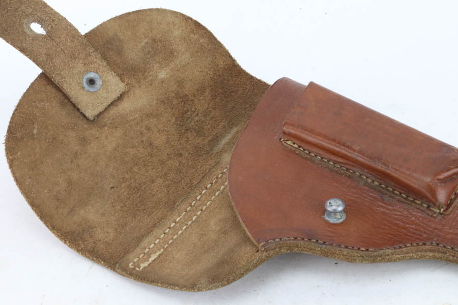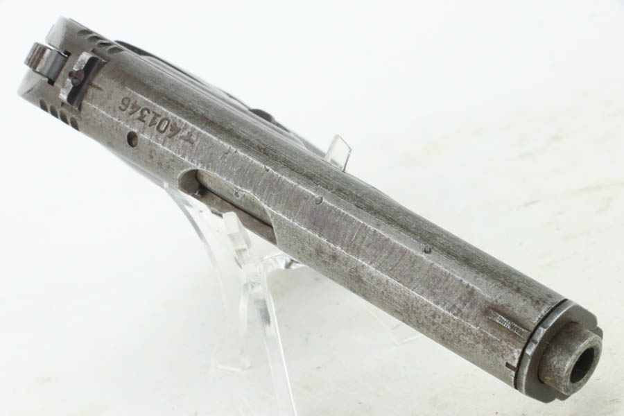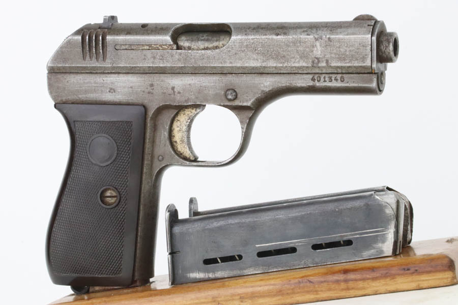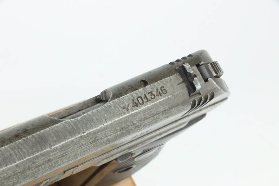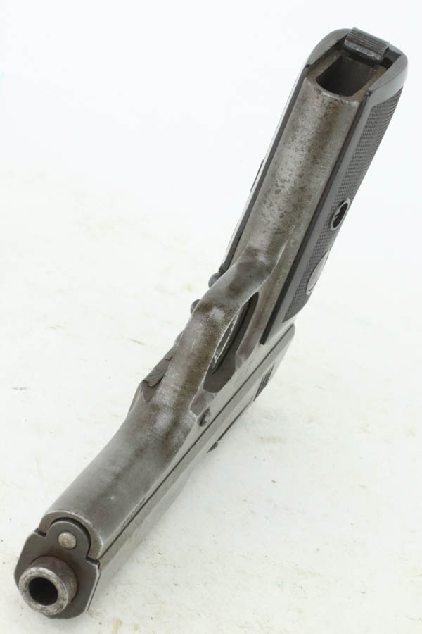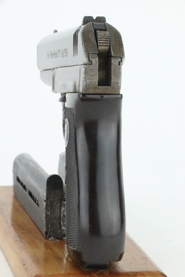 8/1/24 – This is a late-war CZ 27 issued to the Nazi military during WW2. All matching, “Waffen 76” proofed, and has a late-war phosphate finish. It comes as a rig with one proper magazine, an un-marked tan leather holster, and a spare magazine that looks like it actually belongs to an Astra. These phosphate finishes are a bit difficult to rate, but we estimate it has retained roughly 80%. There is obvious thinning and light spotty oxidation throughout. Fitted with a proper late-war bakelite grip – no chips or cracks. Near-mint bore.